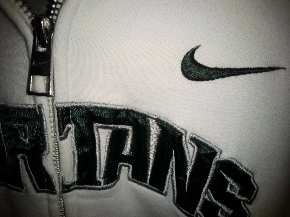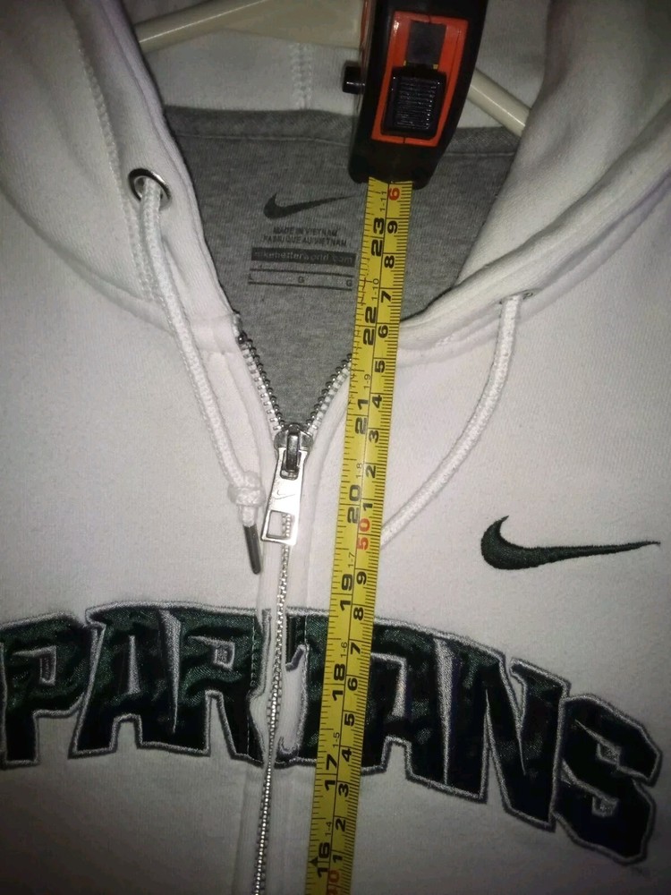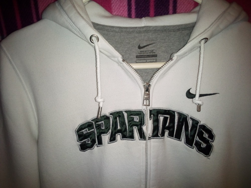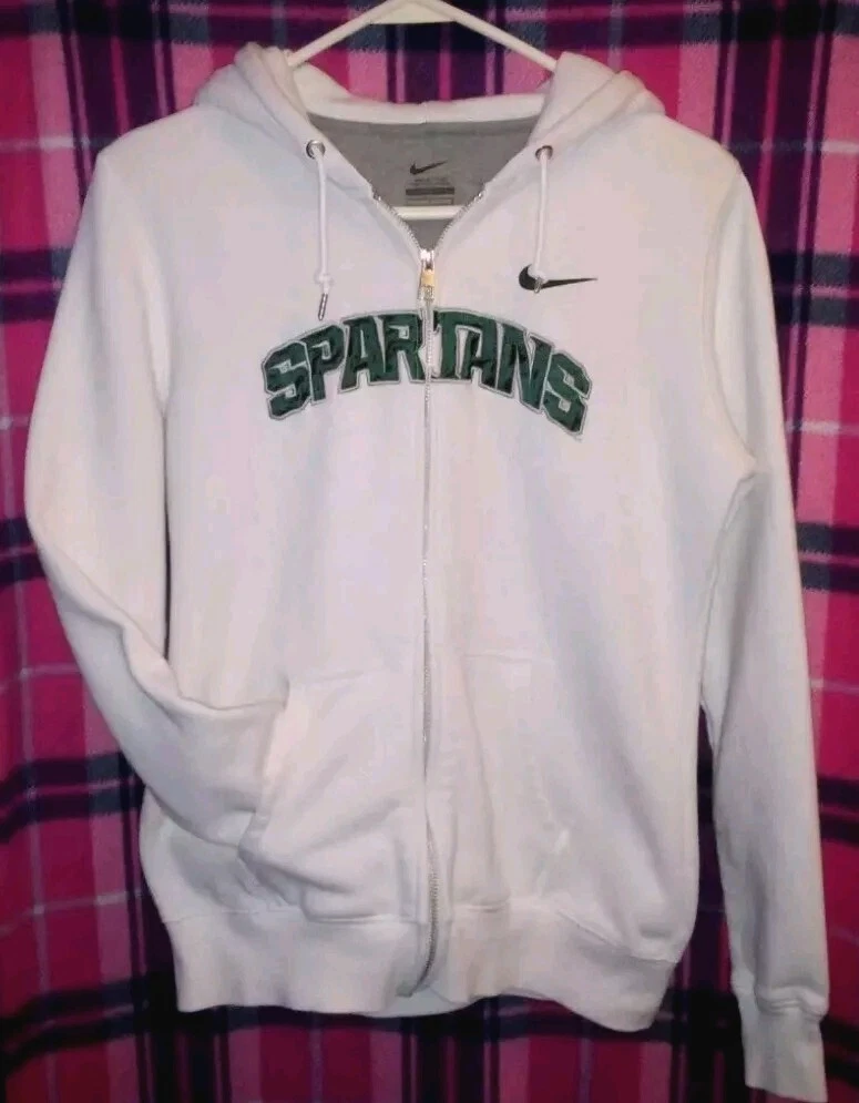 Show off your team spirit with this officially licensed Nike Michigan State Spartans hoodie. The white and green color combination is perfect for game day or everyday wear. The full zip sweatshirt features embroidered details of the team's logo and name, making it a must-have for any fan. Made from high-quality materials, this sweatshirt is perfect for football season and has a capacity of unknown size. It's a great addition to any fan's collection. Get yours today and show everyone that you are a true Michigan State Spartans fan.