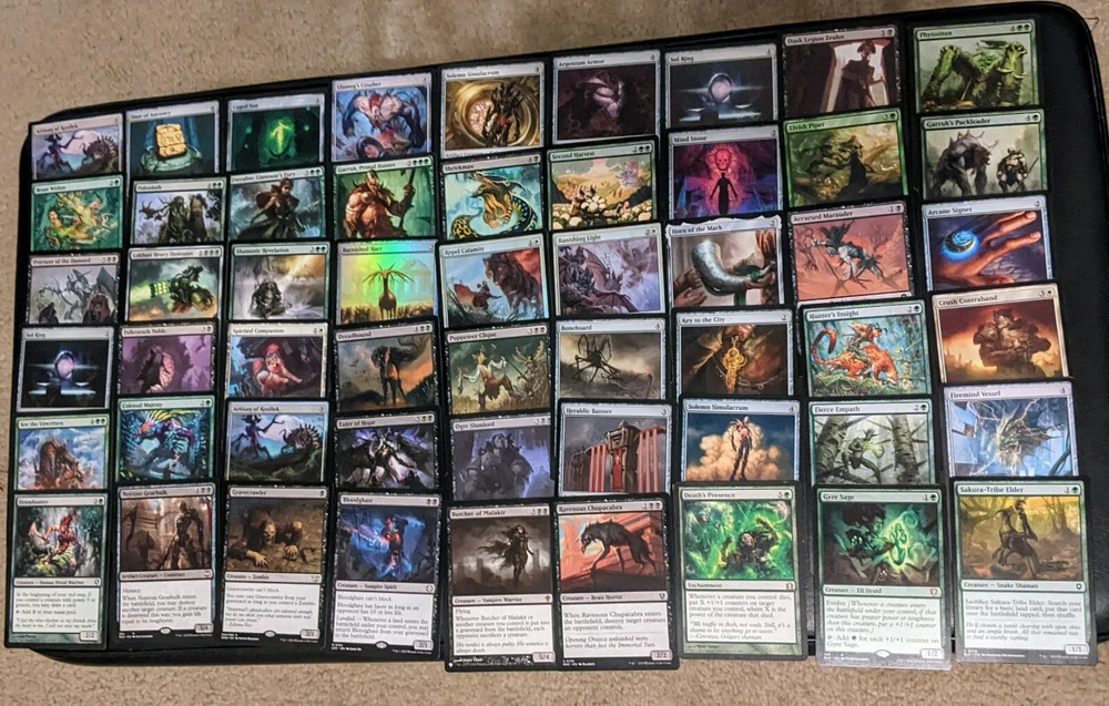 Two near mint 100 card commander decks. The first is a vampire life drain tribal that is the blood rites precon (~$70 base) with some great power upgrades. Play style you pump out vampires that spawn new baddies when they die and can take half your opponents life if any connect. You then gain life equal to damage dealt and vice versa for some fun effects. The second is a goblin krenko tribal that pumps out tokens and powers them up to silly proportions. These two are both a blast and well balanced with each other, my son and I have had tons of back and forth close games with these for a while now. Great set if you're looking for powerful decks that are play tested and well balanced. Last you get 60 bonus cards (most pictured) primarily some valuable Golgari cards I was building decks with. Many cost $5-8 a piece and all pretty powerful and dynamic cards. Happy bidding!