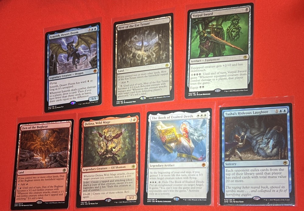 UPC:Does not applyManufacturer:Wizards of the CoastNumber of Cards:7Finish:RegularCard Size:StandardAttribute/MTG:Color:Multi-ColorFeatures:MythicLanguage:EnglishGame:Magic: The Gatheringgtin13:Does not applyCard Type:Legendary ArtifactCharacter:N/ASet:Adventures in the Forgotten Realms