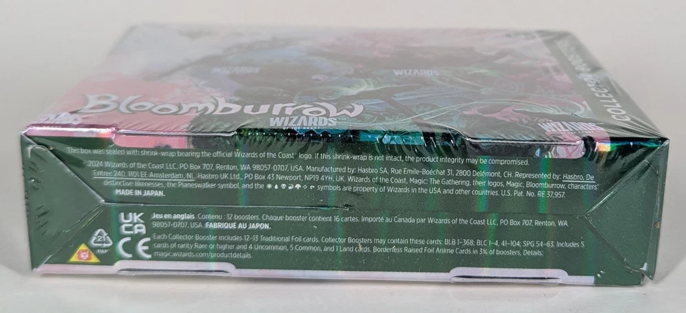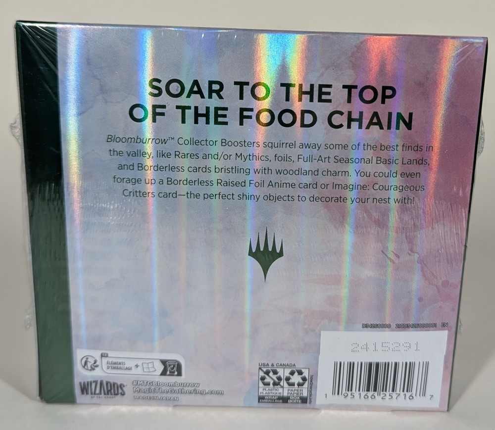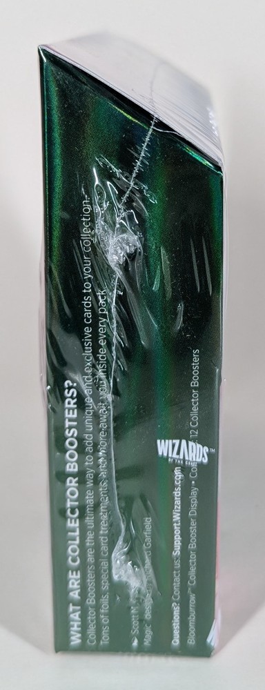 Item : The box pictured is the box you will receive. It is Factory Sealed. Product Description: In Bloomburrow, the Valley is threatened by elemental forces raging out of control, and salvation falls on the shoulders of its smallest protectors. Players will put their best paws forward, fighting alongside mice, frogs, bats, birds, and myriad other critters to restore the balance of peace—and prove bravery comes in all sizes. Collector Boosters are the place for your players to uncover the best finds in the Valley! Known as the shortcut to the coolest cards in the set, each Collector Booster is packed with foils and special treatments that are sure to add flair to any player's collection. Contents : 12 Bloomburrow Collector Boosters; each booster contains: 15 Magic: The Gathering cards 12-13 Traditional Foil cards 5 cards rarity Rare or higher 4 Uncommon cards 5 Common cards 1 Land card Collector Booster-exclusive special treatment in 3% of boosters
