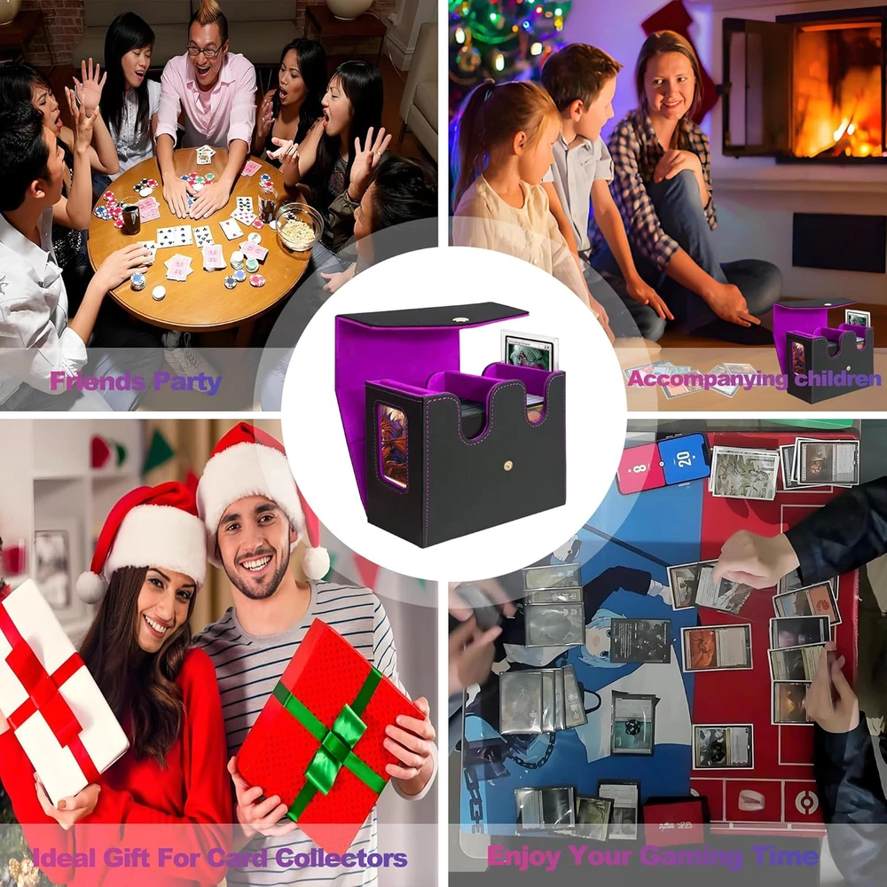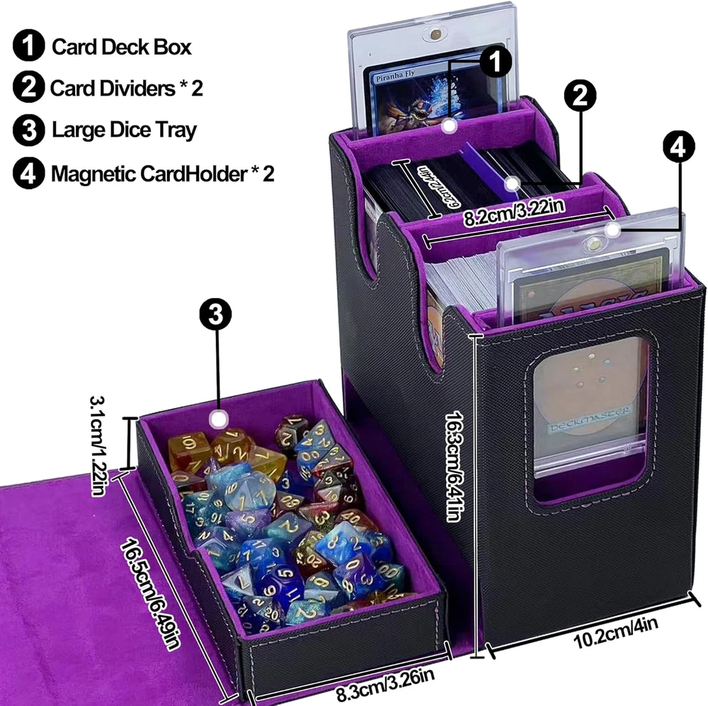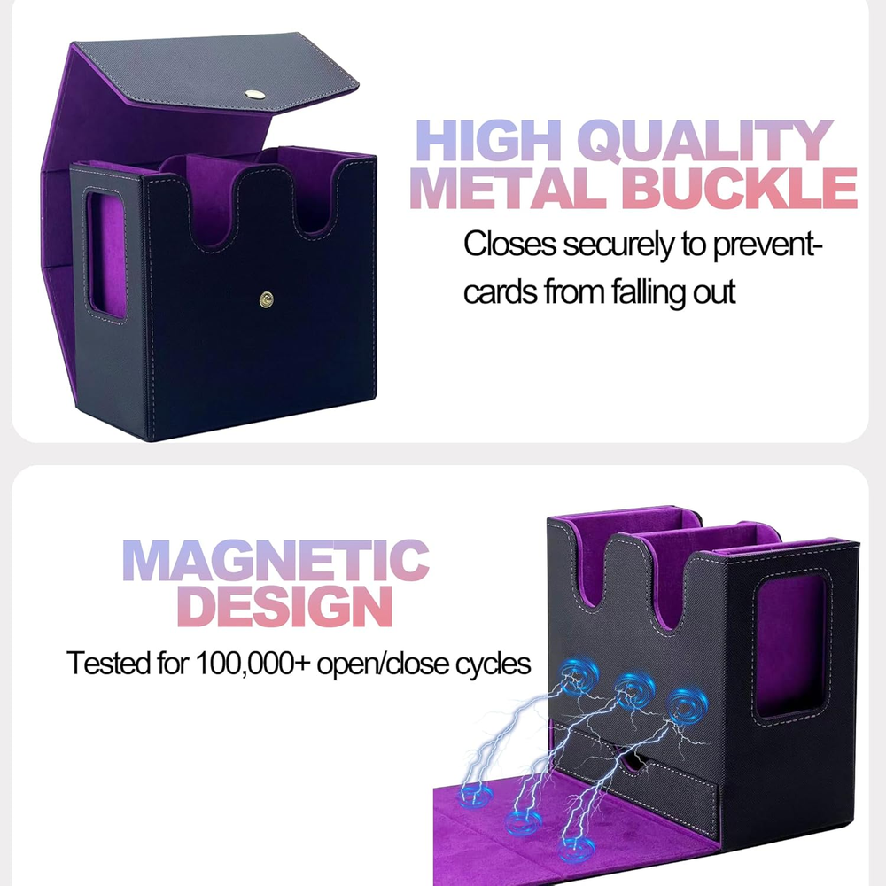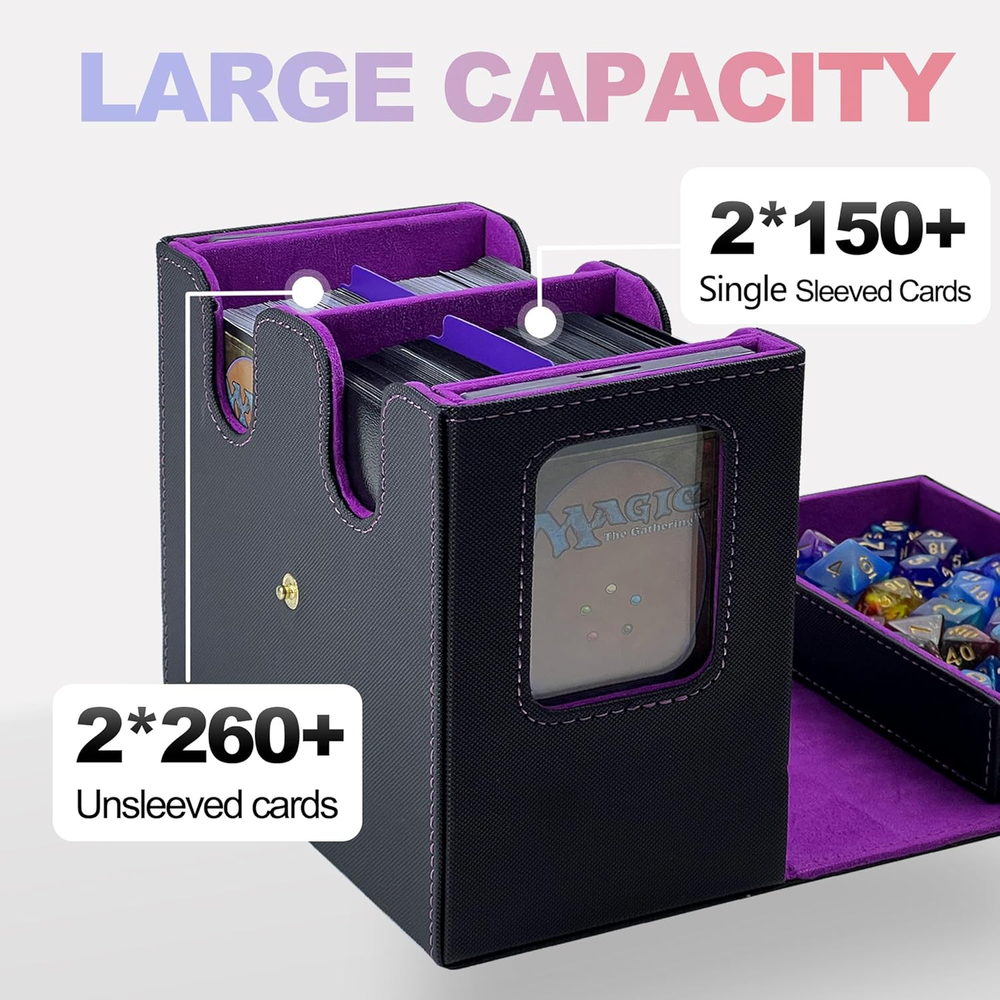 Designed for MTG Commander: This trading card storage box includes 2* 35pt one touch magnetic card holder and 2 card dividers, ideal for showing off rare or commander cards. A must-have commander deck box for TCG, EDH, CCG and serious collectors. Magnetic and Safety Buckle Lock: Made of waterproof PU leather and microfiber lining, this deck box mtg commander offers strong protection. The magnetic closure + button flap keeps your card organizer safe in travel and storage. Generous Storage Capacity: This Commander deck box offers ample space for 520 unsleeved cards or 300 single-sleeved (Penny sleeve) cards, or 200 double-sleeved cards. It also features dual side display windows, letting you show off your rarest cards without sacrificing protection. Note: Top loaders hard card sleeves and 35pt one touch magnetic card holder can also be used, but they have not been specifically measured. You can try them out~(Just place it in an east-west direction) Portable Handle for Travel: The built-in handle makes this MTG card box easy to carry to tournaments, collector events, or local game shops. Functional, stylish, and ideal for all trading card fans Ideal Gift: Whether you're a card collector or know someone who is, this tcg card storage box is the ideal solution for keeping collections neat and organized. A thoughtful g1ft for family, friends, or any card game enthusiast. Product description