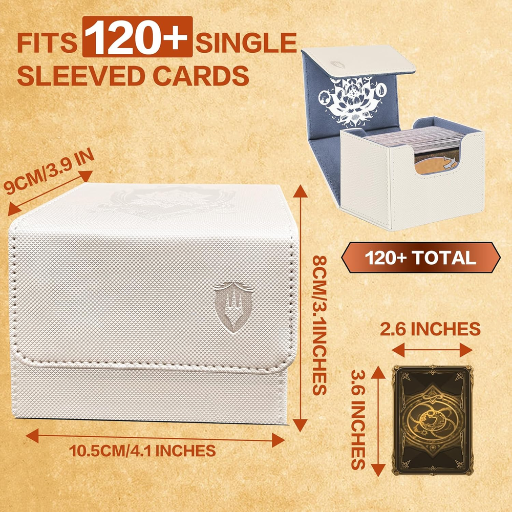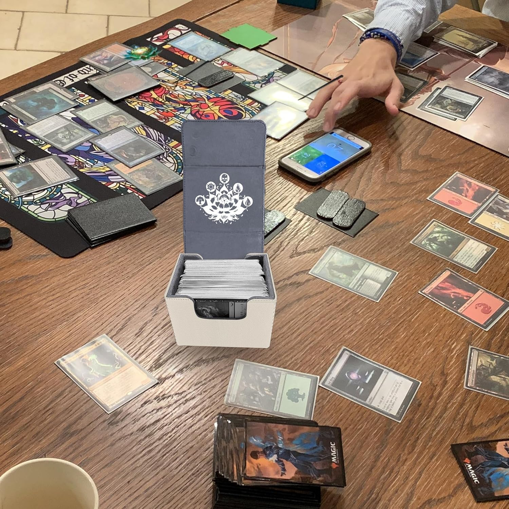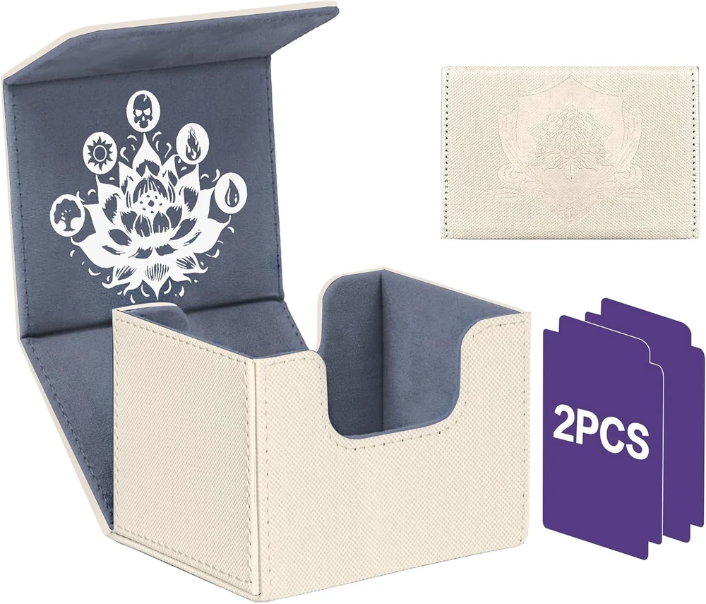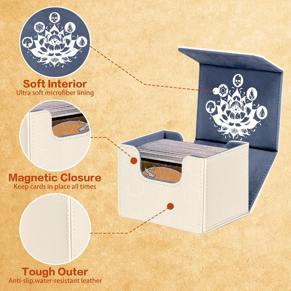 Faux Leather Exquisite Graphic Design: This PROMAXIBINDER MTG commander deck box, inspired by the classic Black Lotus card and combined with the five basic elements of MTG games, has redesigned the cover, to add a touch of personalization and flair. We will be committed to providing players with better designs. Premium Quality & Durable: The PROMAXIBINDER MTG deck box is a double-layer construction with an upgraded plasticized, waterproof PU leather outer layer and a soft, high-grade microfiber inner layer that protects the cards inside the box. This ensures the safety of your valuable MTG cards, protecting them from wear, tear, and environmental factors. Strong Magnet & U-Shaped Design: Precise and tight stitching and 8 powerful magnets ensure that the MTG commander deck box always closes tightly. The double-sided, wide-mouth U-shaped design makes it easy to remove all playing cards at once, even when the MTG deck box is full. The perfect design allows you to place and remove playing cards easily and without any obstruction. High-Cost Performance Storage Capacity: The MTG deck box size - 3.1*3.9*4.1 inches, holds up to 120 standard-size gaming cards with single sleeve or 200 un-sleeved cards. Offers more room for your cards. This deck box is suitable for double-sleeved, KMC inners, Dragon Shield outers, and commander deck perfectly. Also compatible with Magic The Gathering MTG, YuGiOh!, and Cardfight!! Vanguard, Duel Masters, etc, a variety of TCG/CCG/LCG & other collectible cards. What You Get: PROMAXIBINDER service:1-year warranty and 7/24 service for our valued customer as a satisfactory result. If you have any questions, please feel free to contact us at any time. We are more than happy to assist you at any time. Product Description