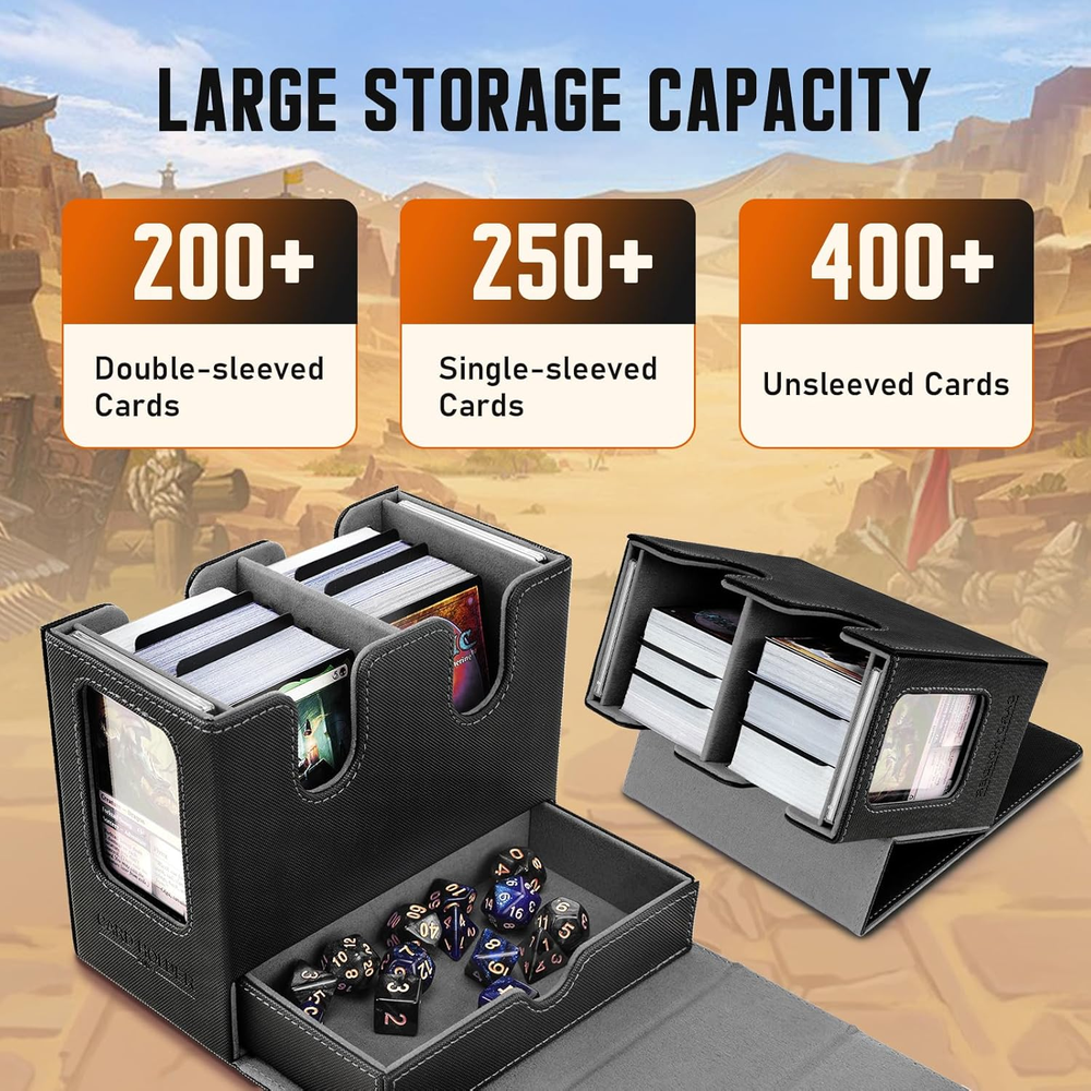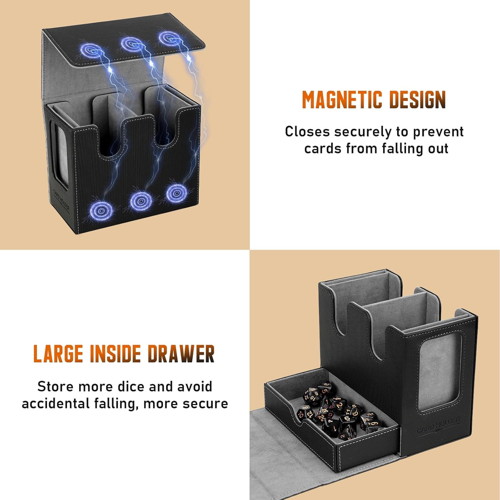 This MTG Deck Box is a game-changer! It holds tons of cards, whether sleeved or unsleeved, and the U-shaped opening makes accessing them mid-game a breeze. Love the hidden dice drawer—keeps everything secure but easy to grab. The commander display window adds a stylish touch, and the whole case feels durable and well-designed. Perfect for keeping your collection organized while looking awesome on the table!