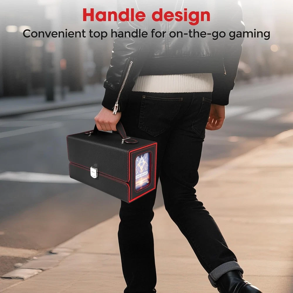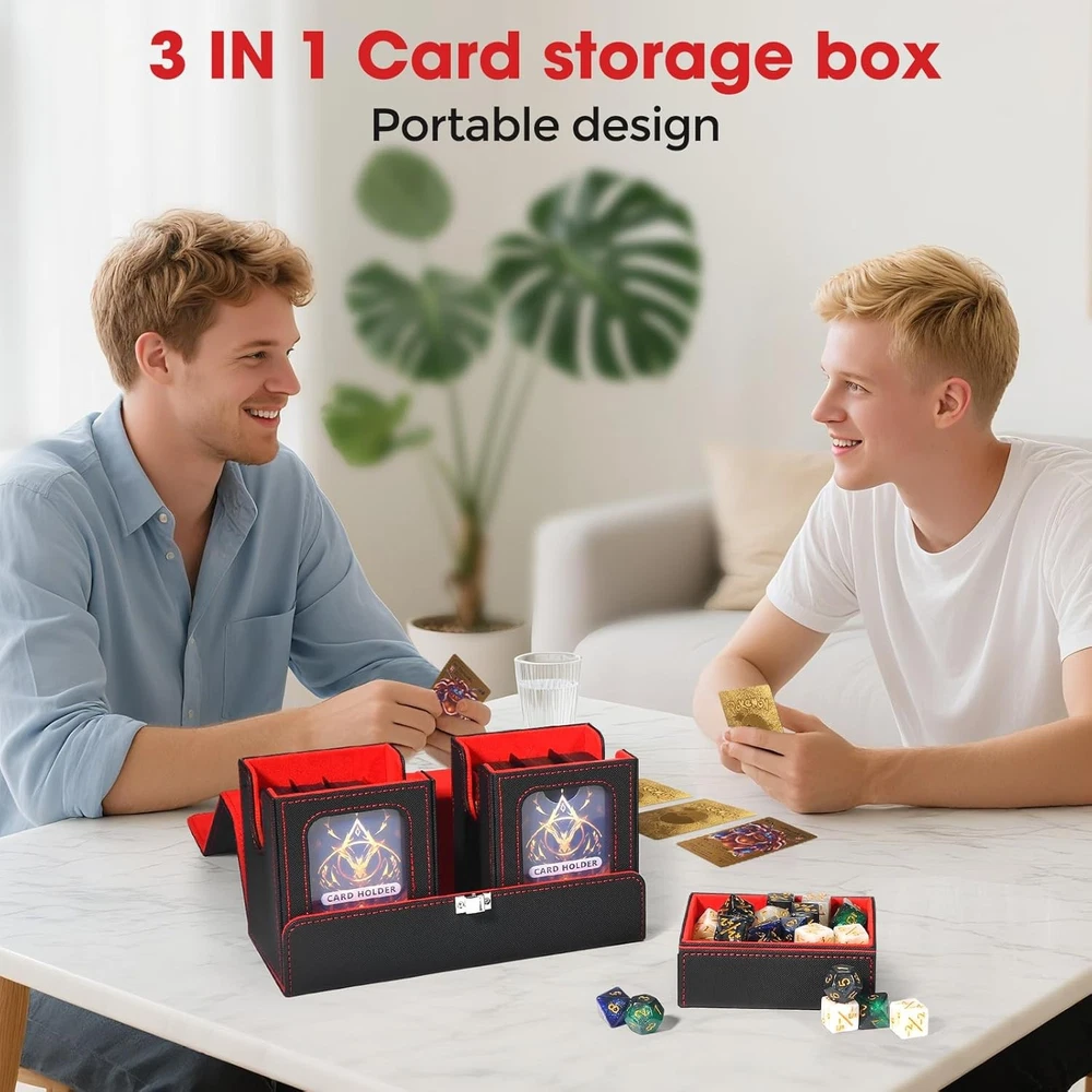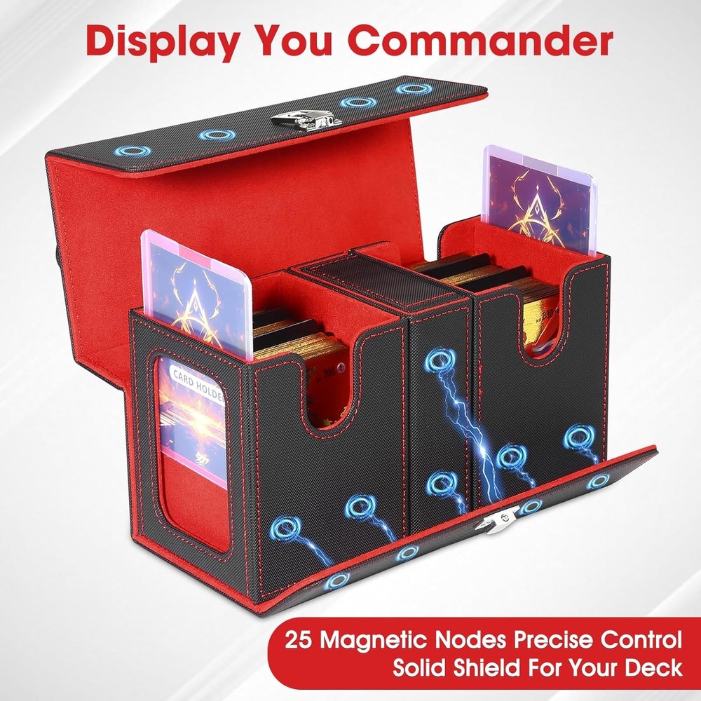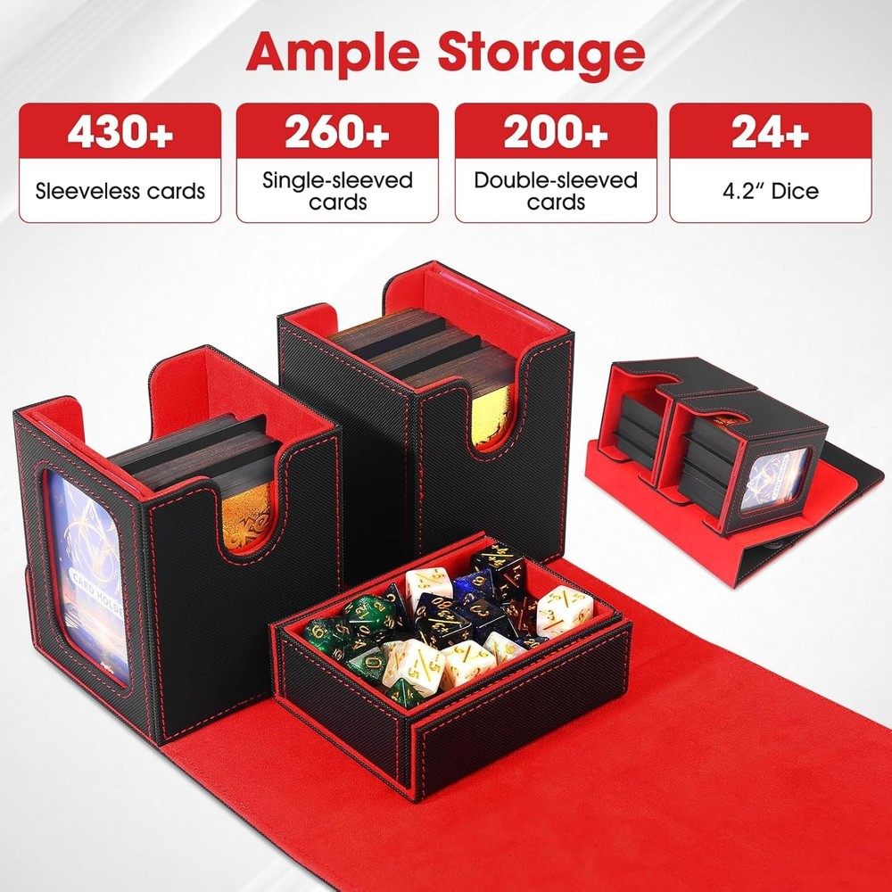Free eBay listing template designed by dewiso.com MTG Deck Box - Commander Deck Box Fits 200+ Double-Sleeved Cards, 3-in-1 Magnetic Card Storage Box with 2 Commander Display & 4Dividers & Dice Tray Fits for TCG CCG Magic Cards (Black & Red) FREE AND FAST SHIPPING! About this item 3-in-1 Card Storage Box - Card Deck Box with Portable Handle & Viewing Windows, commander deck box has 2 individual boxes with windows, you can use 2 included Acrylic card holders to proudly display your favor cards, 1 dice box with removable cover holds small game-related accessories, ready to play Waterproof mtg deck box - Our card deck box is crafted from durable, water-resistant PU leather with wear-resistant flannel inside, quite soft and smooth. This card storage box holds 430 sleevless cards, 260 single-sleeved cards, 200 double-sleeved cards standard-sized cards. its unique U-shaped opening makes you easily take cards during battle. Suitable for most MTG/TCG/PTCG/Sports card Strong Magnetic Drop-Proof Design - The mtg deck box designed strong magnetic closure and an additional reinforced metal clasp, for trading card storage box provides double protection, so that it won't open easily and cards won't fall out, even if you shake it hard, Your precious trading cards are always safe and secure Portable design - This portable card deck box is specially designed for players, mtg deck box with a sturdy leather handle for easy transportation. Whether you're heading to a game night, tournament or card meetups, the detachable magnetic lid saves space and combines style and functionality First choice for card enthusiasts - Whether you're a card collector or know someone who is, the trading card storage box is a good choice for card collectors. With its stylish design and practical features, tcg deck box it’s perfect for birthdays, Halloween, Christmas, or any special occasion choice Our customer service - Our card storage box offer a 24-month after-sales service. If you have any questions after receiving our card collection box, please contact us at any time. We will solve all your problems within 12 hours. We are always here. Wish you a happy life! Product We offer a 30-Day Return Policy on items which you are not completely satisfied with. You have the option for a full-refund or an exchange of the item. No returns are available on items shipped outside of the US . Shipping We offer Free Shipping to the US and ship within 2 business days of payment, usually sooner. We use UPS express shipping. That's why your products are usually delivered within 3 days . Contact We try our very best to make sure every customer is completely satisfied. If there's a problem , message us! We're happy to help. 24/7 live chat available.