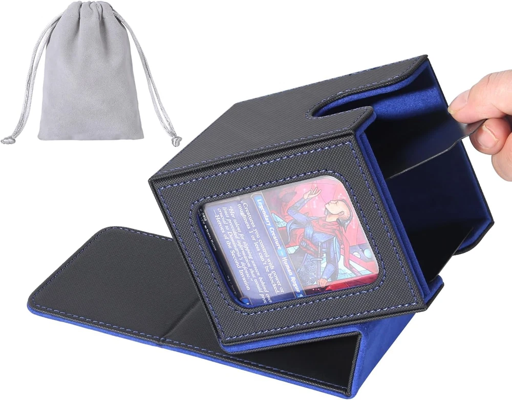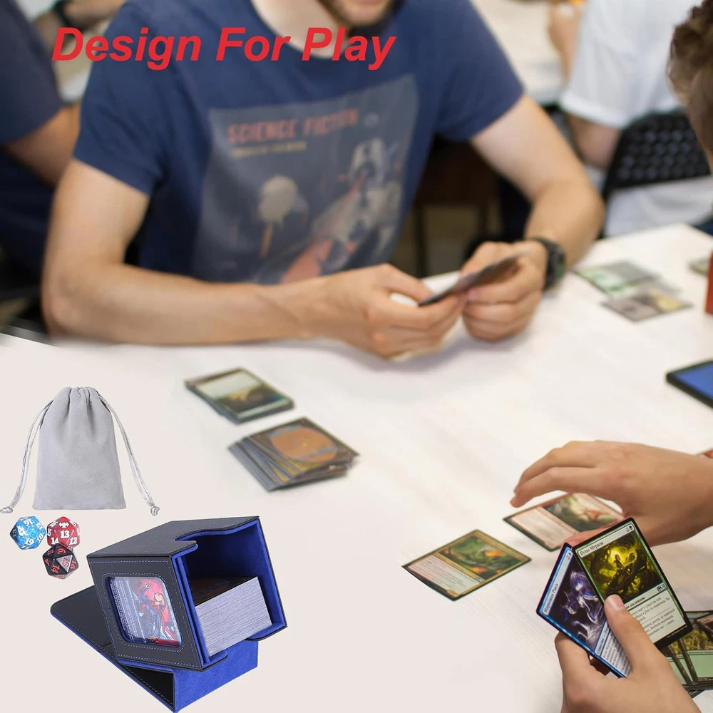 【Tailored for Commander Enthusiasts】Specifically designed for Commander EDH players our innovative design is custom-fitted for your Commander deck. Elevate your EDH and Sorcery decks with our unique deck boxes featuring a side window for your commander or Avatar. 【Ample Storage】Our deck box, measuring 4x3x3 inches inside, easily holds 100 double-sleeved cards and a dozen tokens. The accompanying drawstring bag neatly stores up to 10 D20 polyhedral dice for quick and easy access. Compact, convenient, and designed for effortless one-handed use. 【Powerful protection】Unleash powerful protection with our compact deck box. The durable PU leather shell delivers shockproof resistance, and the soft microfiber interior provides a safe haven, guarding cards from scratches. Multiple magnets ensure a secure closure, guaranteeing safe transport. The added drawstring pocket introduces an extra layer of defense, shielding your dice and cards from potential scratches. 【Effortless Organization】The Commander card slot allows you to effortlessly check the box's contents without opening each one individually. Whether you're into MTG, PTCG, or any other TCG, keeping your collection well-organized has never been easier. 【Bonus Inclusions】Every trading card box includes 2 card dividers, 1 drawstring bag, and 1 top loader ,Weighing just 0.38 LB, it's compact, lightweight, and easily portable – a top-notch choice for card enthusiasts! Product Description Innovative window design The Ultimate Commander Solution Specifically designed for Commander EDH players our innovative design is custom-fitted for your Commander deck. Securely store your Commander card in the included top loader,Showcase your Commander proudly in the dedicated slot. Easy to determine what box has what. The Commander card slot simplifies organization. Check your box's contents without opening each one individually. Whether you're into MTG, PTCG, or any TCG, our design ensures your collection stays well-organized with minimal effort. Ample Storage Storage with Convenience Measuring at 4x3x3 inches,It can comfortably hold up to 100 double-sleeve cards or an impressive 120+ single-sleeve cards. . Powerful Protection: Your cards deserve the best protection. Our deck boxes feature a durable PU leather shell for shockproof resistance, a soft microfiber interior to prevent scratches, and multiple magnets for a secure closure. An additional drawstring pocket adds an extra layer of defense, shielding your dice and cards. Play on the go The dic bag, holds up to 10 D20 polyhedral dice. Convenience is key, with a design that's compact, lightweight, and easily handled with one hand. Desing for Play Welcome to AFIING, where every card finds its perfect sanctuary. Join us in redefining gaming experiences for Commander players who demand excellence. Calling all Commander EDH players! Your quest for the ultimate card box ends here. Introducing our innovative design, tailor-made for enthusiasts like you. Say goodbye to accidental shuffles with our dedicated Commander slot and built-in card holder. But wait, there's more! This versatile deck box doubles as a secure deck holder, ensuring your cards stay intact during gameplay. Tested with various sleeves, it comfortably stores up to 100 double-sleeve cards or over 120 single-sleeve cards. Complete with a convenient dice bag and strong magnets for secure closure, your cards will stay safe on the go. Plus, with UV-protective features, your Commander card will remain pristine. Bid farewell to chaos – our Commander card slot ensures effortless organization, whether you're into MTG, PTCG, or any other TCG. Elevate your Commander experience today with the AFIING Commander Card Deck Box – the ultimate choice for serious players. Order now and keep your cards safe, organized, and battle-ready!