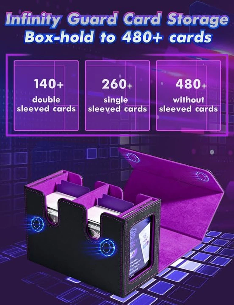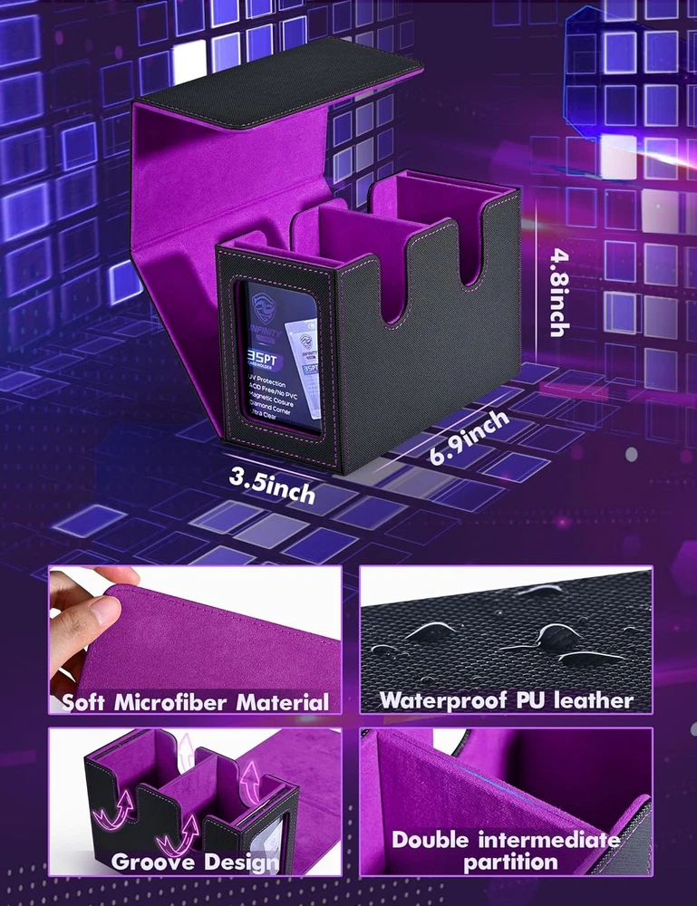 Menu Other Items Feedbacks About Us Contact Us Add To Favorites MTG Deck Box with 2 Commander Display, Double Deck Box for 280+ Single Sleeved Cards, Leather Magnetic Card Storage Box Fits for TCG CCG Magic Cards (Black&Purple) ๐๐จ ๐ง๐๐๐ ๐ญ๐จ ๐ ๐ฎ๐๐ฌ๐ฌ ๐ฐ๐ก๐๐ญ ๐๐๐๐ค ๐ข๐ญ ๐ข๐ฌ๏ผ Crafted with Commander EDH players in mind, our innovative design is tailor-made for your Commander deck. You can showcase your commander through the external display window: Frontline Command! It's also possible to hide your commander and surprise your enemies!!! ๐๐ซ๐๐ฆ๐ข๐ฎ๐ฆ ๐๐ฎ๐๐ฅ๐ข๐ญ๐ฒ๏ผ Featuring a sturdy and durable PU leather shell for shock protection and a soft microfiber interior to safeguard cards from scratches. The U-shaped wide mouth ensures easy card retrieval during gameplay, offering convenience and peace of mind ๐๐ฆ๐ฉ๐ฅ๐ ๐๐๐ฉ๐๐๐ข๐ญ๐ฒ๏ผ Tested with various popular sleeves, the Infinity Guard upgrade commander card deck boasts an impressive capacity, and 480+ sleeveless trading game cards easily. Also suitable for holding 140+ double-sleeved cards or 280+ single-sleeved cards ๐๐ญ๐ฎ๐ซ๐๐ฒ ๐๐ซ๐จ๐ญ๐๐๐ญ๐ข๐จ๐ง๏ผThe trading card storage box has a very strong magnetic closure even if you shake the card case hard it won't open and the trading cards won't fall out. Also, you are easy to access and take out your precious cards when you need them, very humanized and practical.The trading card storage box has a very strong magnetic closure even if you shake the card case hard it won't open and the trading cards won't fall out. Also, you are easy to access and take out your precious cards when you need them, very humanized and practical ๐๐๐๐จ๐ซ๐ญ๐ฅ๐๐ฌ๐ฌ ๐๐ซ๐ ๐๐ง๐ข๐ณ๐๐ญ๐ข๐จ๐ง๏ผ This card display box has a unique design with double-layer partitions inside to ensure that the cards are sorted in an orderly manner and fully protected to avoid confusion and damage. The two included dividers will allow you to divide the cards into different areas, making it easy to sort and organize your card collection Product Description Item Specification Style Arts And Crafts Number of Items 1 Closure Type Magnetic Country of Origin China Batteries Included? No Unit Count 1.0 Count Batteries Required? No Material Faux Leather Item Package Quantity 1 Item Weight 1.12 pounds Material Feature Durable and Shock Resistant Opening Mechanism Lift-Off Lid Special Features Impact Resistant Special Feature Impact Resistant Color Black&Purple Shape Rectangular Recommended Uses For Product For Trading Cards Size 260+ Product Dimensions 6.97"L x 4.84"W x 3.74"H Number Of Pieces 1 Dimensions Shipping Returns Additional Info Product Dimensions: 4.84 "h x 6.97 "h x 3.74 "h. Weight: 1.12 lb Fast shipping is very important for us. Our standard shipping service is FREE. Your order will be shipped within 1-3 business days upon full payment received. Most items are delivered within 3-5 business days, however, please allow 3-10 business days. We are shipping only to USA. We only ship to the confirmed Paypal address. We reserve the right to cancel any order for any reason at any time. We are not responsible for undeliverable addresses. We offer a 30 day return policy from checkout winning date. Your satisfaction is guaranteed! If for any reason you are unhappy with your item, just return it within 30 days for a full refund, minus shipping cost. Please contact us prior to initiating a return so that we can issue you a refund authorization. Items defective upon receipt must be packaged in their retail packaging as if new and returned with a detailed description of the problem. Return shipping fees are not refundable. We reserve the right to decline any returns if the above guidelines are not followed. All of our items, unless otherwise stated, will only run on 120 volts. Please check to make sure your country complies with these specifications. If you have a problem or question regarding your transaction please contact us before leaving any type of feedback. We will work with you to resolve any problem you may have.