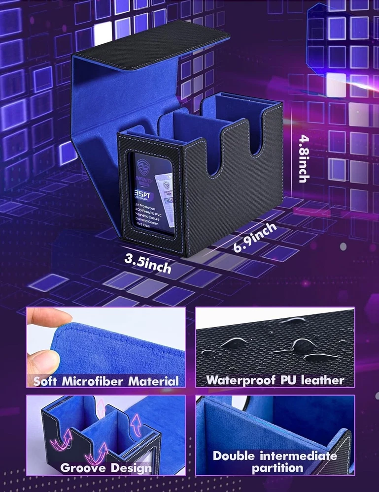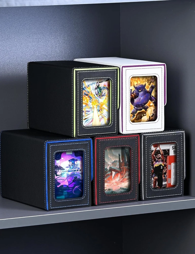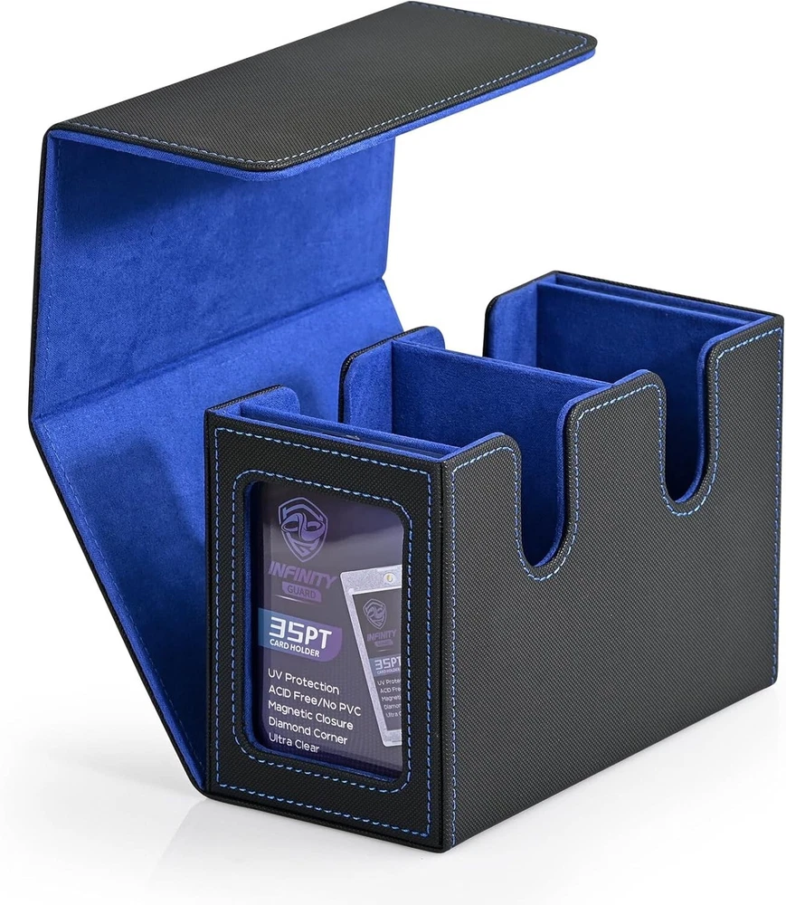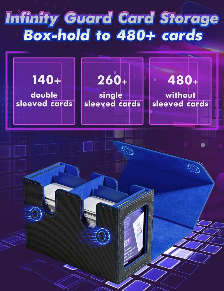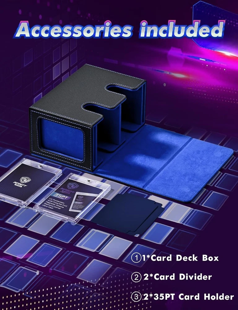 MTG Deck Box with 2 Commander Display, Double Deck Box for 280+ Single Sleeved C No Need to Guess What Deck It Is : Designed with Commander EDH players in mind, this innovative product is tailored for your Commander deck. You can showcase your commander through the external display window: Frontline Command! It's also possible to conceal your commander and surprise your opponents! Premium Quality : Featuring a sturdy and durable PU leather shell for shock protection and a soft microfiber interior to safeguard cards from scratches. The U-shaped wide mouth ensures easy card retrieval during gameplay, offering convenience and peace of mind. Ample Capacity : Tested with various popular sleeves, this upgraded commander card deck box boasts an impressive capacity, holding 480+ unsleeved trading game cards with ease. It’s also suitable for storing 140+ double-sleeved cards or 280+ single-sleeved cards. Sturdy Protection : The trading card storage box features a strong magnetic closure, ensuring it stays securely shut even when shaken. Your cards will remain safe and won’t fall out. Additionally, accessing and retrieving your cards is effortless, making it both practical and user-friendly. Effortless Organization : This card display box includes a unique double-layer partition design to keep your cards sorted and fully protected, preventing confusion and damage. The two included dividers allow you to separate your cards into different sections, making it easy to organize and manage your collection.