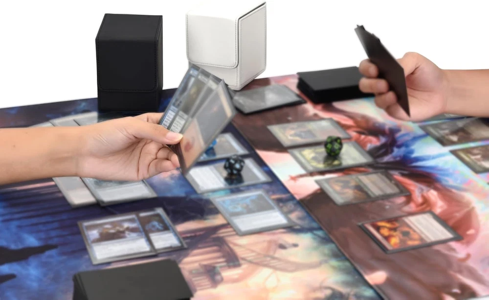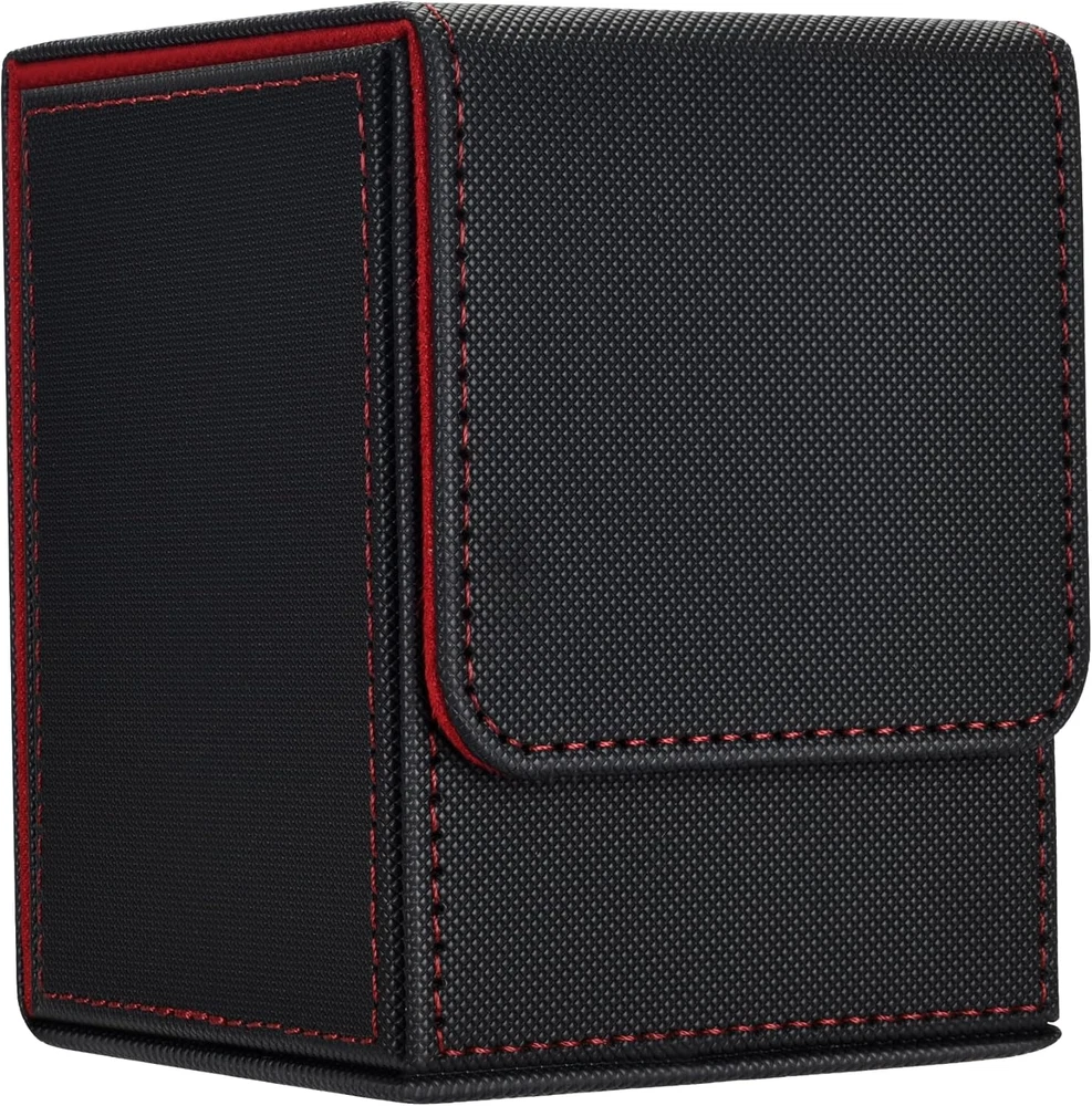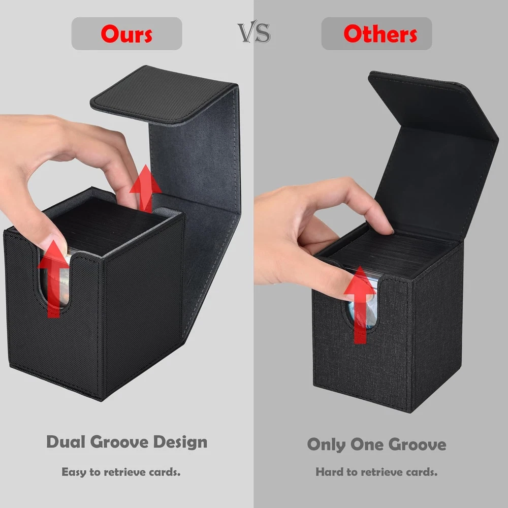 Ample Capacity: The MTG Commander Deck Box has exterior dimensions of 4 x 3.4 x 3 inches and interior dimensions of 3.74 x 2.75 x 2.63 inches; hold 80+ double-sleeved or 130+ single-sleeved cards, not compatible with top loaders Easy Card Access: The front and rear grooves of the Magic Deck Box make it easy to take out and retrieve cards; it also includes two card dividers to help efficiently organize and sort your collection Secure Magnetic Closure: The TCG Deck Box is equipped with 6 pairs of strong magnetic clasps, ensuring that cards do not shift during transport and use; it keeps the box securely closed even when inverted Dual Protection: The MTG card box Made with durable PU leather and soft microfiber lining, effectively protecting your cards even without sleeves and preventing damage Wide Compatibility: Our MTG deck boxes are suitable for various TCG, CCG, LCG and other collectible cards. They are compatible with MTG, YuGiOh, PTCG, OPCG and more, helping you manage and display your collection with ease Product Description 1 Easy to Retrieve 2 6 Powerful Magnets 3 Durable & Sturdy MTG Deck Box Add to Cart Add to Cart Add to Cart Add to Cart Add to Cart Add to Cart Customer Reviews 4.8 out of 5 stars 58 4.8 out of 5 stars 74 4.8 out of 5 stars 74 4.8 out of 5 stars 74 4.8 out of 5 stars 74 4.8 out of 5 stars 74 4.8 out of 5 stars 74 Price $9.99 $ 9 . 99 — $12.99 $ 12 . 99 $14.99 $ 14 . 99 $14.99 $ 14 . 99 $12.99 $ 12 . 99 $12.99 $ 12 . 99 Card Insertion Direction Horizontal Vertical Vertical Vertical Vertical Vertical Vertical Large Capacity 100+ Double-Sleeved Cards 100+ Double-Sleeved Cards 100+ Double-Sleeved Cards 100+ Double-Sleeved Cards 100+ Double-Sleeved Cards 100+ Double-Sleeved Cards 100+ Double-Sleeved Cards Copyrighted Pattern / Mana Lotus Black-green Dual-color White-blue Dual-color Elf Dragon Material Durable Leather Durable Leather Durable Leather Durable Leather Durable Leather Durable Leather Durable Leather Powerful Magnetic Seal ✔ ✔ ✔ ✔ ✔ ✔ ✔ Cutouts on Both Sides ✔ ✔ ✔ ✔ ✔ ✔ ✔ Come with 2 Dividers ✔ ✔ ✔ ✔ ✔ ✔ ✔