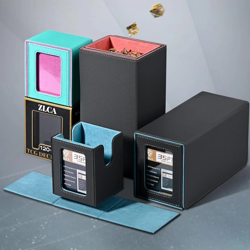 Patented Design:The display window on the lid adds a stylish touch to the deck box while allowing you to showcase your favorite card or artwork;This feature is especially appealing for collectors who want to display their prized cards(You can easily view the contents of the box without having to open) Durable Construction:Constructed from premium PU leather materials, ZLCA MTG Deck Box offers durability and protection for your cards;The robust design ensures that your cards remain safe during transport and storage, minimizing the risk of damage or wear Ample Storage:With a capacity to hold up to 230+ unsleeved cards, 120+ single-sleeved cards, or 100+ double-sleeved cards;The compact size and lightweight construction make it convenient to carry around, whether you're heading to a tournament or gaming night with friends Bonues Items Included:To better protect your commander character card, we provide you with a 35PT top loaders for cards, and two additional dividers are included to help you classify your cards more effectively Keep your cards neatly organized Compatibility with Various Games:While designed with TCG Commander decks in mind, this deck box proves to be versatile enough to accommodate cards for Shadowverse Evolve/PTCG/CCG/EDH/Sports cards Product Description ππΏπΆπ΄ πΆπ΄π π· π·πΈπΆπΎ π΅ππ Add to Cart Add to Cart Add to Cart Add to Cart Customer Reviews 4.9 out of 5 stars 241 4.7 out of 5 stars 287 4.7 out of 5 stars 455 4.7 out of 5 stars 455 4.7 out of 5 stars 669 β 4.7 out of 5 stars 11 Price $13.49 $ 13 . 49 $24.99 $ 24 . 99 $11.04 $ 11 . 04 $19.99 $ 19 . 99 $9.99 $ 9 . 99 β $99.99 $ 99 . 99 π΄ππππ π πππππ Divider * 2/ toploader * 1 35pt Magnetic Card Holder *1 Divider * 10/ toploader * 1 Divider * 10 Divider * 2 Divider * 2 Playmate * 1 πππ§π 3.9*3.2*4.3 inch 8.8*3.9*4.8 inch 11.3*3.7*4.3 inch 11.3*9.4*4.1 inch 4.1*3.5*3.1 inch 3.2*3.1*4.1 inch 16.2*7.6*3.6 inch πππππ£ππ πΆππππ 120+ 300+ 600+ 1800+ 120+ 100+ 1200+ πΉππ‘ πππ sleeved cards/ toploader sleeved cards/card holders sleeved cards/ toploader sleeved cards only sleeved cards only sleeved cards only sleeved cards/ small deck box π·πππ ππππ¦ β β β β β β β
