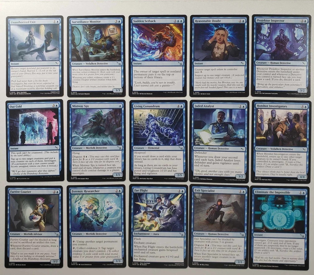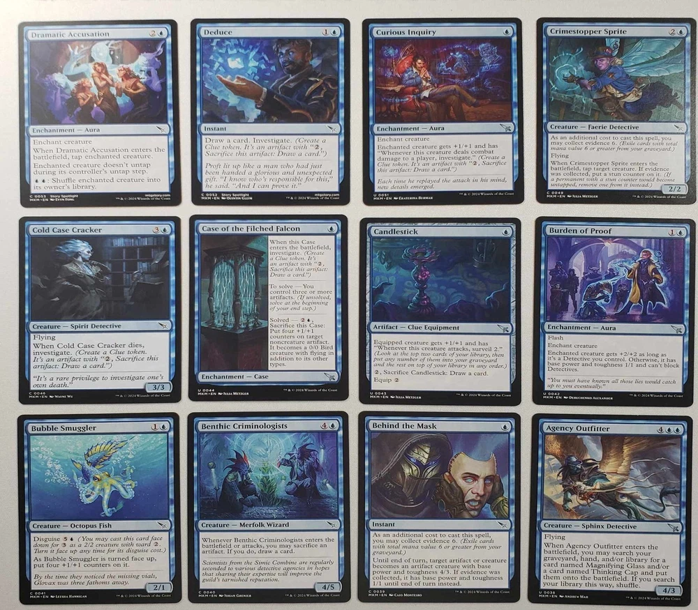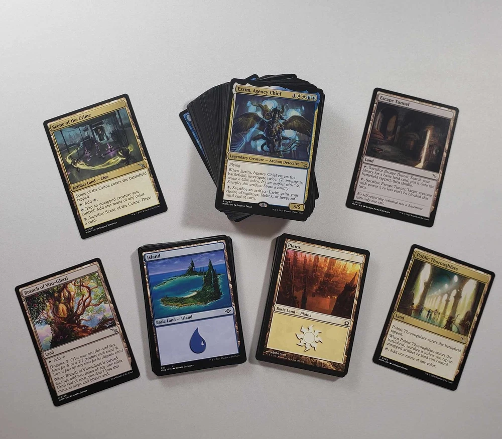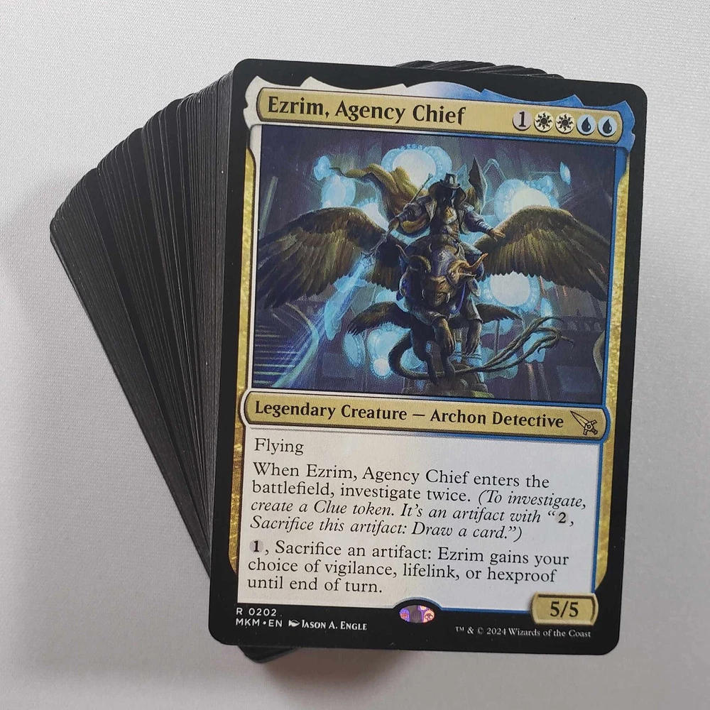 Magic the Gathering Commander Deck MKM Murders at Karlov Manor Edition Ezrim, Agency Chief (Blue & White) Each Commander deck is complete. It contains 100 cards and is legal for play at a sanctioned Magic the Gathering Commander event. Note that the version (Foil, Showcase, Extended Art, etc) of some cards you receive may vary from the ones pictured, but every version included is tournament legal. These decks are not legal in other formats; only Commander. UNRAVEL THE MYSTERY In a city that needs investigating, you’re the one on the job. Find out who committed the murders at Karlov Manor … before you become their next victim. Designed with brand new cards from the Murders at Karlov manor expansion set, this ready-to-play Commander deck showcases the detective noir theme of the set. MKM is a murder mystery; employ detectives, uncover clues, collect evidence, and solve the case! Special Offers are automatically applied to all items you add to your shopping cart from the BobmanMTG Store. View your shopping cart before checking out to see your savings. Deck List Commander (1) 1x Ezrim, Agency Chief Creature (36) 1x Absolving Lammasu 1x Agency Outfitter 1x Benthic Criminologists 1x Bubble Smuggler 1x Case File Auditor 1x Cold Case Cracker 1x Crimestopper Sprite 1x Defenestrated Phantom 1x Essence of Antiquity 1x Exit Specialist 1x Forensic Researcher 1x Forum Familiar 1x Furtive Courier 1x Granite Witness 1x Gravestone Strider 1x Griffnaut Tracker 1x Haazda Vigilante 1x Hotshot Investigators 1x Inside Source 1x Jaded Analyst 1x Karlov Watchdog 1x Living Conundrum 1x Lumbering Laundry 1x Magnetic Snuffler 1x Marketwatch Phantom 1x Mistway Spy 1x Museum Nightwatch 1x Neighborhood Guardian 1x Novice Inspector 1x Perimeter Enforcer 1x Private Eye 1x Projektor Inspector 1x Sanctuary Wall 1x Sanitation Automaton 1x Seasoned Consultant 1x Surveillance Monitor Instant (13) 1x Auspicious Arrival 1x Behind the Mask 1x Deduce 1x Eliminate the Impossible 1x Make Your Move 1x No More Lies 1x Not on My Watch 1x Officious Interrogation 1x On the Job 1x Out Cold 1x Reasonable Doubt 1x Sudden Setback 1x Unauthorized Exit Enchantment (10) 1x Burden of Proof 1x Case of the Filched Falcon 1x Case of the Gateway Express 1x Case of the Pilfered Proof 1x Curious Inquiry 1x Dramatic Accusation 1x Due Diligence 1x Fae Flight 1x Lost in the Maze 1x Makeshift Binding Land (34) 1x Branch of Vitu-Ghazi 1x Escape Tunnel 15x Island 15x Plains 1x Public Thoroughfare 1x Scene of the Crime Artifact (5) 1x Candlestick 1x Krovod Haunch 1x Magnifying Glass 1x Thinking Cap 1x Wrench Sorcery (1) 1x Call a Surprise Witness
