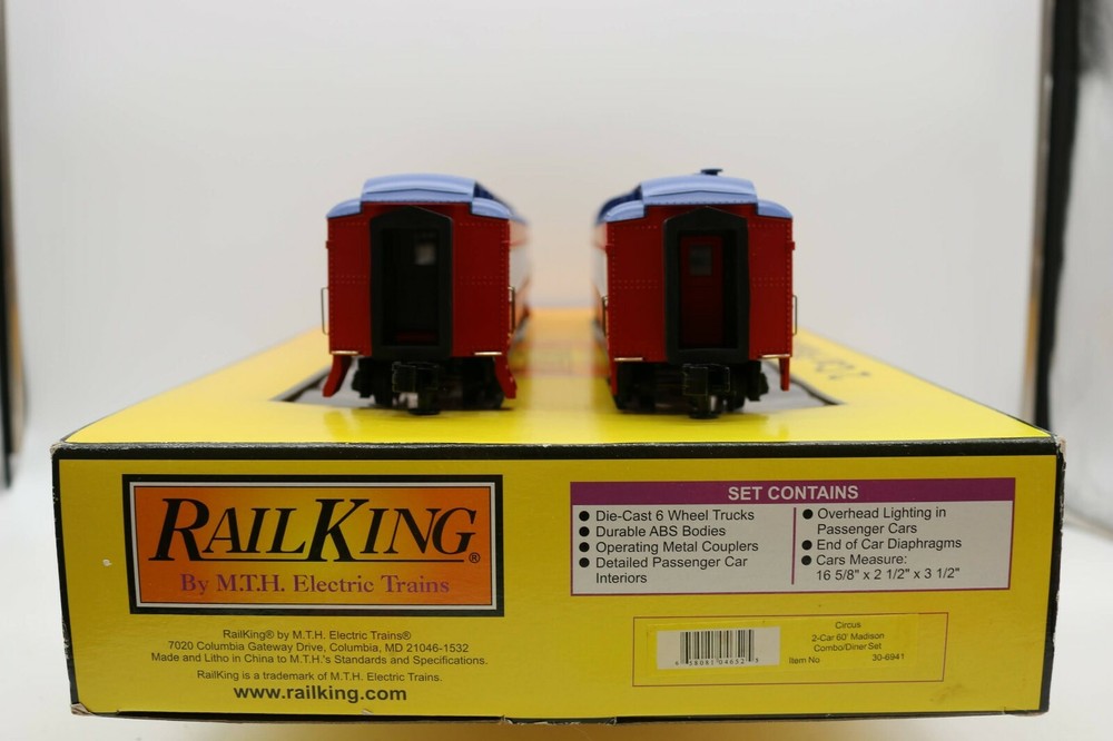 MTH 30-6941 RailKing O/O-27 Circus Madison Combo/Diner Set (Set of 2) EX PLEASE see photos for detailed condition!! There may be pieces that are missing or broken including, but not limited too, couplers, brake wheels, steps, ladders, railings, etc. May need detailed cleaning. PLEASE LOOK AT THE PHOTOS CAREFULLY BEFORE PURCHASING!! If you are purchasing more than one item from us and would like combined shipping, PLEASE request an adjusted invoice from us while still in the cart and BEFORE paying. eBay does not usually calculate combined shipping accurately and you might get overcharged. Please be aware that when we photograph items, we use lighting that will show the details well. Although we try to present the product as accurately as possible, the lighting may affect the overall look of the item by appearing lighter/darker or possibly a different hue than the actual item. Depending on the type of lighting you have in your home, there may be some differences between the photos and the actual item. If this is a concern of yours, please feel free to request additional photos made in natural lighting or ask for a more detailed description of the item PRIOR TO PURCHASE! PLEASE NOTE: We greatly appreciate your interest in our item for sale. We look forward to a pleasant, quick and satisfying transaction for everybody, so please note the following information before bidding. Thank you! ITEM DESCRIPTIONS: * We will try to describe items well and provide plenty of photos. Please review these carefully before bidding or purchasing. * Only the items pictured and described are what you will receive when purchased. * We will occasionally offer an item clearly marked "AS-IS". This means that we are not sure if it works because we are unable to test it for whatever reason. We will offer these at a discounted price than a similar "working" item. It is possible that these items will work fine, but it also is possible that these items are more useful for their parts. Please only bid on or purchase these items if you are well aware of this, as we will only provide refunds of actual item price (no shipping cost refunds) for these items. * If you have any questions that aren't addressed by the descriptions or photos, please feel free to ask before you bid. SHIPPING: * We usually do not offer shipping to international addresses, but ARE WILLING TO TAKE CONSIDERATIONS. * We try to pack items as carefully as possible, but damage may occur during shipping. If you receive an item that was damaged in shipping, please contact us and we will work with you to resolve the problem. * We will combine shipping costs for all items the same buyer purchases from us within 2 days. Please wait to pay for items until you're done shopping with us. Please contact us if you're expecting to buy more items from us, or to have us adjust the shipping costs. * We will usually ship items out within 24 hours of payment being received Sunday through Friday at noon. We will notify the buyer if there will be a delay in shipping for some reason. Please allow additional time for holidays and weekends when the post office is closed. If payment is received after noon (EST) on Friday, the item might not be shipped until the following Monday. * We do try to recycle shipping materials as much as possible. RETURNS: We abide by eBay's Money Back Guarantee. We definitely want our customers to be happy with their purchase! You may return an item within 30 days of receiving it with the following guidelines: * If the item is defective or damaged (unless we clearly marked the listing "AS-IS"), the buyer will receive a full refund after the buyer returns it and it is received by us. Customers who falsely claim their item is defective, damaged, or not as described in order to receive a full refund and free return shipping will be permanently blocked from making future purchases from us. * If the item is as described (including "AS-IS" items) and the buyer decides for any other reason than defective/damaged to return it, only the actual price of the item will be refunded once it has been returned and it is received by us. The buyer will be asked to pay all original and return shipping charges. This includes all reasons other than defective/damaged, including wrong size, wrong type, changed mind, etc. All "AS-IS" items will fall into this category of return. Please make sure the item is what you want before purchasing it. * Please contact us before initiating a refund request. FEEDBACK: We always leave feedback at the end of transaction. We consider the transaction to be over when we receive feedback from the buyer confirming the item arrived satisfactorily. If you are unsatisfied with your purchase please contact us before leaving neutral or negative feedback. WE APPRECIATE POSITIVE FEEDBACK IF YOU ARE SATISFIED WITH YOUR PURCHASE! THANK YOU FOR YOUR INTEREST IN THIS ITEM!
