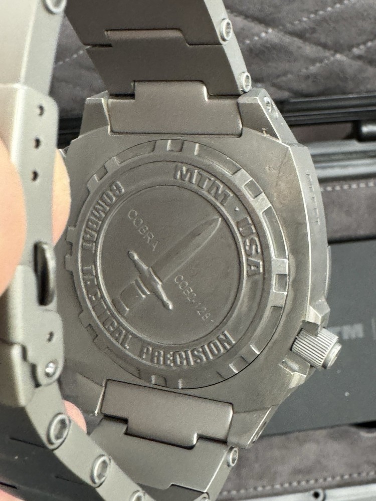 The MTM Special Ops Cobra 47 Titanium Chronograph is a high-quality wristwatch designed for men with a stylish and functional design. This limited edition timepiece features a gray bezel, black carbon fiber dial, and a durable titanium case with a grey sandblasted finish. The watch is water-resistant up to 200 meters and comes with a NATO strap for added versatility. With features like a screwdown crown, luminous hands, date indicator, and chronograph, this watch is ideal for pilots and aviation enthusiasts. The 47mm case size adds a bold touch to the overall design, making it a standout piece in any watch collection. Comes with OD MTM Nato strap, MTM titanium bracelet, MTM black rubber strap, and a Horus camo rubber strap. Worn maybe 6 times.