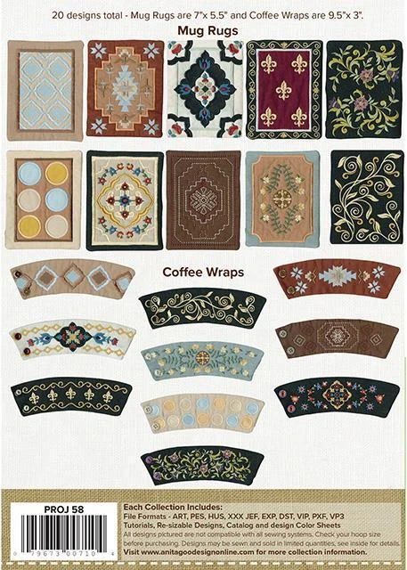 MUG RUGS & COFFEE WRAPS Anita Goodesign Embroidery Machine Design Cd MUG RUGS & COFFEE WRAPS Anita Goodesign Embroidery Machine Design Cd Click images to enlarge Description MUG RUGS & COFFEE WRAPS Anita Goodesign Embroidery Machine Design Cd The collection with all the coffee accessories you will ever need! This is a nice way to dress up a cup of Java and protect your hands and furniture all at the same time! Plus, they make perfect gifts for all your coffee or even tea connoisseur friends! There are 10 beautifully designed mug and wrap sets in this collection. Hoop sizes 6” x 10” to 9.5” x 14” Includes the Following File Formats: · ART, PES, HUS, XXX, JEF, EXP, DST, VIP, PXF,VP3 · Included is TUTORIALS, RE-SIZABLE DESIGNS, CATALOG & DESIGN COLOR SHEETS. NOTE : All Designs are not compatible with all sewing systems. Check your hoop size before purchasing. This means if you’re your system does not support certain hoop sizes the files for that design size will not be in your format files. Pictures sell! Auctiva offers Free Image Hosting and Editing. 300+ Listing Templates! Auctiva gets you noticed! The complete eBay Selling Solution. Track Page Views With Auctiva's Counter