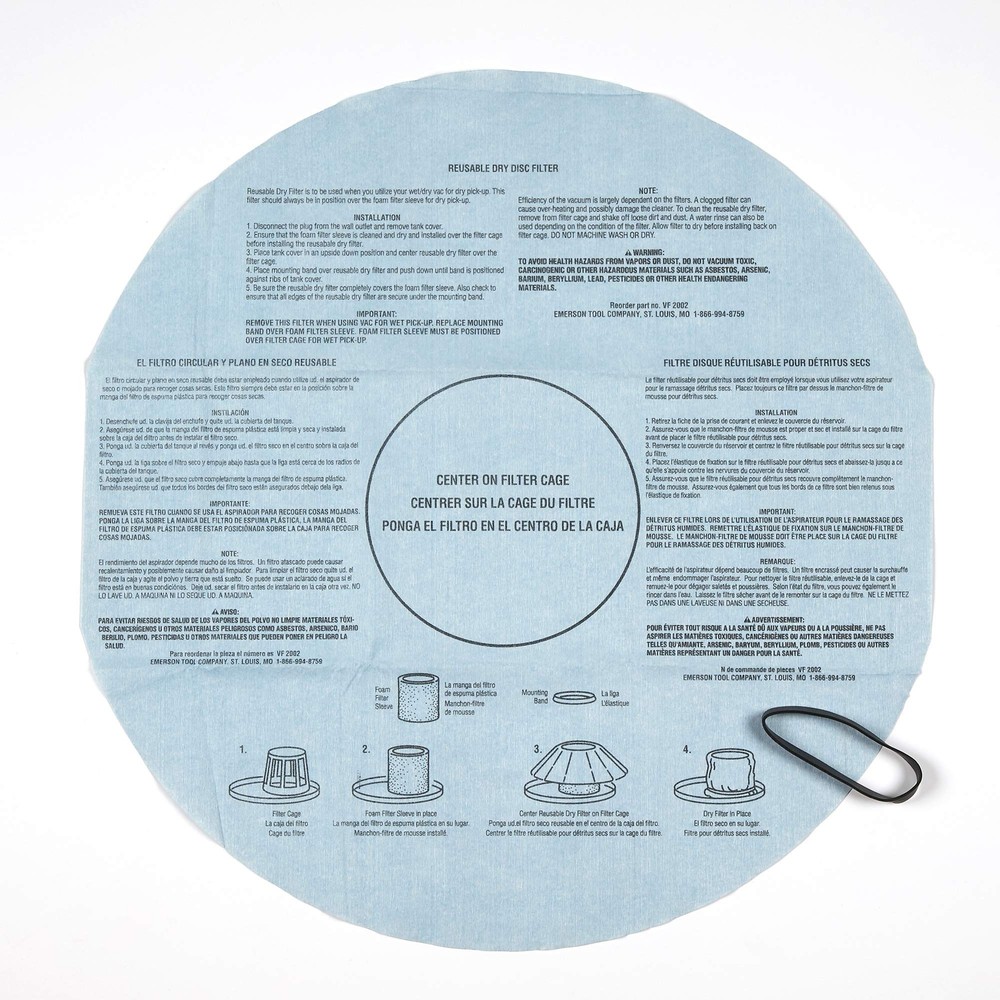 MULTI FIT Wet Dry Vac Filter VF2002 Dry Disc Vacuum Filters for Most 5 Gallon and Larger Shop Vac Branded Wet/Dry Vacuum Cleaners (3 Disc Filters with 1 Band) Product Description These MULTI FIT disposable wet/dry vac filters are designed to filter dry, everyday dirt debris for most Shop-Vac* branded wet/dry vacs. Not for wet use. Fits: Most 5 gallon and larger Shop-Vac* branded shop vacuums. Designed to work with foam filter, MULTI FIT part number VF2001. Does Not fit WORKSHOP Wet/Dry Vacuums. Does not fit these Shop-Vac Models: 5 gallon Wall Mount and 5 gallon Hang Up. The VF2002 wet dry vacuum filters were designed for MULTI FIT as a replacement part for Shop-Vac®* Catalog No: 901-07-00; 9010700; 901-37-00, 9013700, 901-07-62, 9010762. *This NOT a product of, nor is it sponsored or endorsed by Shop-Vac Corp. Shop-Vac is a registered trademark of Shop-Vac Corp. From the Manufacturer WORKSHOP carries the Multi-Fit brand wet/dry vac filters and accessories for the convenience of our customers and partners. Multi-Fit products are specifcally designed to fit other vac products such as Shop-Vac, Genie, and others. This wet dry vacuum filter is disposable for quick, easy filter changes and optimal shop vacuum performance. Disposable Wet dry vac filter is designed for dry, everyday dirt. MULTI FIT VF2002 shop vacuum cleaner filters fits most Shop-Vac* branded wet/dry vacs. This package includes 3 disposable wet dry vacuum filters Contains a retaining band to secure the fit of the shop vacuum filter to the filter cage. For use on general household debris Use only for dry pick-up Designed to fit: most Genie and Shop-Vac wet/dry vacs. Not for use with WORKSHOP products Shipping from the USA All of our products are shipped from the USA, ensuring quick delivery to your destination. Payment We offer the following payment methods: PayPal, credit card, bank transfer, and eBay's secure payment system. Free Shipping & Free Returns Shipping within the USA is FREE. Additionally, any return is absolutely free for you. Risk-Free Purchase You have the option to return an item within 30 days without any justification. We cover the return shipping costs! Fast Shipping We ship immediately upon receipt of payment. Generally, the package is delivered within 2-3 days in the USA. If it takes longer, we will contact you. Quality and Costs Made in Europe, USA, China No customs fees or additional charges Total satisfaction guarantee Invoice with declared VAT available upon request in .pdf format Feedback Your feedback is very important to us. After you pay for your purchase, you will automatically receive positive feedback from us.
