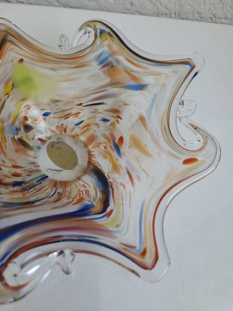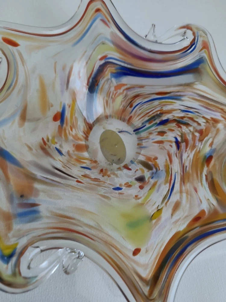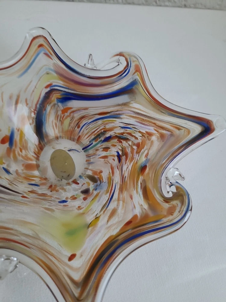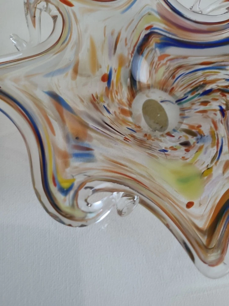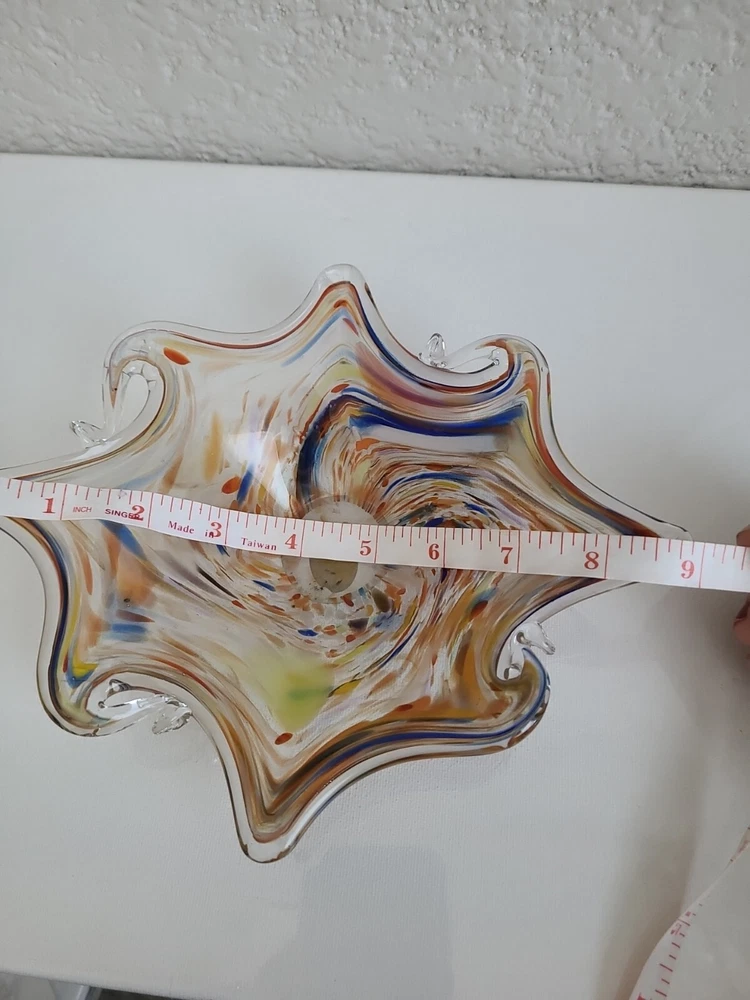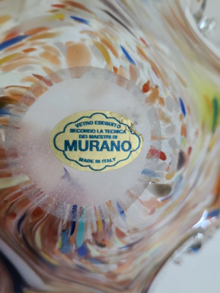 This Murano hand blown glass vase is a stunning piece of art glass. Made in Italy, the vase showcases intricate multicolor designs that are a hallmark of Murano glassmaking. It has been signed by the artist and is a vintage piece, adding to its uniqueness. The vase measures 9 inches and would make a great addition to any collection of decorative pottery and glassware.