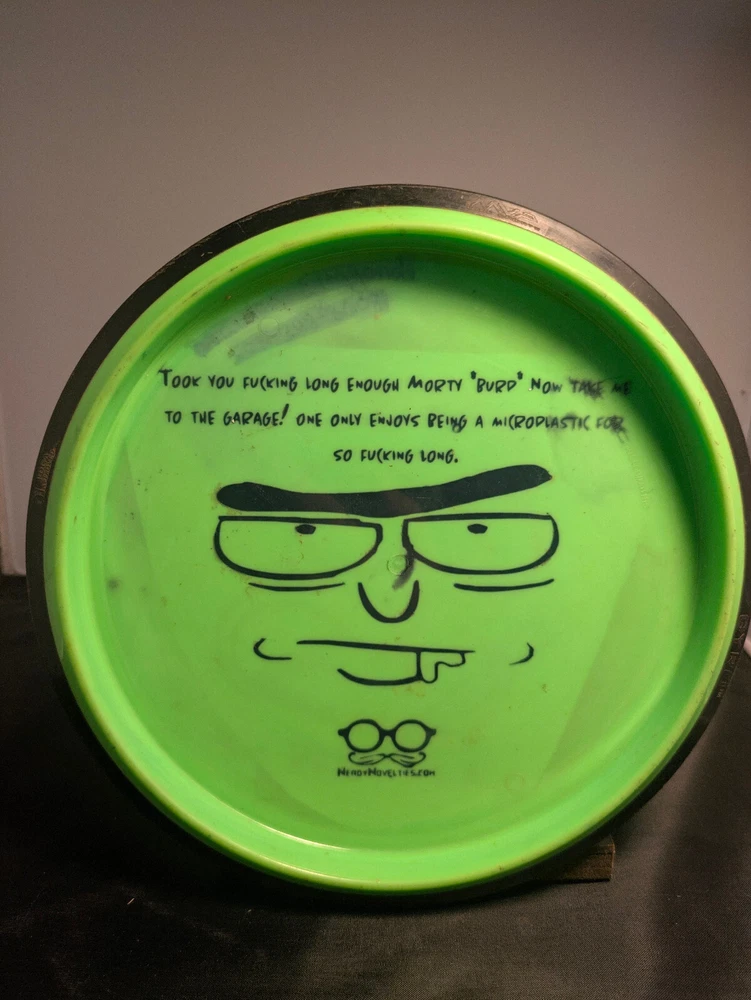 Add the Pre-beat, smart ass Frisbee Rick to your bag. An earlier attempt at a double sided dye, inspired by the green disc that will most likely end up blending into a lovely bush somewhere. But fear not there is a lovely note for whoever happens to find the pleasant surprise. This disc is also ink free. Disk Condition - 7/10 Flat(1)..2..3..4..(5)Dome - 1/5 Soft(1)..2..3..4..(5)Firm - 4/5