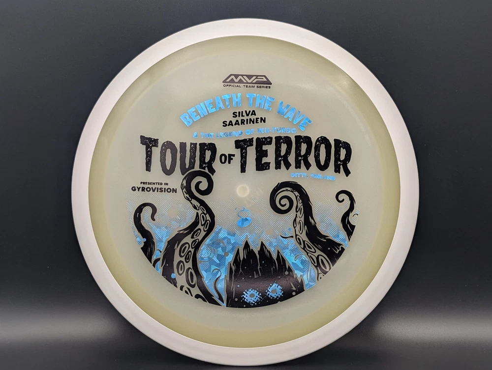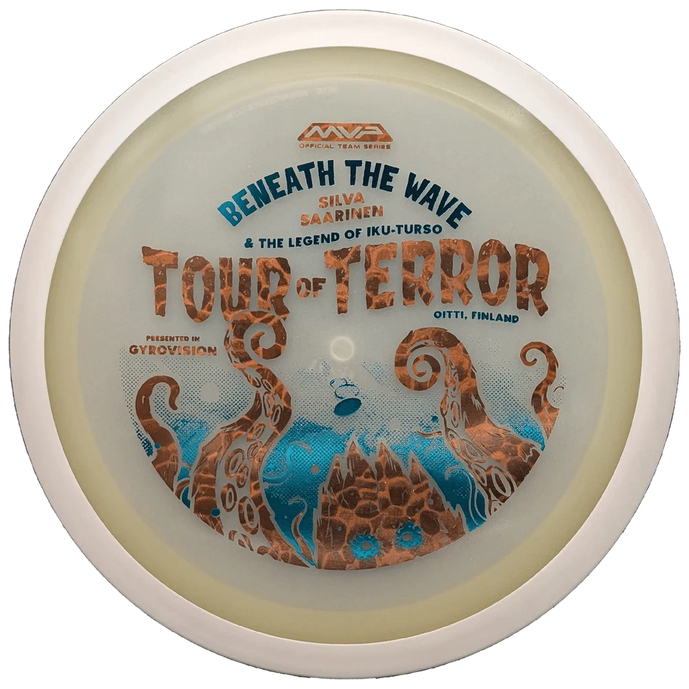 Speed 11 | Glide 5 | Turn -2 | Fade 2 In the waters of Finland, a terrifying creature awaits. Known as the Iku-Turso, this malevolent sea monster has struck fear into the hearts of mankind for nearly 200 years. Inspiring not only fear, the Iku-Turso's legend is so great that it is also featured in epic poetry, known as The Kalevala, dating all the way back to 1835. Now this creature returns thanks to an ominous illustration by Matthew Jorde on the Eclipse Wave! First released in 2023 for the OTB Open, you can now help support Silva Saarinen's disc golf efforts with the only release of it since! Try your very own and discover why the Wave is one of the best selling drivers in MVP history! The disc pictured when you select a variation is the disc you will receive! Shipped in a bubble mailer for protection.