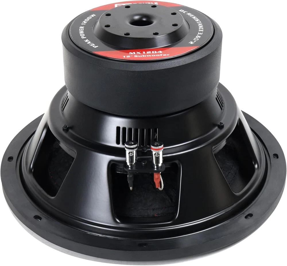 [Configuration] 12 inch subwoofers 4 Ohm Car Audio with Max power: 1200 Watts MAX and RMS power 600 Watts 12 subwoofer [Voice Coil] 2.5" 4-Layer High Temperature Copper Voice Coil Black Aluminum [Cone Material] 12" Competition Grade Pressed Paper Cone [Specification] Sensitivity(1W/1M):87.6dB / Motor Weight:99 Oz / Resonant Frequency: 40.3Hz@ 2 Ohm [Feature] High Flux Ferrite Motor / Advanced Air Flow Cooling Design Product Description