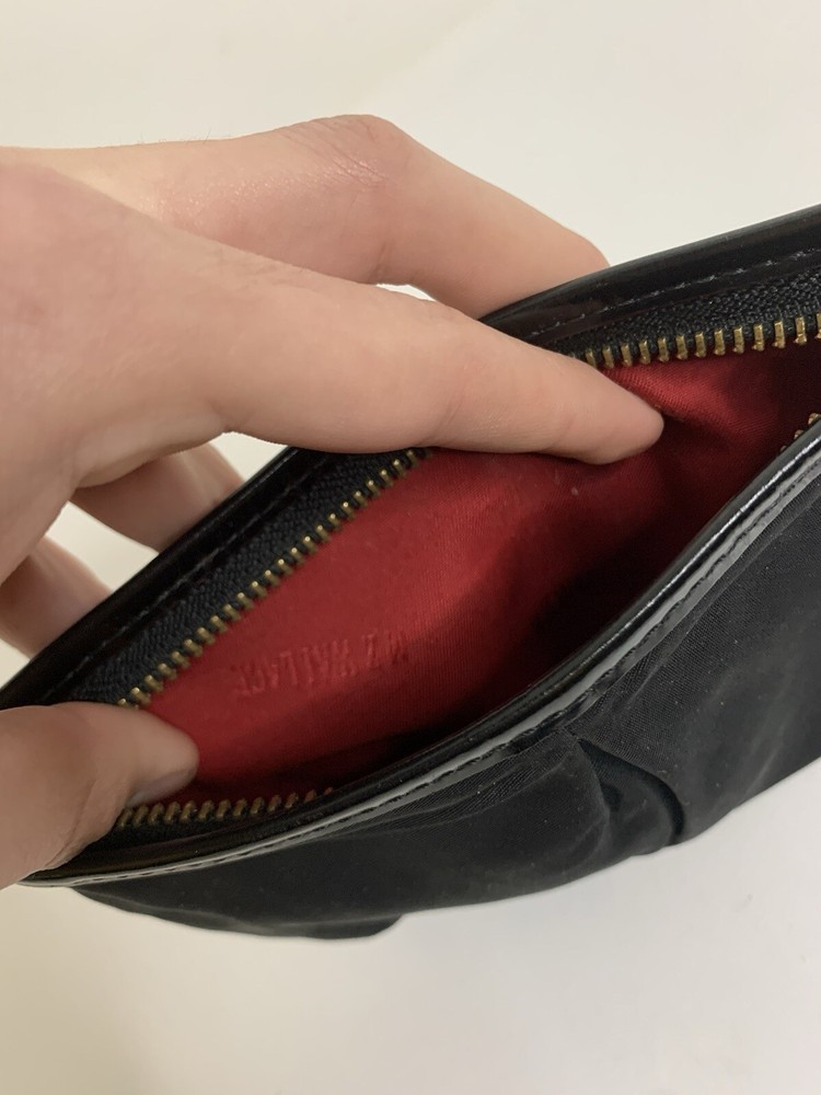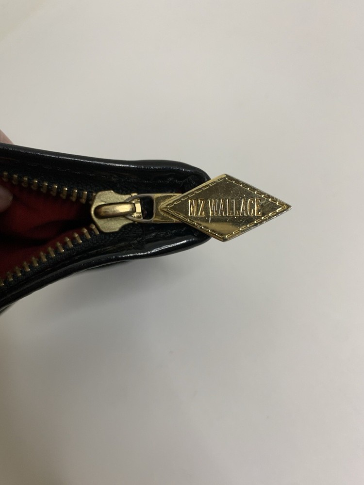 Elevate your style with this chic MZ Wallace clutch. The black nylon exterior features a patent leather trim and a zip closure. The red wristlet strap adds a pop of color and the rectangular shape is perfect for a day or night look. The interior is lined with nylon and includes a zip pocket for added organization. This clutch is perfect for any occasion, whether it be travel, a party, cocktail, casual, or workwear. The bag measures 7 inches in width, 3 inches in height, and 1 inch in depth. The MZ Wallace clutch is a must-have accessory for any fashion-forward woman.