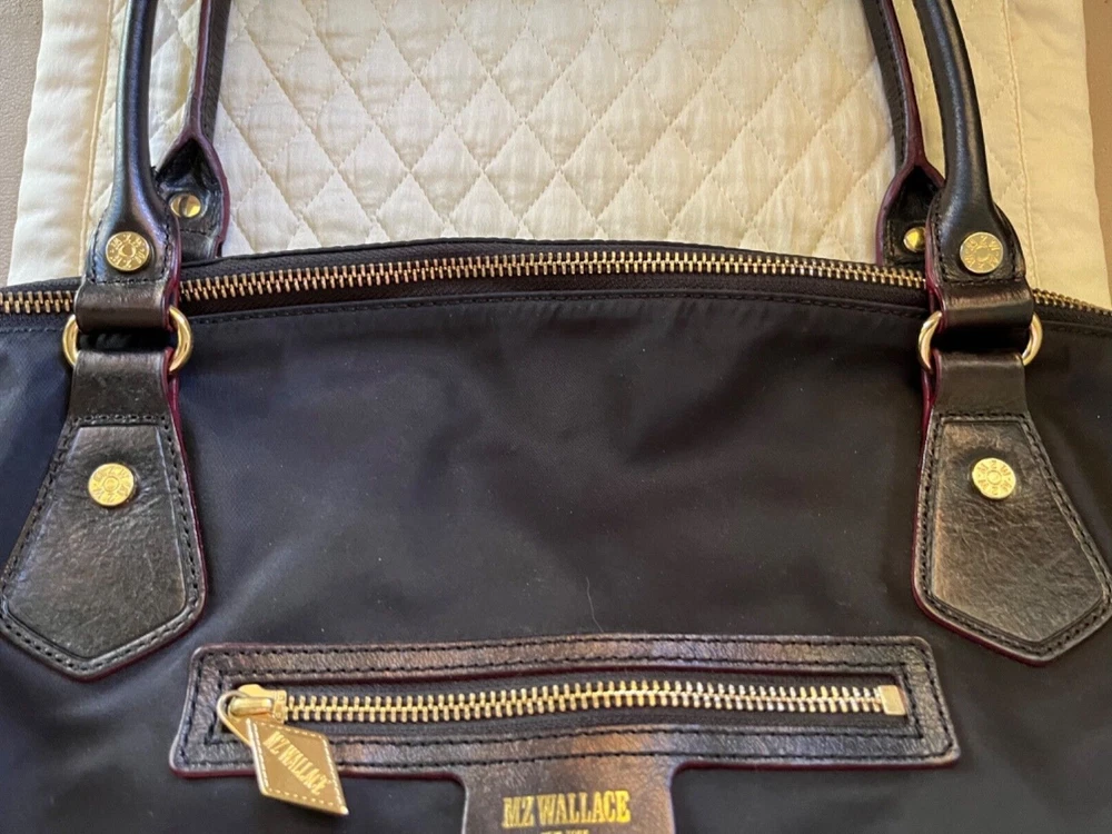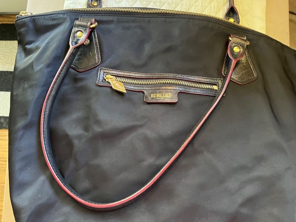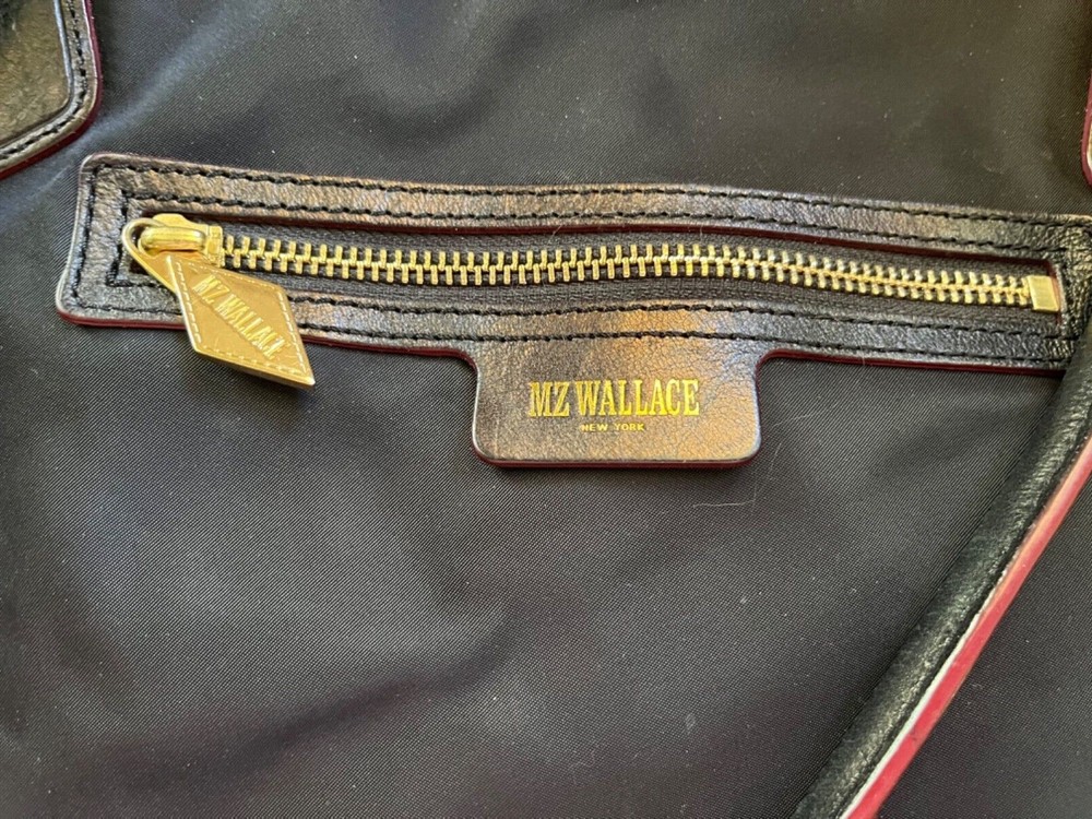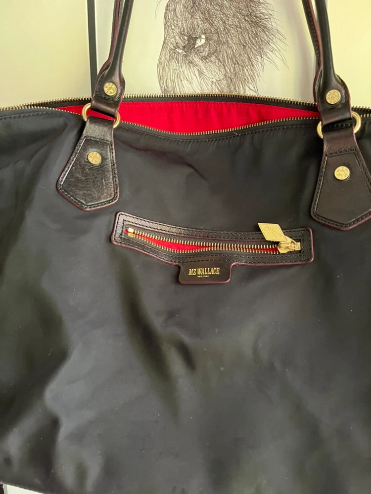 Gently enjoyed black MZ Wallace bag with gold metal zippers and little feet underneath. One zip outside pocket, key strap inside and both open and zippered interior pockets with red nylon lining. Black smooth nylon outside and black leather handles have subtle red edges. Strap drop about 10, depth underneath 7, 13 high and 16 wide when empty and flat. Terrific for everyday and for travel.