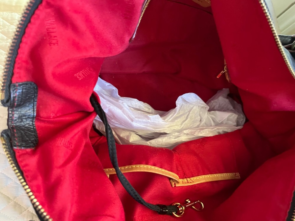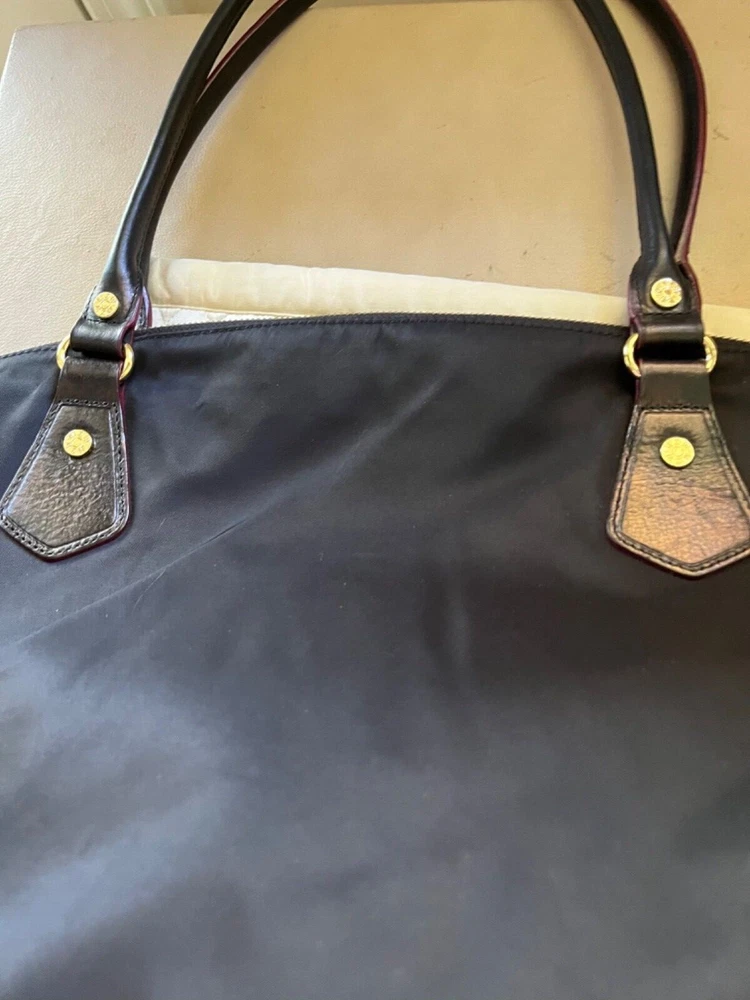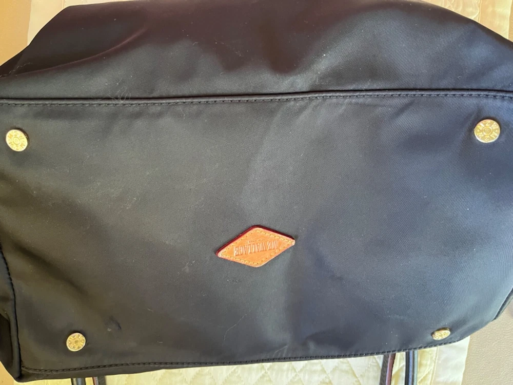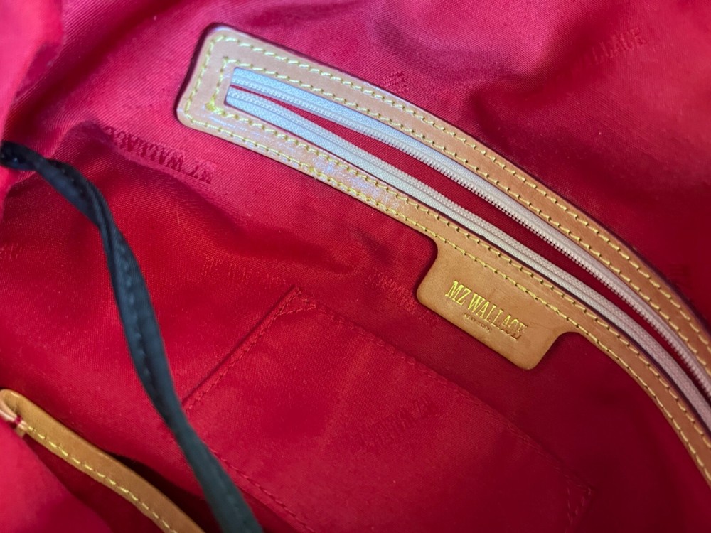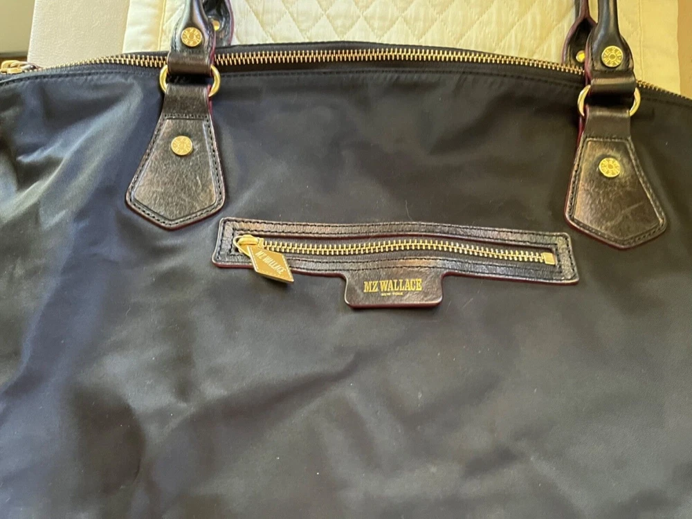 Gently enjoyed black MZ Wallace bag with gold metal zippers and little feet underneath. One zip outside pocket, key strap inside and both open and zippered interior pockets with red nylon lining. Black smooth nylon outside and black leather handles have subtle red edges. Strap drop about 10, depth underneath 7, 13 high and 16 wide when empty and flat. Terrific for everyday and for travel.