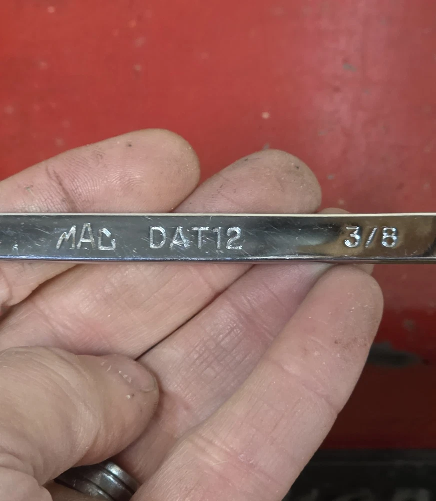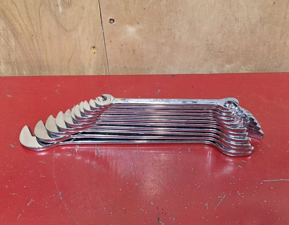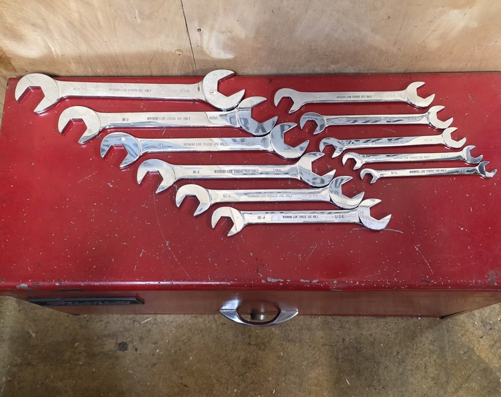 Mac Tools SAE 10pc Low Torque Thin 4-Way Angle Head Wrench Set 10 pc 3/8-1" USA Good to fair condition. Thin/low torque USA made four way angle head/open end wrench set. DAT model wrenches. Very thin to get in tight spaces. Have scratches, blemishes, and other signs of use and wear. No owners marks. DAT12 3/8" DAT14 7/16" DAT16 1/2" DAT18 9/16" DAT20 5/8" DAT22 11/16" DAT24 3/4" DAT26 13/16" DAT28 7/8" DAT30 15/16" DAT32 1"