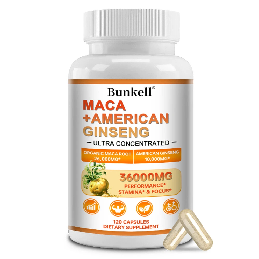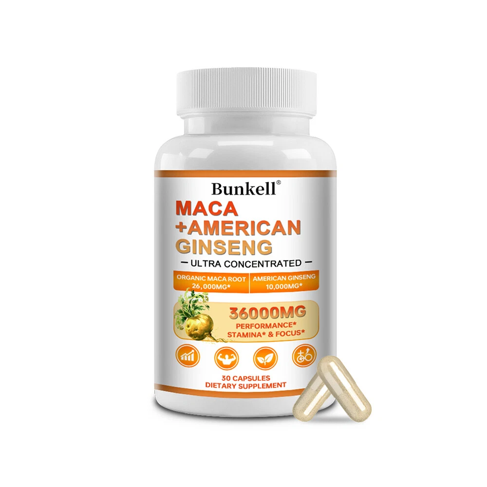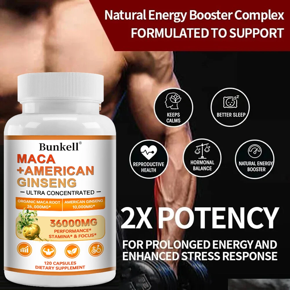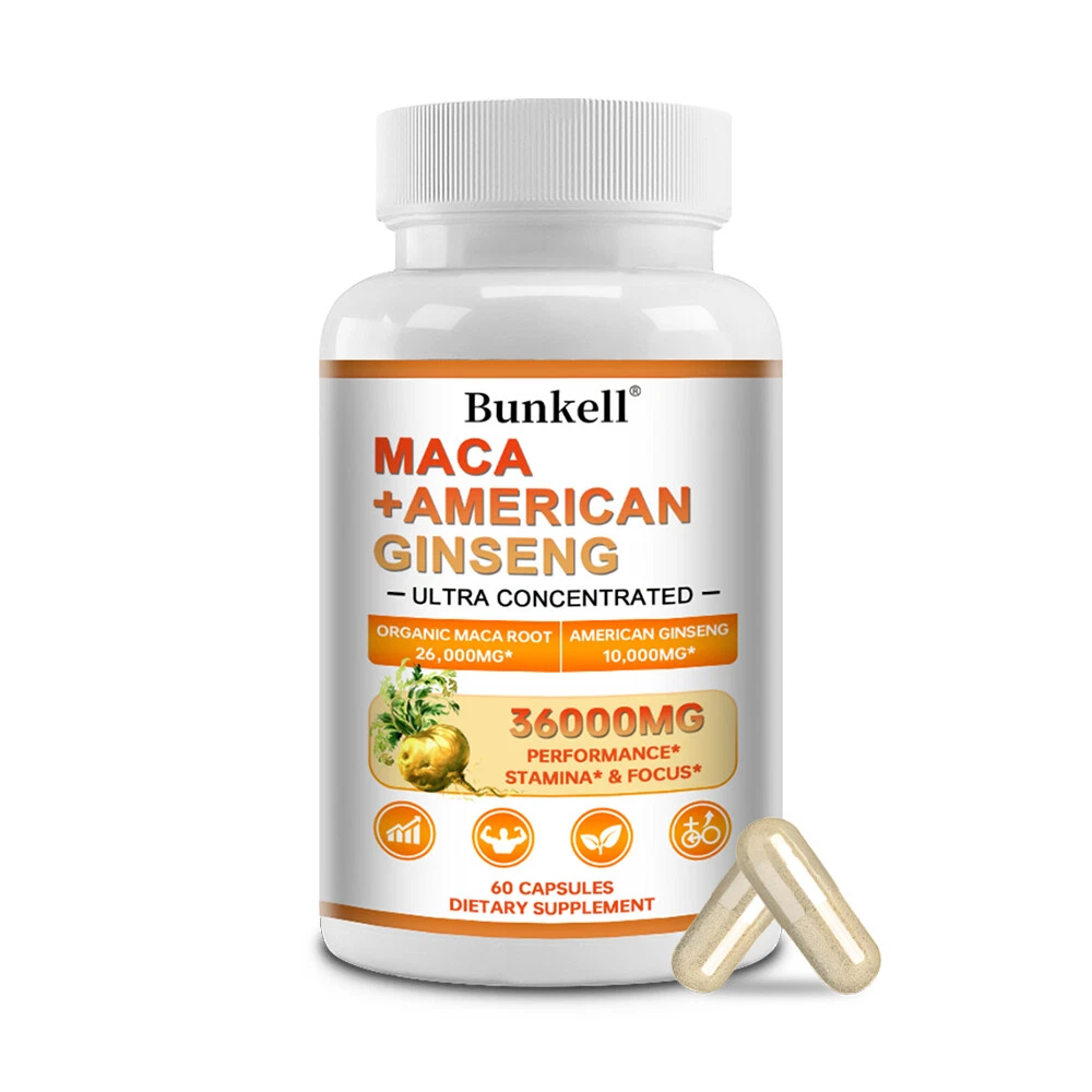 Active Ingredients: American Ginseng Root, Maca Root MPN: N/A Shelf Life: 2 years Item Weight: 1.45/2.09/3.06oz Type of Diet: Bodybuilding FDA Registration Number: 12397111146 Flavor: Unflavored Formulation: Capsule Features: Alcohol Free, All Natural, Caffeine-Free, Gluten-Free, GMO-Free Ingredients: Ginseng, Maca Department: Men Production Date: 06/2024 Number of Pills: 30/60/120 Supply: 1 Month and Longer Country/Region of Manufacture: Unknown Main Purpose: Bodybuilding, Endurance/Energy, Fitness, Muscle Gain, Sports and Fitness Performance Expiration Date: 06/2026 Type: Sports and Fitness Performance Brand: Bunkell