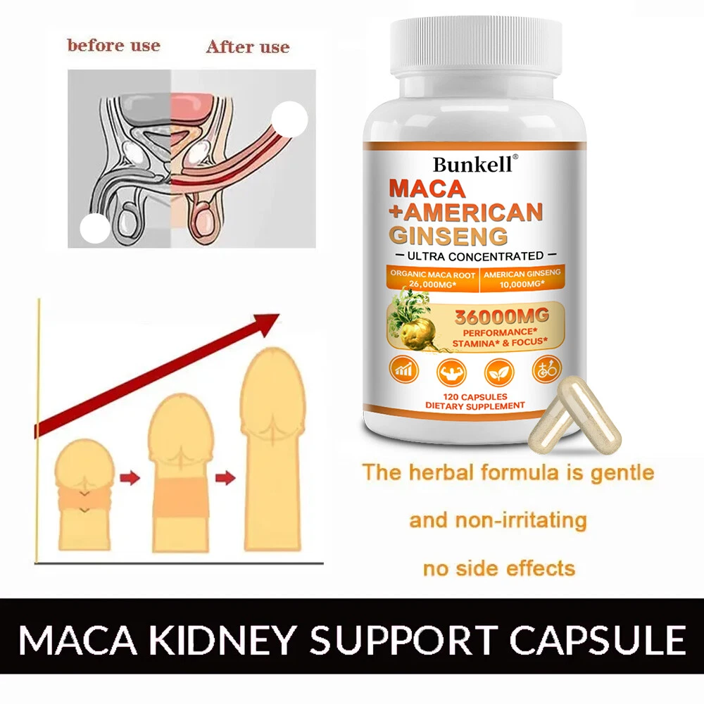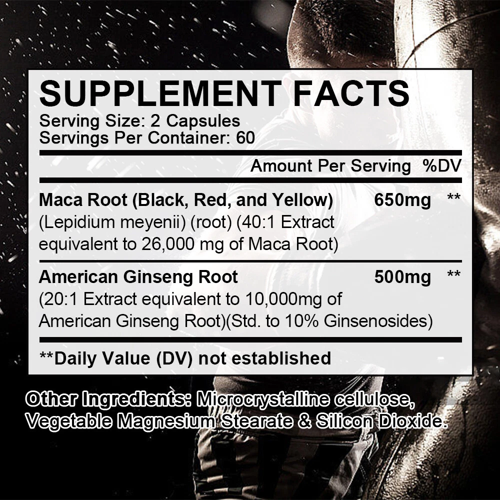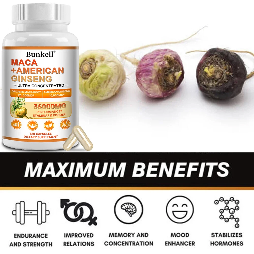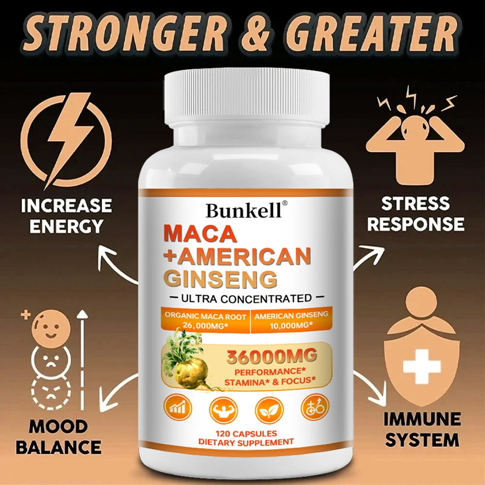 Active Ingredients: American Ginseng Root, Maca Root MPN: N/A Shelf Life: 2 years Item Weight: 1.45/2.09/3.06oz Type of Diet: Bodybuilding FDA Registration Number: 12397111146 Flavor: Unflavored Formulation: Capsule Features: Alcohol Free, All Natural, Caffeine-Free, Gluten-Free, GMO-Free Ingredients: Ginseng, Maca Department: Men Production Date: 06/2024 Number of Pills: 30/60/120 Supply: 1 Month and Longer Country/Region of Manufacture: Unknown Main Purpose: Bodybuilding, Endurance/Energy, Fitness, Muscle Gain, Sports and Fitness Performance Expiration Date: 06/2026 Type: Sports and Fitness Performance Brand: Bunkell