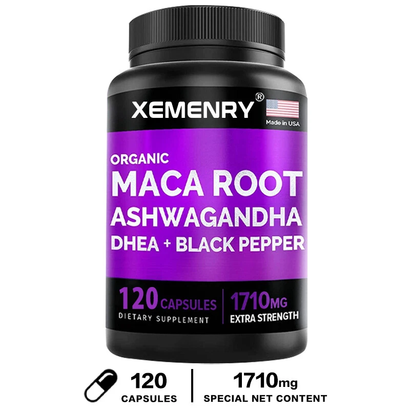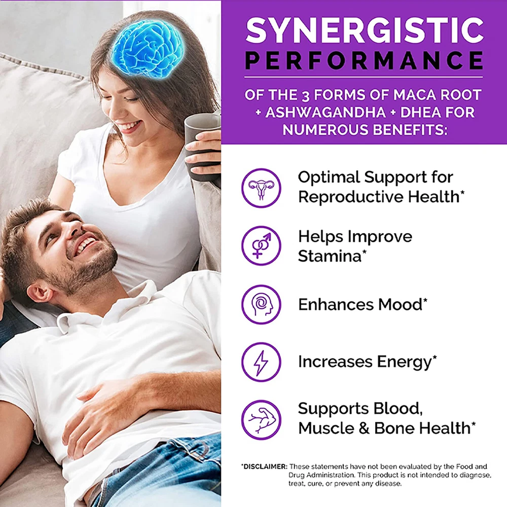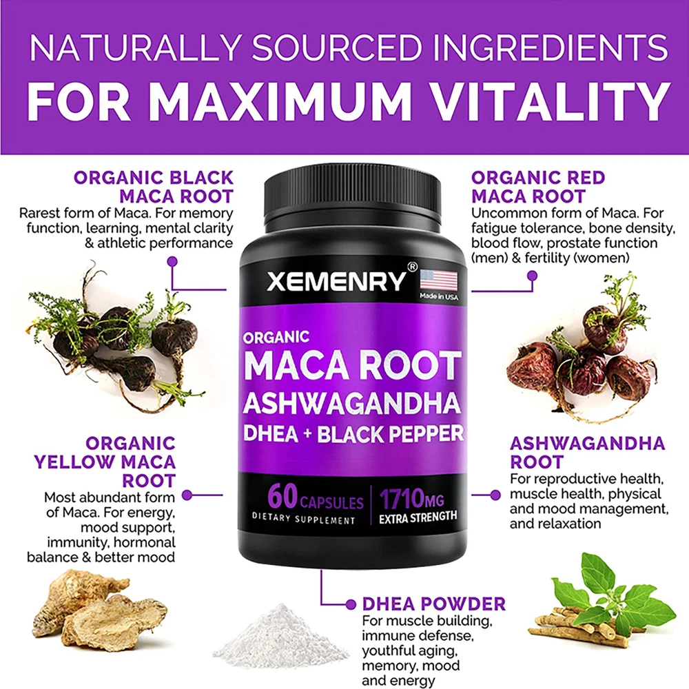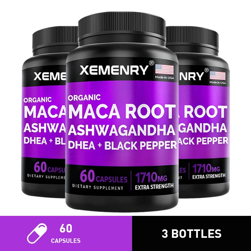 Effects: Energy & Endurance, Testosterone Booster Ingredients: Maca,Ashwagandha Directions: Take 2 capsules once daily after a meal. Shipping: Ships within 48 hours on working days. Shelf life: 2 years Description: Hormone Balance: Red, Black, and Yellow Maca Roots, and Ashwagandha all help balance and regulate hormone levels, including reproductive health, and improve symptoms of imbalances. Energy Boost: These blends have a natural energizing effect, helping to improve endurance, physical performance, and overall vitality. Helps improve the body's resilience and ability to cope with stress. Document