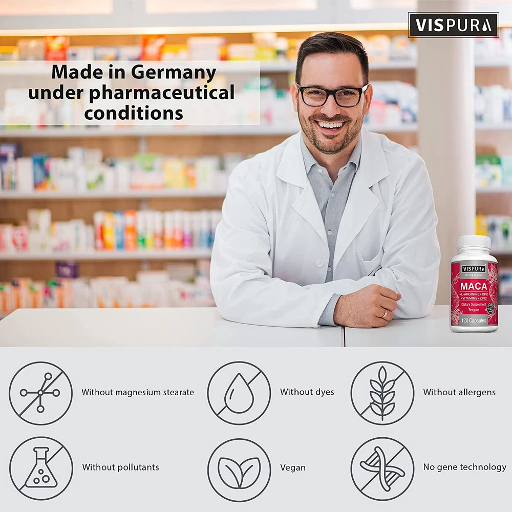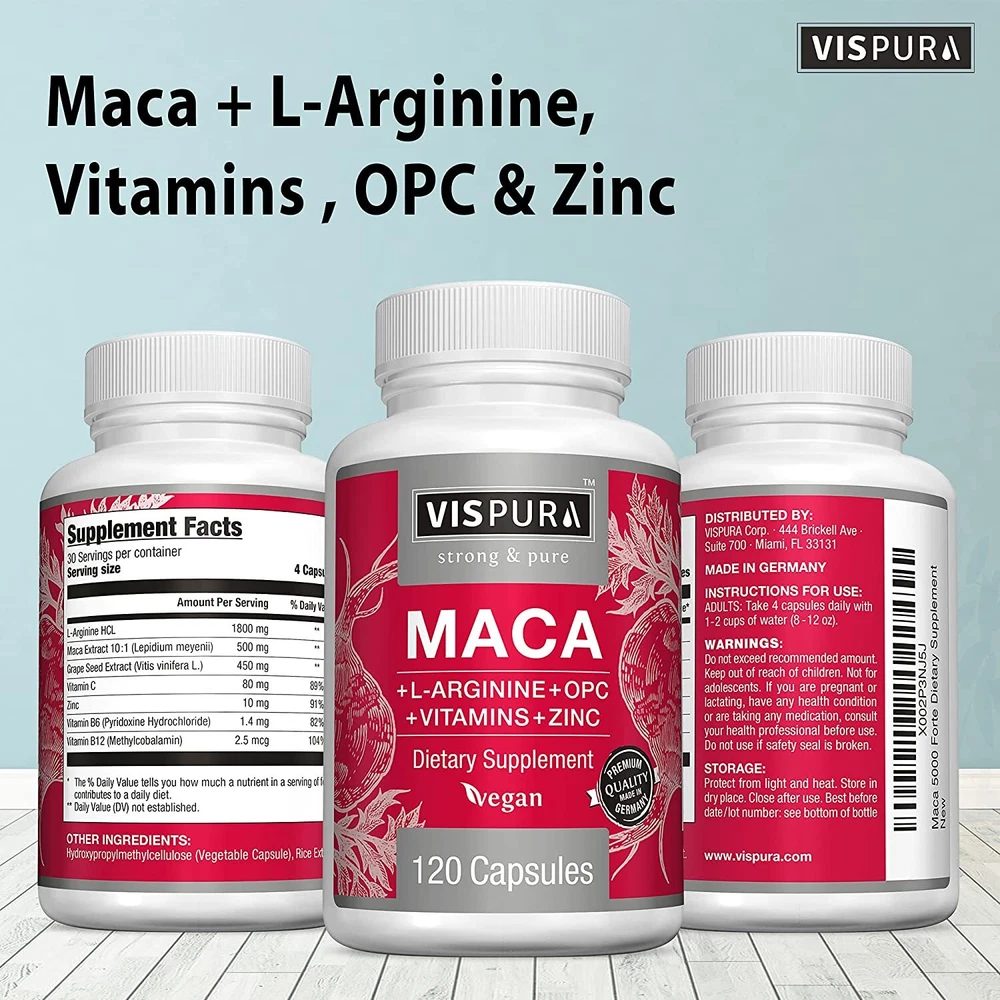 Maca Root Capsules 5000 mg 120 vegan Pills Peruvian Maca Extract for Men & Women US Warehouse - FREE & FAST Shipping in USA DESCRIPTION These statements have not been evaluated by the FDA. This product is not intended to diagnose, treat, cure, or prevent any disease or health condition. Natural Maca Extract – This 5000 mg maca root for men and women provides essential support that helps fight fatigue, restore focus, and fortifies your immune system and metabolic health. Extra-Strength Support – Along with maca extract we’ve also added 1800 mg of L-Arginine as well as Grape Seed extract, Vitamins B6 and B12, and zinc to help round out the support provided in every single dose. No Magnesium Stearate or Additives – Purity is essential to our products which is why our maca capsules for men and women are vegan and vegetarian friendly, allergy free, and don’t contain harsh additives or preservatives. Fast-Absorbing Efficiency – These easy-to-swallow high-dose capsules absorb more rapidly into the body to start working faster and more effectively. This means you absorb more of each extract or vitamin to ensure proper support. Feedback 1.Any question for your order, please contact us in time, we will reply to you within 24 hours and give you a satisfactory answer. 2.If you are satisfied with our products and services, hope to take up your a little precious time to leave feedback reviews for our products.Thanks! 3.Your satisfaction is our effort. Welcome to order again! Have a great day! Our Policy 100% Satisfaction Guarantee 30 Days Return and Refund Guarantee Free and Fast Shipping in USA, US Warehouse 20% of restocking fee will be charged for return item