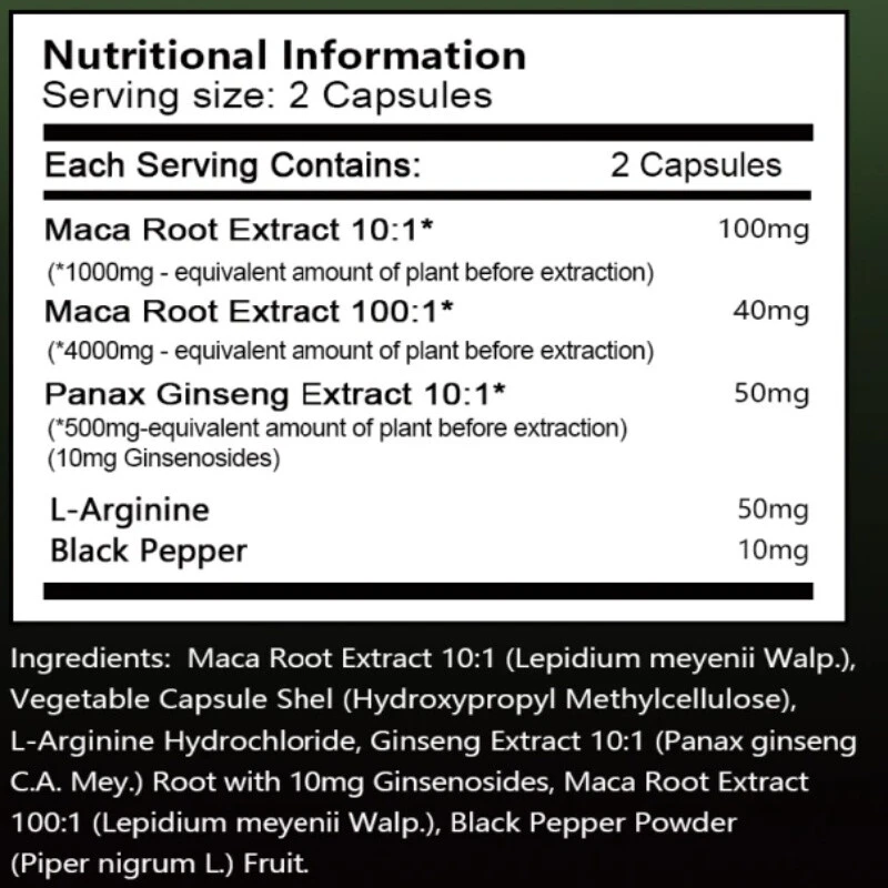 Store Categories Store Categories Other Maca Supplements - Energy Men Women Herbal Supplement 120 Capsules 3 Bottles Product Description Description 💪🏼 ENDURANCE, PRE-WORKOUT, AND MORE: Black Maca is an ideal supplement for athletes, bodybuilders, weekend warriors, and anyone who wants to stay physically active. Suitable for both men and women, this maca root provides essential energy-boosting support to help build muscle mass, increase strength, increase endurance, and improve athletic performance. Additionally, Black Maca is rich in vitamins and minerals that are necessary for muscle repair and fighting fatigue. Payment Policy Shipping Policy Returns Policy Payment Policy eBay Accepts The Following Payment Methods: 1.Visa 2.Mastercard 3.PayPal 4.Apple Pay 5.Google Pay 6.American Express Card Shipping Policy All the items will be dispatched within 3 business day after the payment is clear. Shipping may be delayed during special holidays We are not responsible for any custom duty or import tax. Returns Policy 1. If you need return, please contact us with Email before open a case, let us know the detailed problem and send us some pictures for confirmation. 2. All returned items must be in the original packaging and provide us tracking number, specific reason for the returns. Copyright © 2023 Dianxiaomi