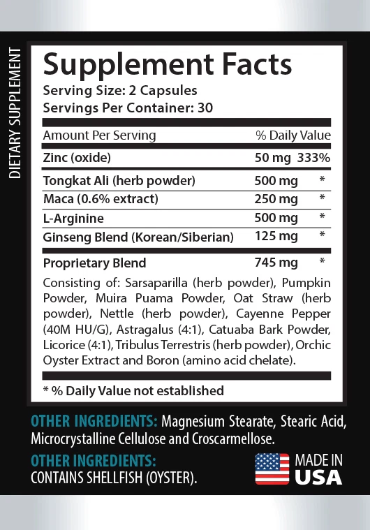 MAKE MY PEPPER BIG NATURAL MALE ENHANCEMENT FORMULA. INCREASES ENERGY LEVEL, STAMINA & ENDURANCE. INCREASES SEX DRIVE. MUSCLE GAINER. WEIGHT CONTROL & MOOD SUPPORT. Made in USA 1 Bottle 60 Capsules Your energy, stamina, and sexual endurance will receive a boost with this supplement due to the potential ingredients. Your sex drive will increase tremendously with this supplement. Make my Pepper Big Mane Enhancement Pills Overview Sexual problems are the major problems in which most males are experiencing these days. The best solution for this is the male enhancement pills that would not just help one deal with such incapacity, but also helps in increasing your stamina, size as well as the pleasure. These pills are simply made up from ingredients, which do not really impose any form of harm into the body. Thus, there’s no need for any doctor’s prescription if you would like to use it. Male enhancement pills come with lots of awesome benefits. This male enhancement pills deal with this problem by increasing blood flow and expanding blood vessels. This supplement contains an amino acid called L-arginine that helps to improve blood flow to the genital area by dilating blood vessels and helping the penis to enlarge to its full capacity, thus increasing the size and hardness. What Is Maca? The maca plant has exploded in popularity in recent years. It's actually a plant native to Peru, and is commonly available in powder form or as a supplement. Maca root has traditionally been used to enhance fertility and sex drive. It's also claimed to improve energy and stamina. The maca plant, known scientifically as Lepidium meyenii, is sometimes referred to as Peruvian ginseng. It mainly grows in the Andes of central Peru, in harsh conditions and at very high altitudes — above 13,000 feet (4,000 meters). The main edible part of the plant is the root, which grows underground. Maca is a medicinal plant that mainly grows high up in the mountains of Peru in harsh conditions. Maca root powder is high in protein and carbs and rich in a number of nutrients, including vitamin C, copper and iron. It also contains many bioactive plant compounds. Increases Libido in Men Reduced sexual desire is a common problem among adults. Consequently, interest in herbs and plants that naturally boost libido is great. Maca has been heavily marketed as being effective at improving sexual desire. When it comes to male fertility, sperm quality and quantity is very important. There is some evidence that maca root increases men's fertility. Maca can increase sperm production and improve sperm quality, thereby enhancing fertility in men. Maca can improve symptoms of menopause, including hot flashes and disrupted sleep at night. Maca may improve your mental well-being and mood by reducing depression and , especially in menopausal women. Maca contains plant compounds called flavonoids, which have been suggested to be at least partly responsible for these psychological benefits. The Benefits of Tongkat Ali Tongkat ali, a medicinal herb with the scientific name, Eurycoma longifolia Jack, is a popular herbal supplement with many purported benefits. One of the purported uses of tongkat ali is a supplement that enhances the body's adaptive response to exercise. Tongkat Ali is thought to produce this effect by causing an increase in the body's levels of testosterone, a male sex drive which effects muscle size and performance. Tongkat ali extract in conjunction with a weight-training program, caused an increase in lean body mass and a loss of fat tissue relative to placebo. This supports the use of tongkat ali by athletes as an ergogenic help. As tongkat ali is thought to increase levels of the testosterone, it may have utility as a libido-enhancer or general male sexual support supplement. L-Arginine and Weight Loss L-arginine is an amino acid, one of the building blocks for proteins in your body. It may help to prioritize muscle-building over fat deposits and limit weight and fat gains due to a high-fat diet. A combination of muscle-building exercises and aerobic exercise will help you maintain your muscle as you lose weight; otherwise, about one-fourth of the weight you lose will come from muscle instead of fat. L-arginine is popularly consumed by athletes for building muscle mass. Arginine elevates nitric oxide activity in the body. Nitric oxide is a gas that carries out various biological functions such as improving blood flow, aiding in functioning of nervous system and serving as a neurotransmitter. Arginine as I mentioned previously aids in formation of nitric oxide and nitric oxide has following implications on obesity and metabolic health. Health Benefits Of Ginseng For Men As men get older, sexual health and memory loss become more common. However, ginseng doubles as a natural protection that doesn’t have negative side effects. Ginseng can improve sexual performance in males. Korean ginseng helps sexual function in men without changing lipid blood levels. Men who took ginseng reported better penile hardness, making it easier to have sexual intercourse. As men age, they enter a phase known as andropause, a male version of menopause. Andropause can cause memory loss. Luckily, men can naturally improve their mental health with ginseng. Both Asian and American ginseng enhance brain function and mood. With wide-ranging action, ginseng (Panax ginseng), also called Asian ginseng, has been shown in human studies to have an anti-stress effect; improve physical and mental performance, memory, and reaction time. Supplement Facts: Serving Size: 2 Capsules Servings Per Container: 30 Zinc (oxide) 50 mg 333% Tongkat Ali (herb powder) - 500 mg Maca (0.6% extract) - 250 mg L-Arginine - 500 mg Ginseng Blend (Korean/Siberian) - 125 mg Proprietary Blend - 745 mg: Sarsaparilla (herb powder), Pumpkin Powder, Muira Puama Powder, Oat Straw (herb powder), Nettle (herb powder), Cayenne Pepper (40M HU/G), Astragalus (4:1), Catauba Bark Powder, Licorice 