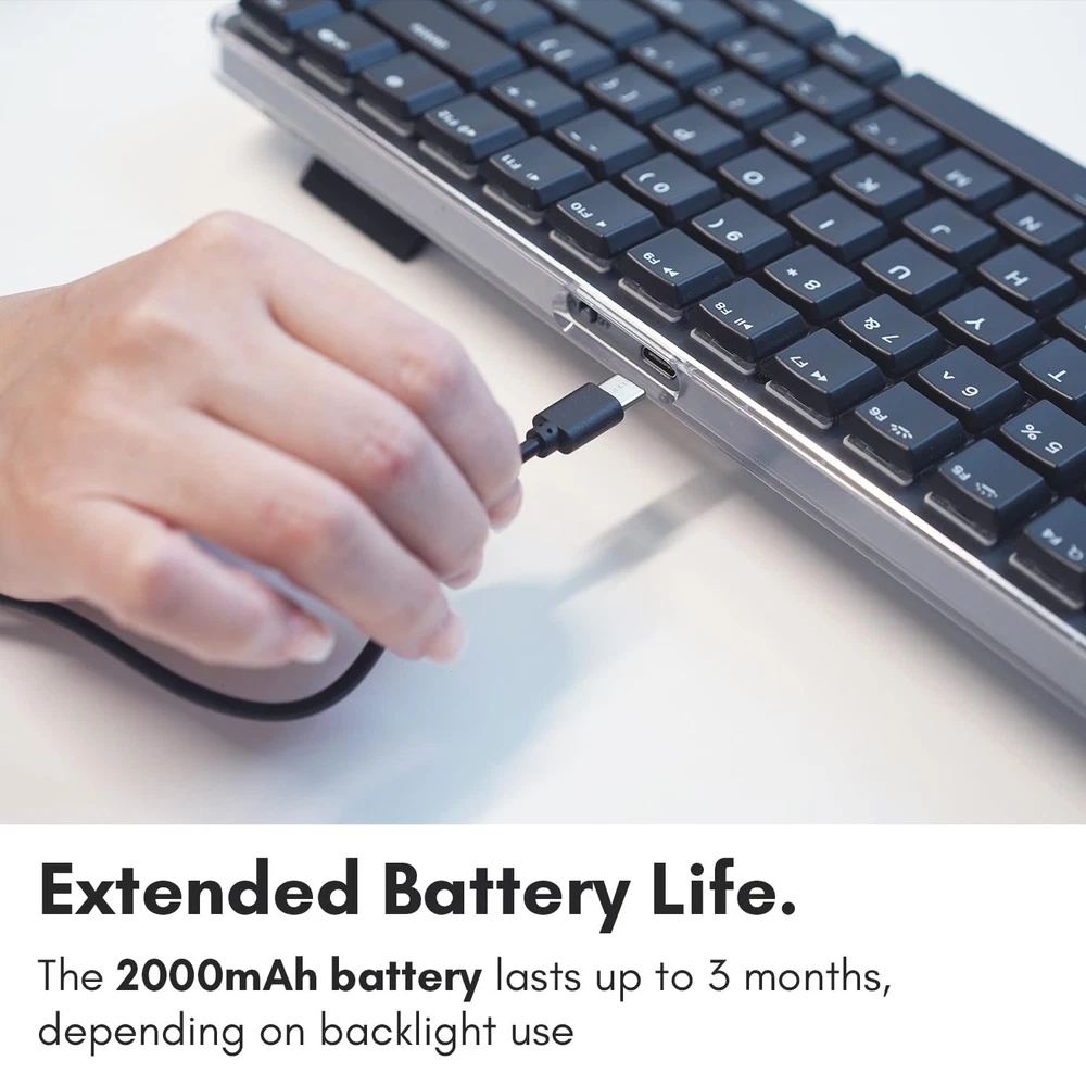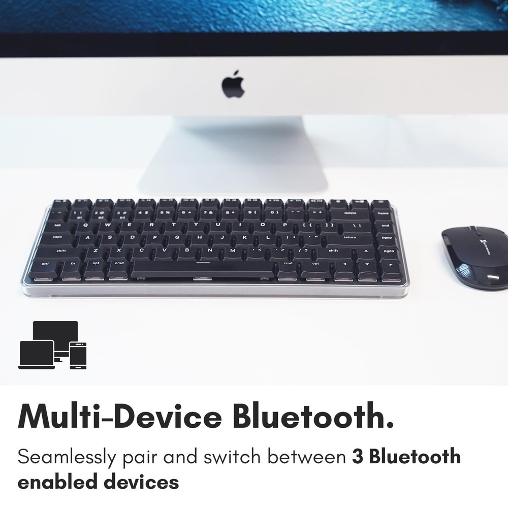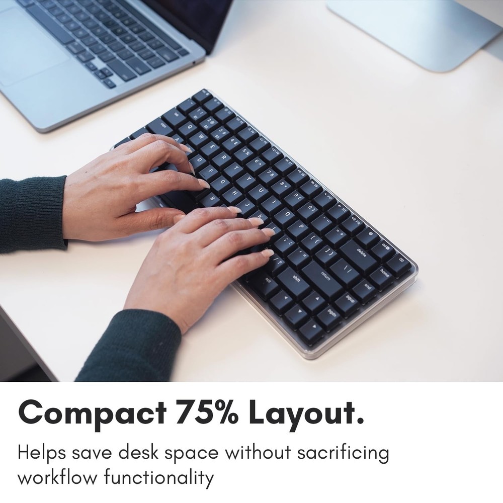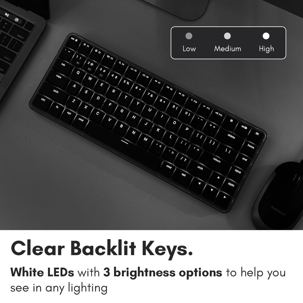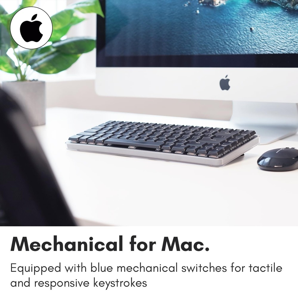Experience the Macally Wireless Bluetooth Keyboard for Mac, featuring tactile blue switches, a compact 75 percent layout, multi device pairing, and adjustable white backlighting for a precise and stylish typing experience. Product is used but in excellent condition.