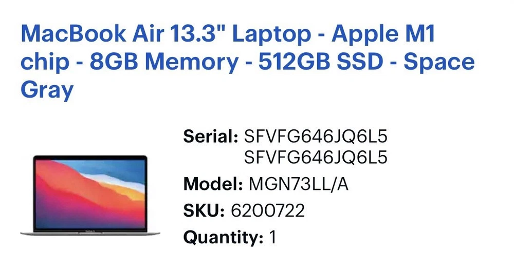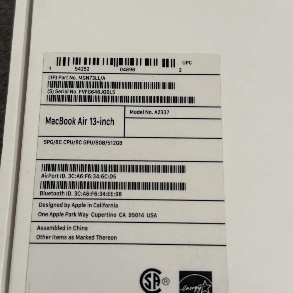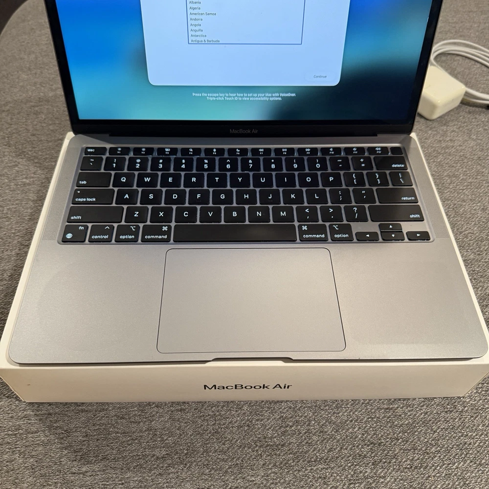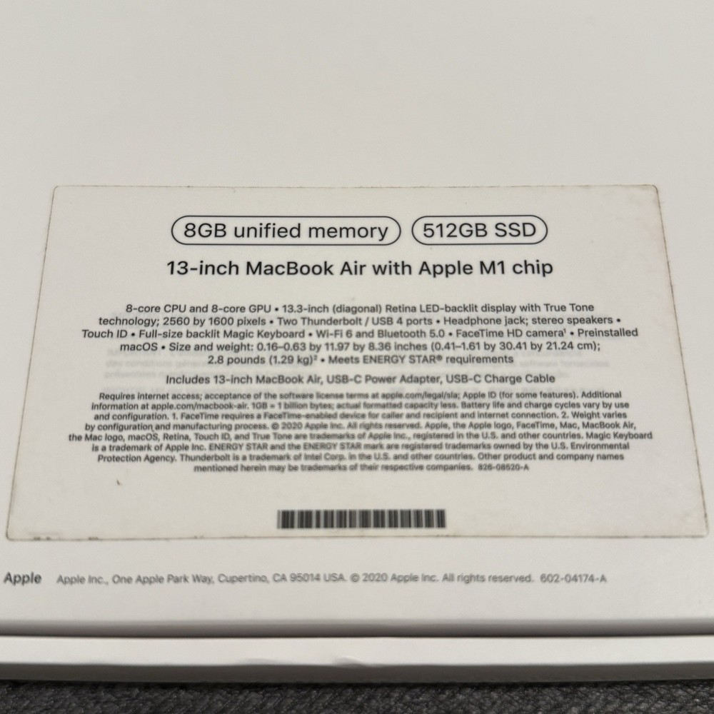 This was my personal laptop during school and I am looking to pass it on now that I do not need it as much. I took great care of it as you can tell from the pictures. Macbook will ship in original box and also include original usb-c charger and cable. • Model: MacBook Air • Model Number: A2337 • Part Number: MGN73LL/A • Release Year: 2020 • Processor: Apple M1 • RAM Size: 8 GB • SSD Capacity: 512 GB • Screen Size: 13.3 in • Color: Space Gray • GPU: 8-Core (The 512GB model usually features the higher-tier 8-core GPU) • Operating System: macOS (Latest compatible) • Features: Touch ID, Retina Display, Backlit Keyboard, Force Touch Trackpad • Ownership: Original owner; used personally in a smoke-free/pet-free environment. • Condition: 9/10. Hinge is healthy, all keys are functional, and the Retina display is free off any scratches or dead spots. Some light/faint shadows remain from where I had placed two stickers, on the sides of the trackpad (as shown in pictures). I took great care of this laptop, all hardware is fully functional, no major flaws, scratches, dents, or dings. No chips along any edges or corners. • Hardware: All hardware (Touch ID, speakers, ports, webcam) is 100% functional. • Battery: Well-maintained, 89% Capacity • Storage: 512GB Apple Proprietary SSD (Fast, reliable, and plenty of room). Included: • Apple MacBook Air M1 (Space Gray) • Original Apple USB-C Power Adapter & Cable • Original Box Shipping & Service: • ⚡ Shipped Out FAST!! (1-Day Handling, Priority Mail Shipping) • 📍 Secure Packaging: I ship tech with great care.
