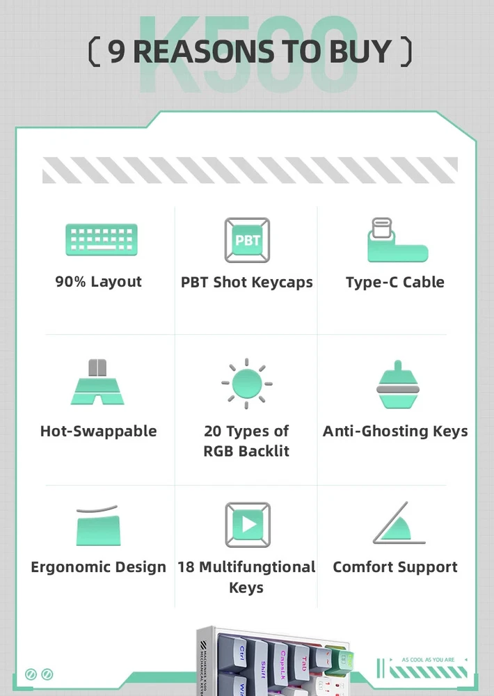 1. About packaging When the package arrives, please check whether the opposite side of the package is in good condition before signing for it. Record the unboxing video to protect your rights. 2. About review We look forward to your 5-star review. If there is a problem with the product, please contact customer service instead of low-star review. 3. About keyboard languages ·Select keyboards shipped from China, which are keycaps for US English. ·Select keyboards shipped from Russia, which are US English mixed with Russian keycaps. Features Of K500 1, 94 Keys 90% layout 2, PBT shot keycaps 3, Allow Hot-swappable 4, 20 kinds of RGB Backlit 5, All keys Anti-ghosting 6, 18 Multimedia Keys PBT Shot Keycaps PBT shot injection keycap , design for durability and crystal clear uniform backlighting Two Color To Choose 90% LAYOUT---94 Keys Design Crafted for productivity, the K500's 90% layout is a version to allows users access to all the essential multimedia and function keys, but with a smaller footprint. EXCELLENT TYPING EXPERIENCE The K500 is designed to fit your dedicated typing experience. No matter what you like, linear, clicky or a little in between, we've got you covered with three Huano switches options (Blue, Brown, Red). We want to make sure that you experience the same feedback for every keystroke. HOT-SWAPPABLE You can easily hot-swap every switch in a few seconds to customize your typing experience on the K500 without soldering. Wonderful RGB Backlight Effects The K500 features RGB lighting with 16.8 million LED colors , you can download additional lighting effects to the library and easily use them through the lighting effects driver Detachable Type-C Cable Type-C is powerful than older usd types and transfer data faster than any other USD type .