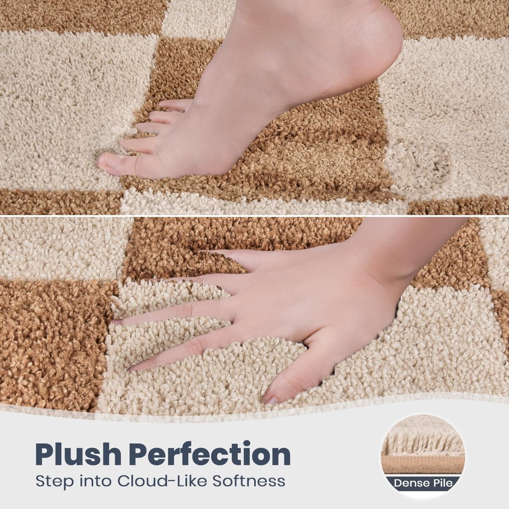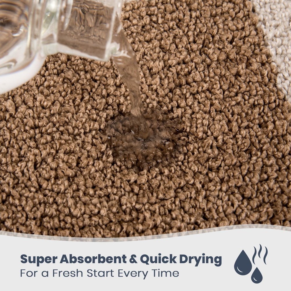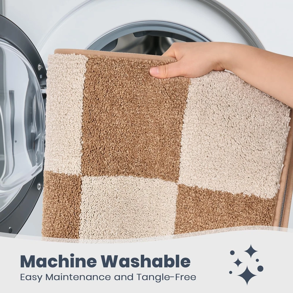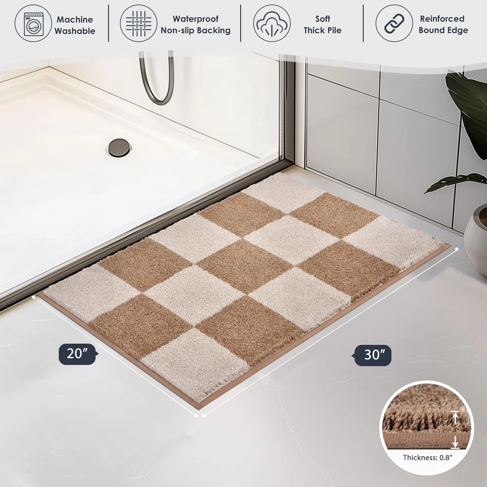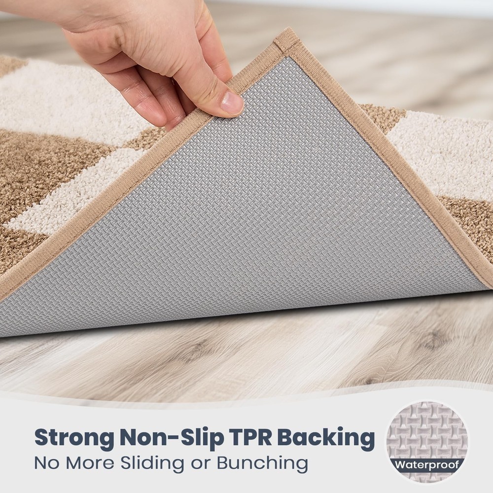 Machine Washable Matting Free Bathroom Rug 20" x 30", Non-Slip Dense Pile Bath Mat, Super Absorbent and Quick-Dry Bath Rug for Shower, Bathtub, and Sink, Beige & Grayish Brown EXCEPTIONAL COMFORT UNDERFOOT: Enjoy the soft, plush feel of bath rug. Designed for comfort, it provides a cozy, comfortable experience with every step. A simple yet effective way to add a touch of relaxation to your bathroom. SUPERIOR ABSORBENCY FOR A DRY BATHROOM: Our bath rug quickly absorbs moisture, keeping your bathroom dry and clean. Whether you’re stepping out of the shower or bath, the rug helps prevent water from pooling on the floor, maintaining a neat and dry environment. NON-SLIP SAFETY FOR PEACE OF MIND: For added safety, our bath rug features a non-slip backing that keeps it securely in place. This design helps prevent slipping, making it a reliable choice for homes with children, pets, or elderly family members. EASY TO CLEAN, ALWAYS FRESH: Our bathroom rug is machine washable for easy maintenance. It dries quickly and resists stains, so you can keep it looking clean and fresh without extra effort. A practical solution for everyday use. DURABLE AND LONG-LASTING: Made with high-quality materials, our bath rug is designed to maintain its softness and absorbency even after repeated washes. It’s a practical and reliable choice that will stand the test of time, continuing to perform well in your bathroom for years to come.