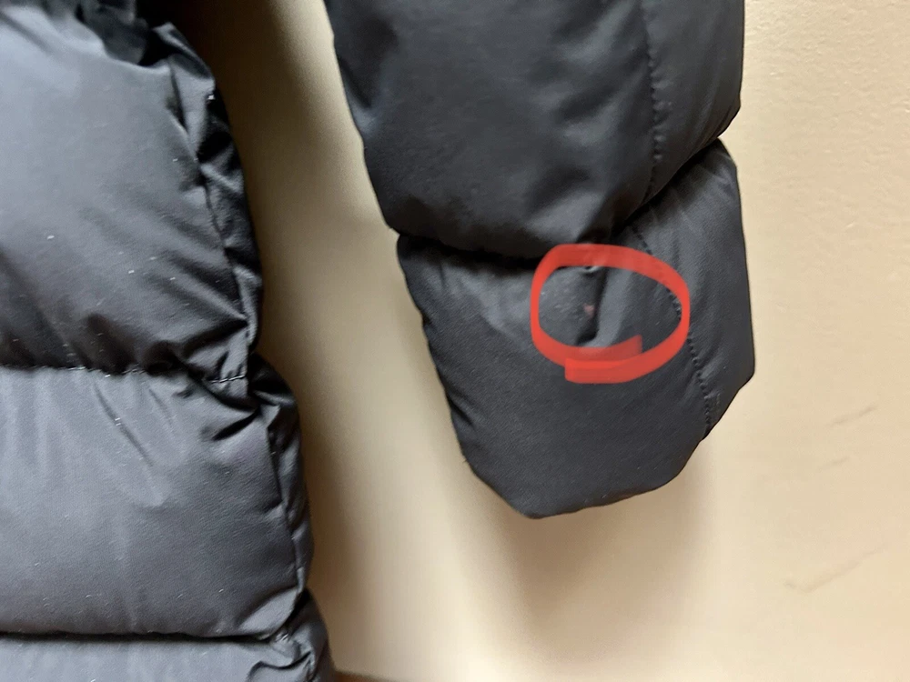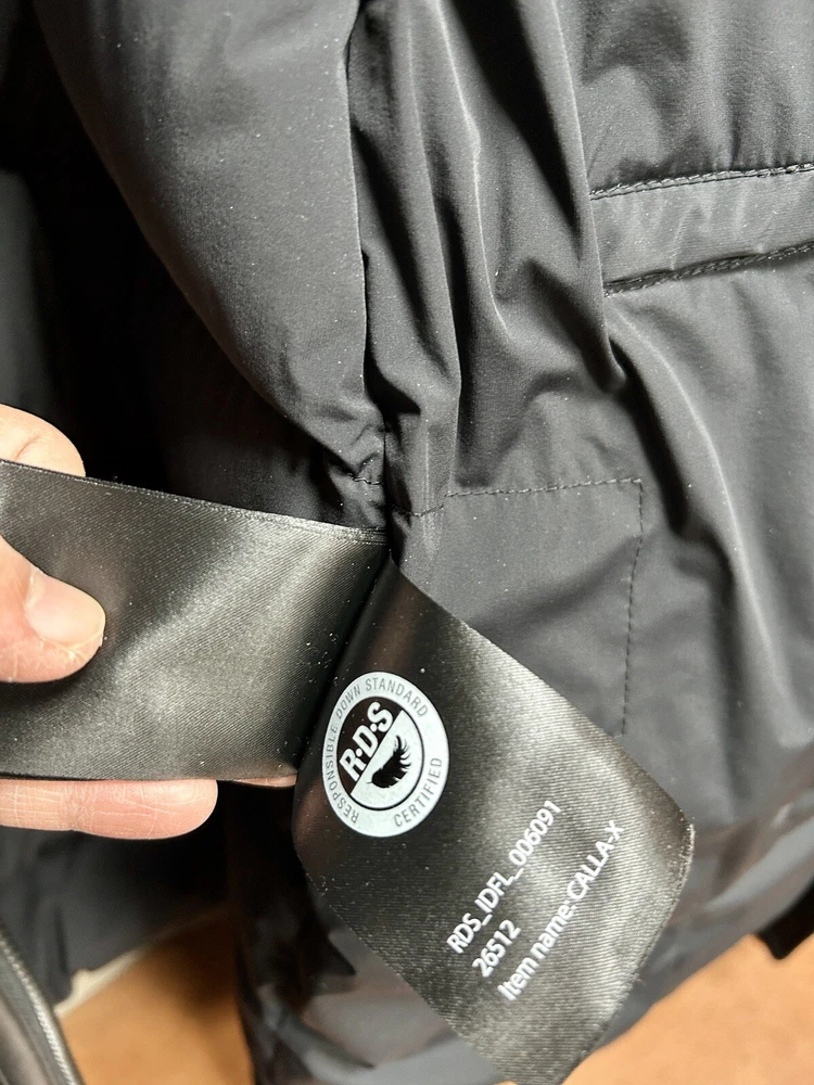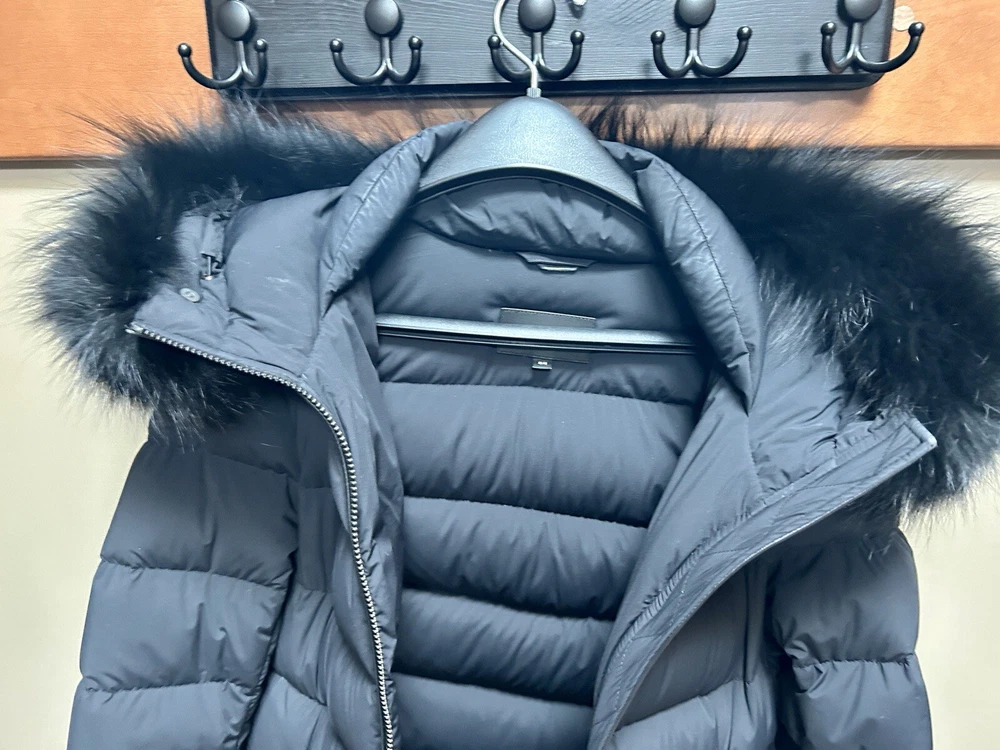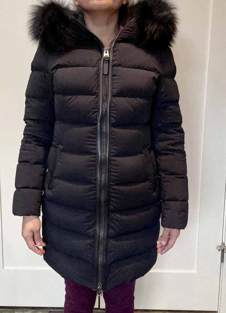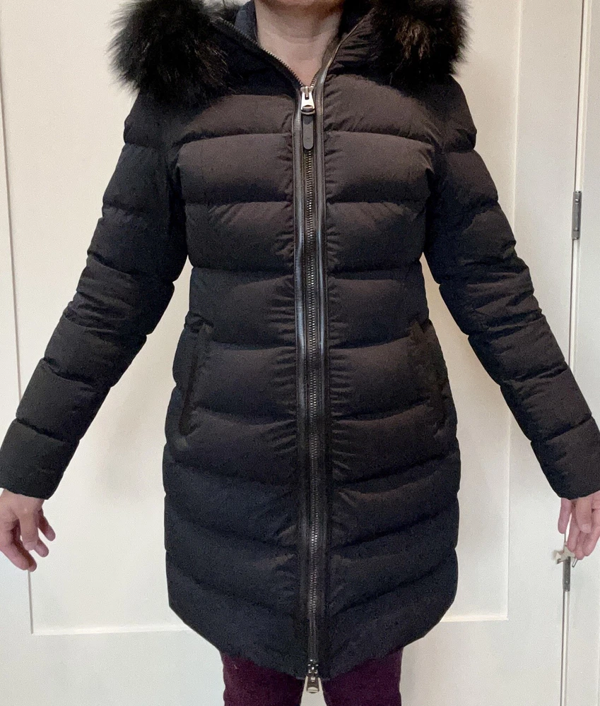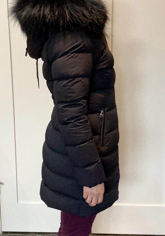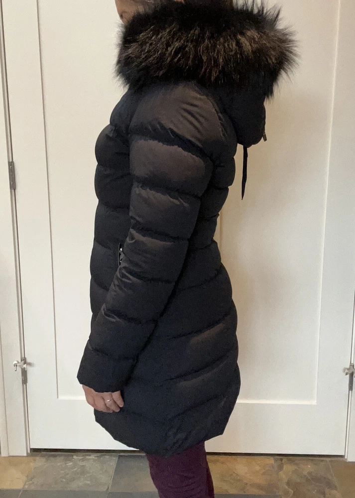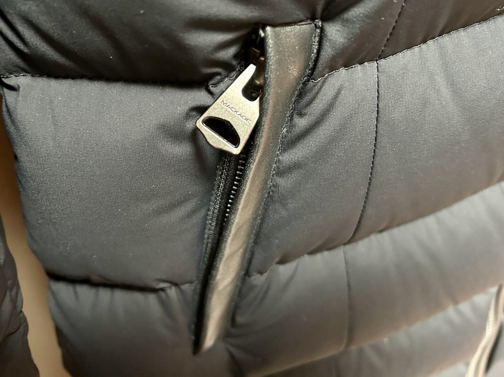 Pre-owned Mackage black Calla-X down jacket, size medium in very good to excellent condition. Please see slight snag (I am tempted to cut it, but will leave to buyer), slight red dot on sleeve along with some dustiness around collar (imagine will be helped with dry cleaning). Stylish and chic jacket. Please note, for reference: model wearing jacket is 5’2” and weighs about 135 pounds.