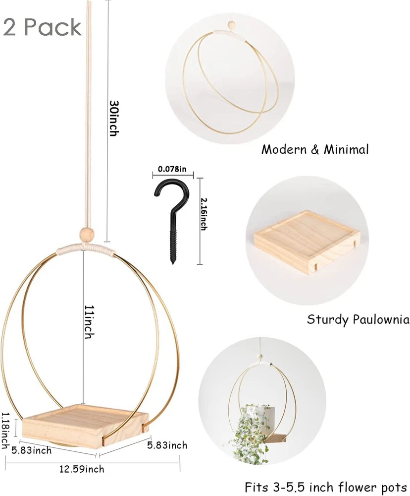 Macrame Plant Hangers with Wood Base -2 Pack Boho Hanging Plant Holder for Indoor Plants Hanging Planters for Wall/Window/Room Decor Gold (Pot & Plant Not Included) Product Details Color: Gold Size: 2 PACK Brand: Dravmola MPN: Does not apply UPC: Does not apply EAN: Does not apply Material: Wood, Metal, Cotton Color: Gold Special Feature: Durable Style: Classic Planter Form: Tray Material: Wood, Metal, Cotton Color: Gold Special Feature: Durable Style: Classic Planter Form: Tray Shape: Round Indoor/Outdoor Usage: Indoor Mounting Type: Wall Mount Plant or Animal Product Type: Succulent; Herb; Flower Product Dimensions: 5.83"D x 12.59"W x 40"H Brand: Dravmola Capacity: 5 Pounds Number of Pieces: 2 Pattern: Solid Theme: Natural Boho Decor Finish Type: Powder Coated Item Weight: 1.2 Kilograms Size: 2 PACK Item Weight: 2.64 pounds Manufacturer: Dravmola Country of Origin: China Date First Available: December 20, 2022 MATERIAL-The ring is made of iron.The wood base is made of the pine wood. Strong and durable but light weight(Plants and Planter not included) SIZE-This hanger rope length is about 30inch, ring diameter is about 12.59 inch,wood base length is 5.83 inch.You can adjust the length of the rope and the height of the pot according to your needs. SIMPLE AND ELEGANT-This boho plant hanger adds the perfect touch to your any room. This beauty would be gracing your home or balcony garden, or brightening up an office. Easily add some special to your beautiful cozy home decor, sweet farmhouse decor, or modern minimalist style. A GREAT GIFT FOR PLANTS LOVER-Are you get tired of the same old macrame hanger? Are you looking for that something special? This is one of those gifts that you can give to anyone on any occasion, birthdays, housewarming, anniversaries, Christmas or any other meansful days USAGE-Suitable for flowerpots less than 5.8 inches in diameter.It is also suitable for placing some small items, such as candles, aromatherapy, vases and other decorations. Since using the hanging pots, children and pets can no longer mess up your potted plants.Perfect for your patio, garden, porch, balcony, home, room or near the window, add a touch of greenery to your space