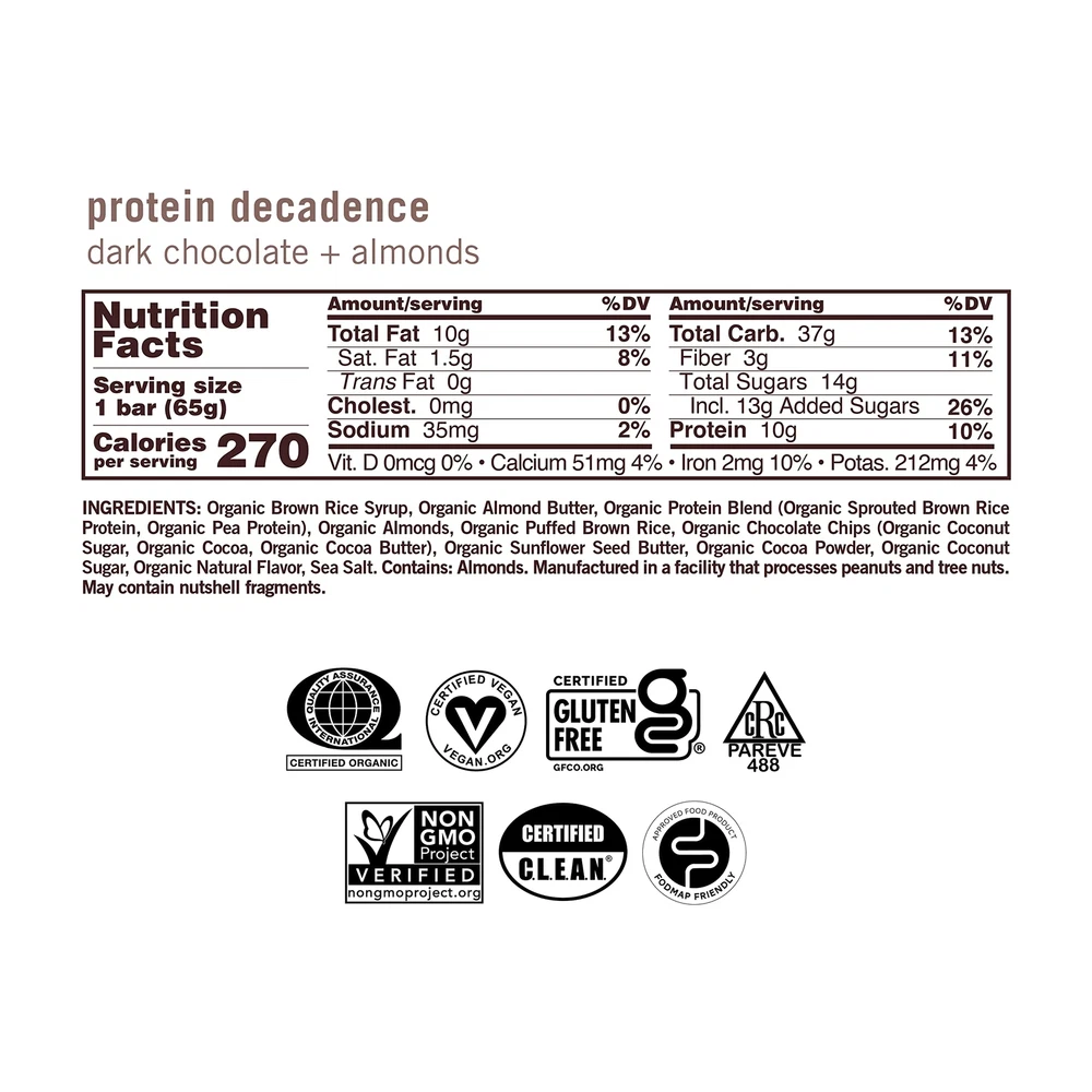 Dark Chocolate + Almonds Protein Bar, Non GMO, Gluten Free, 2.3 Ounces (Pack Of 12) Dark Chocolate + Almonds HEALTHY INDULGENCE: Get all the chocolatey goodness of a brownie in a guilt-free snack! Organic chocolate chips and vegan dark chocolate blend with almonds for a high protein treat. YOUR NEW FAVORITE PROTEIN BAR: Stay energized, satisfied, and fueled with plant-based protein. Whether you enjoy them as a snack bar on-the-go or delicious treat, eating clean never tasted so good! CERTIFICATIONS YOU CAN TRUST: All MacroBars are Certified Organic, Vegan, Gluten-Free, Kosher, Non-GMO, C.L.E.A.N., and Soy-Free. If there were a certification for delicious, we’d have that too! RESPONSIBLY SOURCED: We believe that natural food is healthier for the body and soul. We only work with suppliers who meet our high standards for taste, certifications, and environmental stewardship.