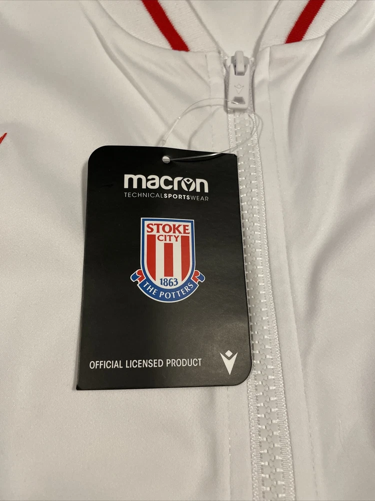 Show off your love for Stoke City with this stylish Macron home walk out jacket. The white and red color scheme is perfect for displaying your team pride, while the unisex adult size ensures a comfortable fit for all fans. This officially licensed jacket is made in Italy and features the Macron brand, known for their high-quality sportswear. Perfect for soccer enthusiasts, this jacket is a must-have for any Stoke City fan. Wear it to the game or out and about to show your support. The product is brand new and in excellent condition, making it a great addition to any fan apparel collection. Get your hands on this unique jacket today!