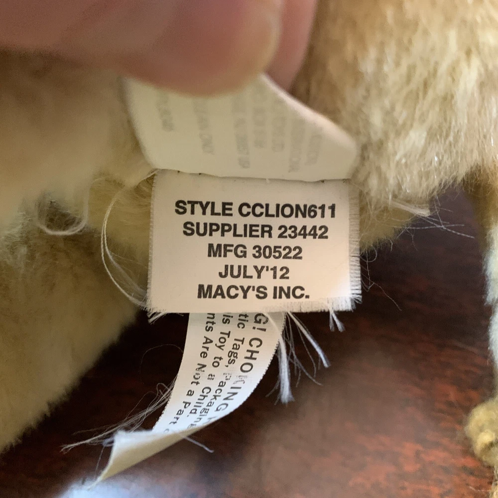 Macy's Charter Club Lion, 9" plush stuffed animal, 2012 approximate dimensions: 9" tall (sitting), 10.5" long, 5" wide, and 5" thick