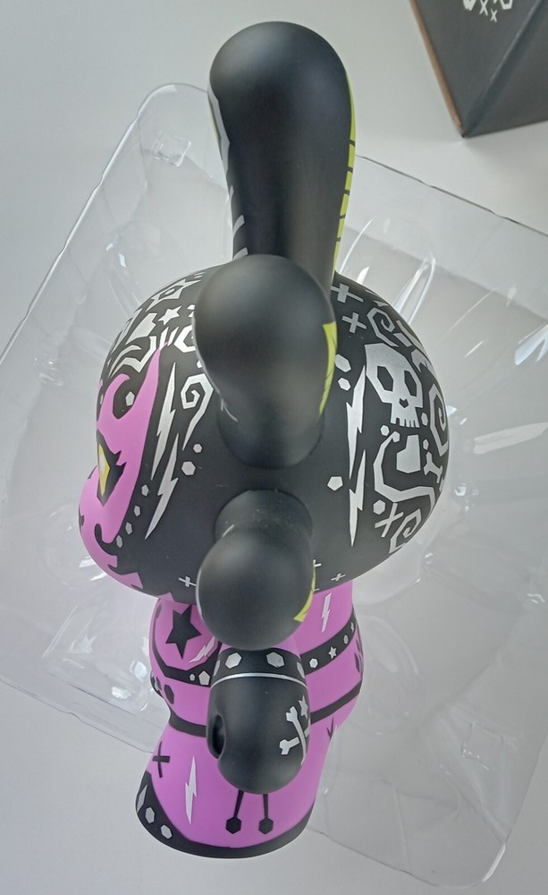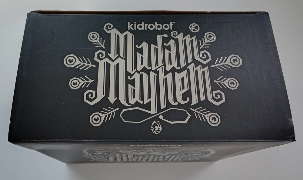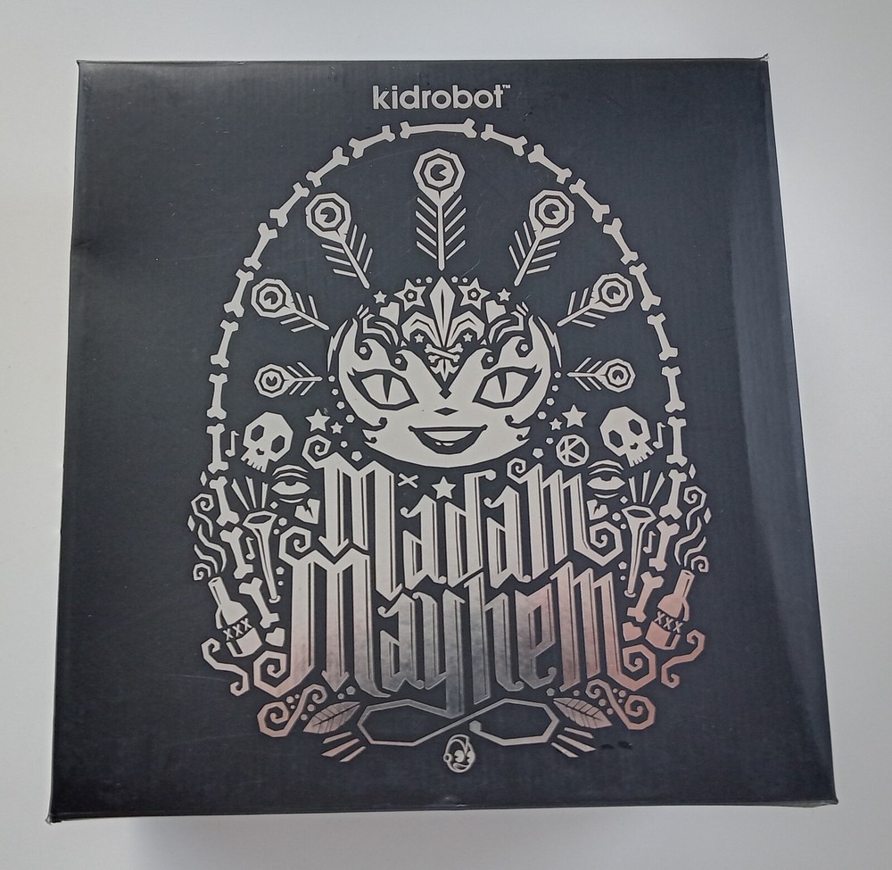 Madam Mayhem Dunny New in Box . Packaging has some creasing and shelf wear. See pics. 8-inch vinyl art figure. 1/6 purple chase variant. Kidrobot 2014.
