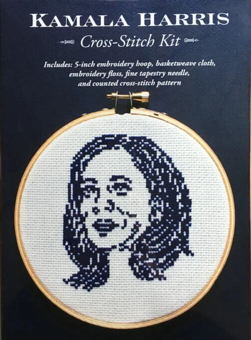 Handmade Materials: zweigart fabric, basketweave fabric, tapestry needle, finishing instructions, embroidery hoop, grid pattern Create your own counted cross-stitch portrait of Kamala Harris. Each kit includes Zweigart cross-stitch fabric, a 5-inch wooden embroidery hoop, one tapestry needle, a grid pattern, 6-strand embroidery floss, and instructions for cross-stitching and finishing the project. The embroidery floss is blue. It takes about 3-6 hours to complete this project, depending on your experience with counted cross-stitch. Please note that this is a COUNTED CROSS-STITCH project. The fabric included in the kit is blank.