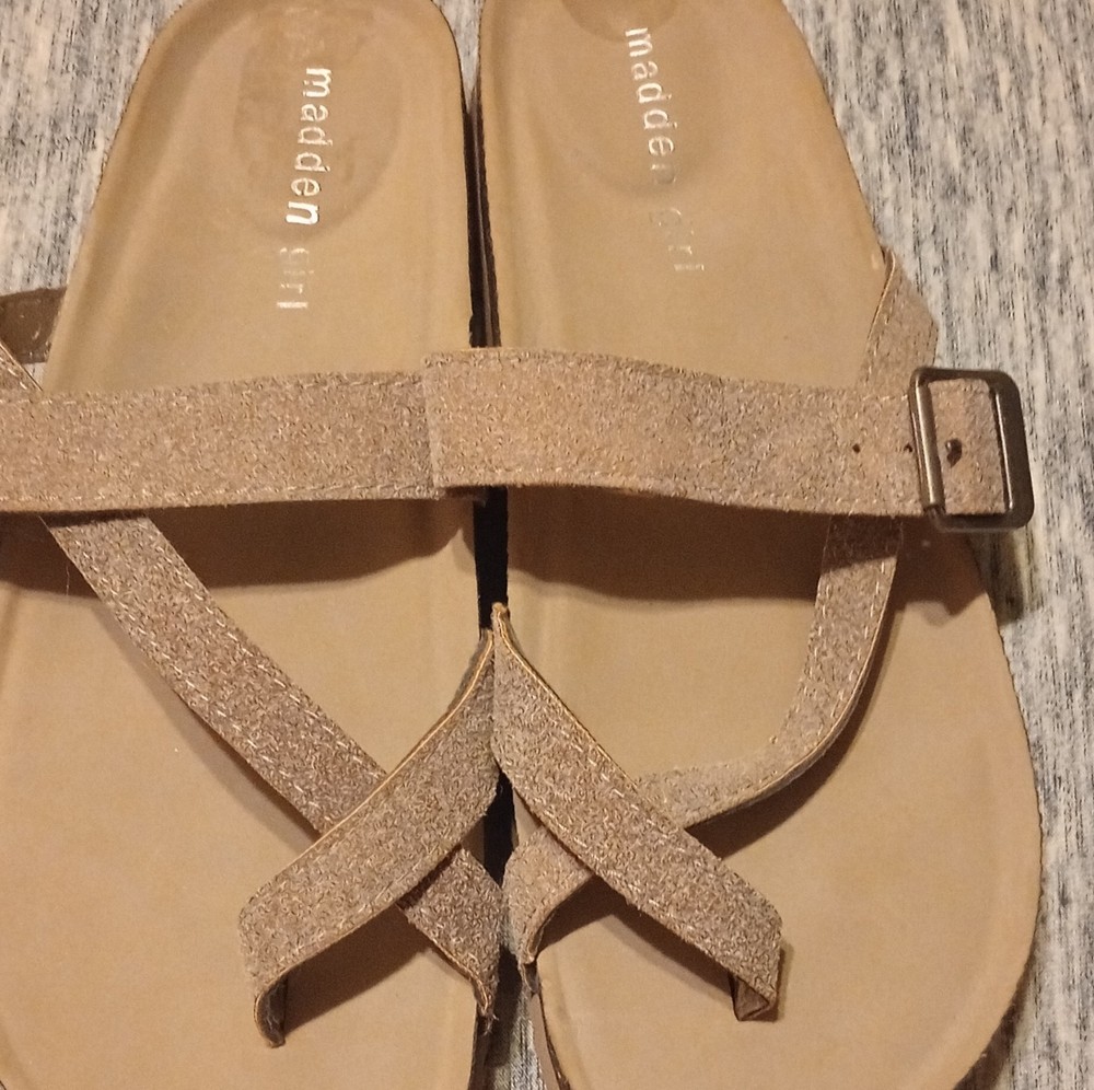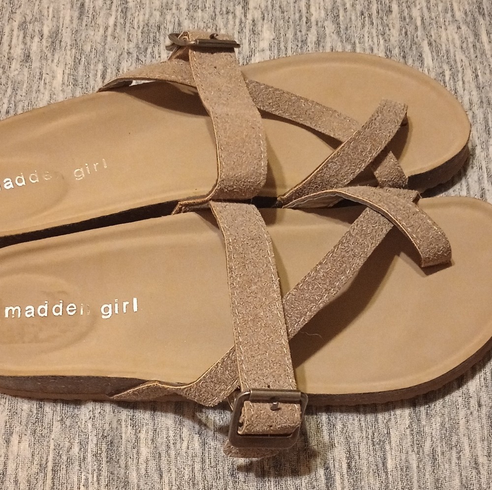 Occasion: Casual Type: Sandal Closure: Buckle Color: Beige Upper Material: Synthetic Brand: madden girl US Shoe Size: 9 Heel Style: Flat Features: Straps Style: Strappy Department: Women Season: Summer Pattern: Solid