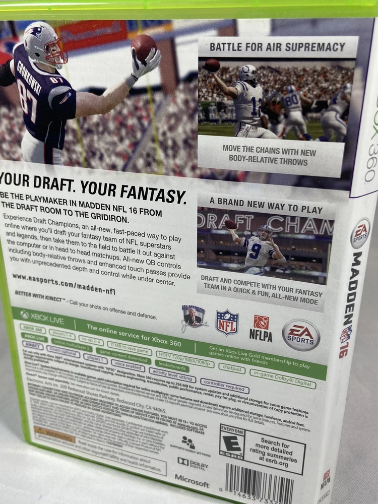 Game Name:Madden NFL 16Features:Take control of receivers and battle against defensive backs with three new catching options Start off each drive with new commentary that highlights game trends Join friends for a fantasy draft in the new Draft Champions modeGenre:Sportsgtin13:0014633733792Rating:E-EveryonePublisher:EA SPORTSRelease Year:2015Video Game Series:Madden Nfl SeriesRegion Code:NTSC-U/C (US/Canada)UPC:0014633733792MPN:NAPlatform:Microsoft Xbox 360