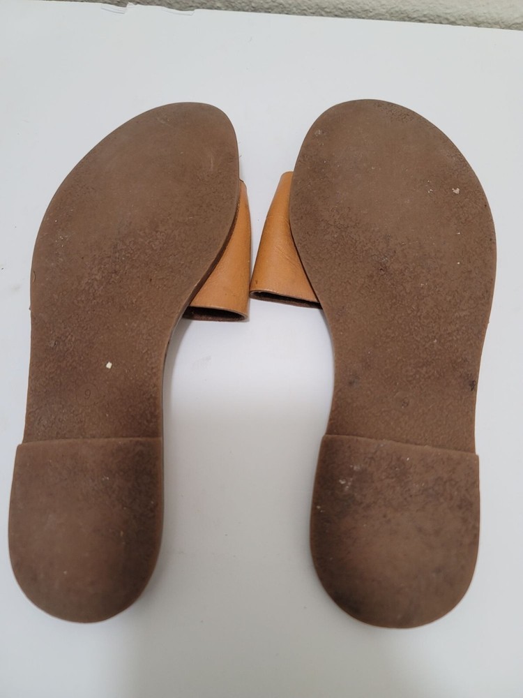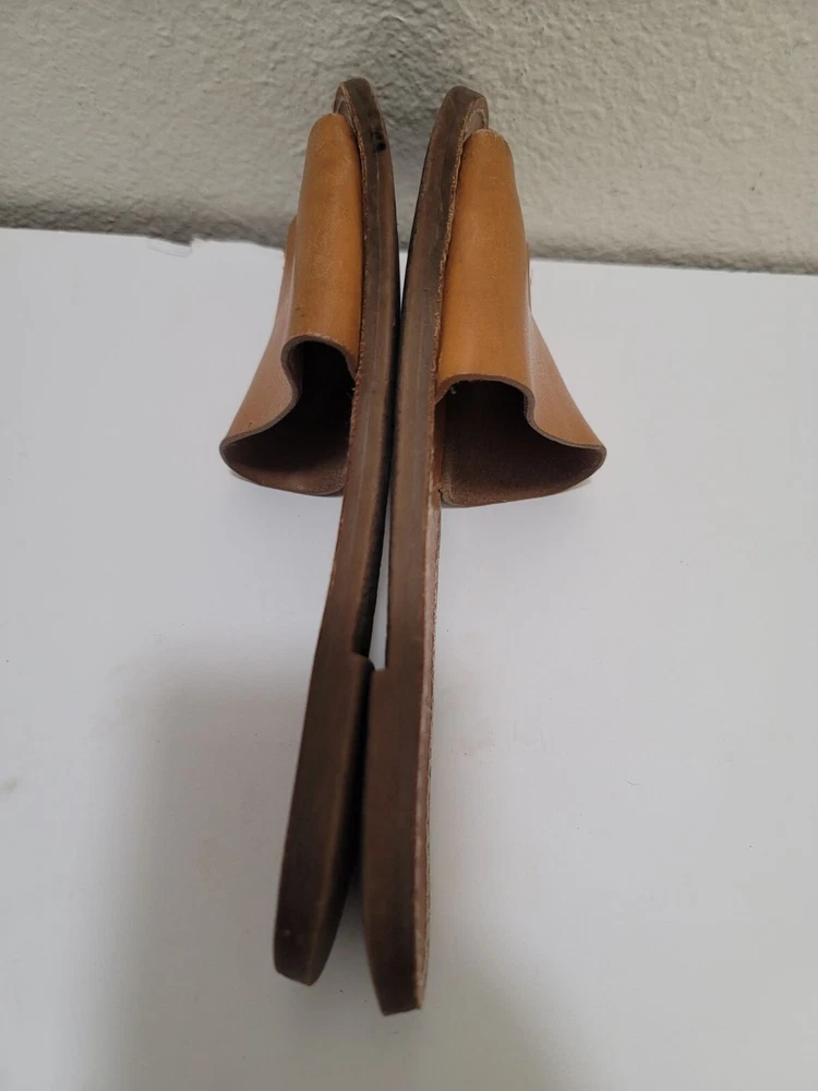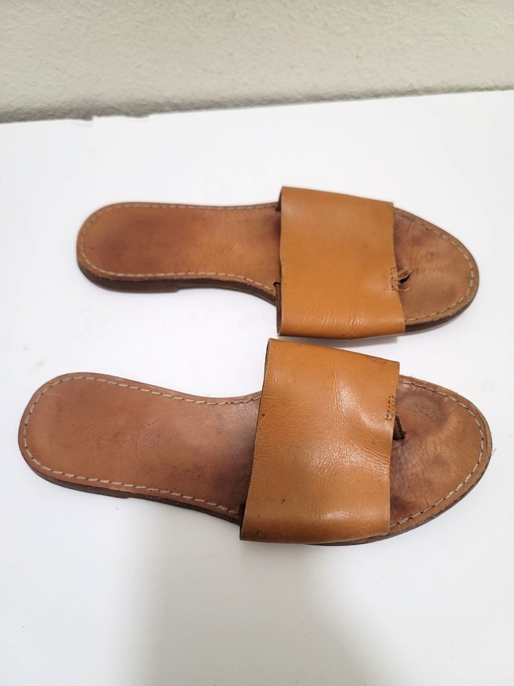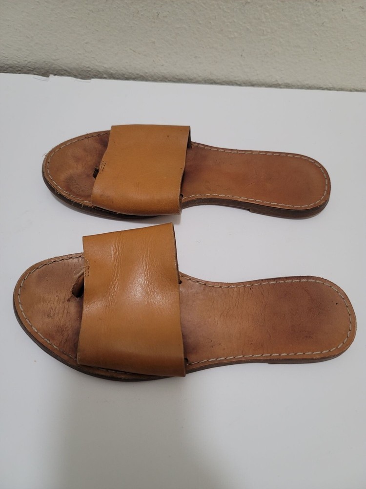 These vintage leather slide sandals provide both style and comfort. Ideal for casual outfits, the handcrafted design showcases quality leather. The minimalist aesthetic complements various styles and occasions, while the durable sole ensures longevity. • Genuine leather construction • Slip-on design • Durable rubber sole • Comfortable footbed • Minimalist style CONDITIONS use, good conditions Visible wear on footbed and some scuffs. see photos for flaws details.