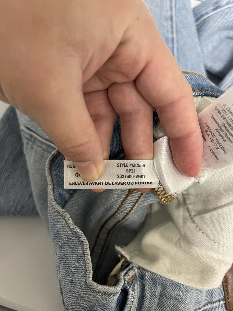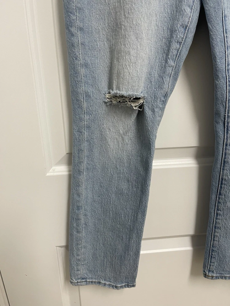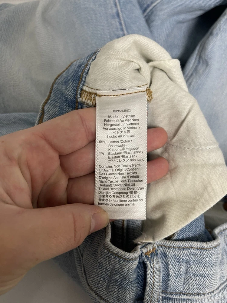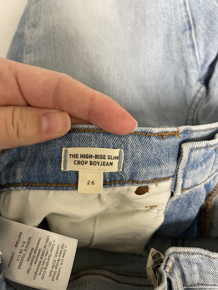 size: 26 color: light wash denim material: cotton and elastane high rise fit slight distressing at the knee slim fit cropped length estimated measurements 15 in waist 10.5 in rise 25 in inseam