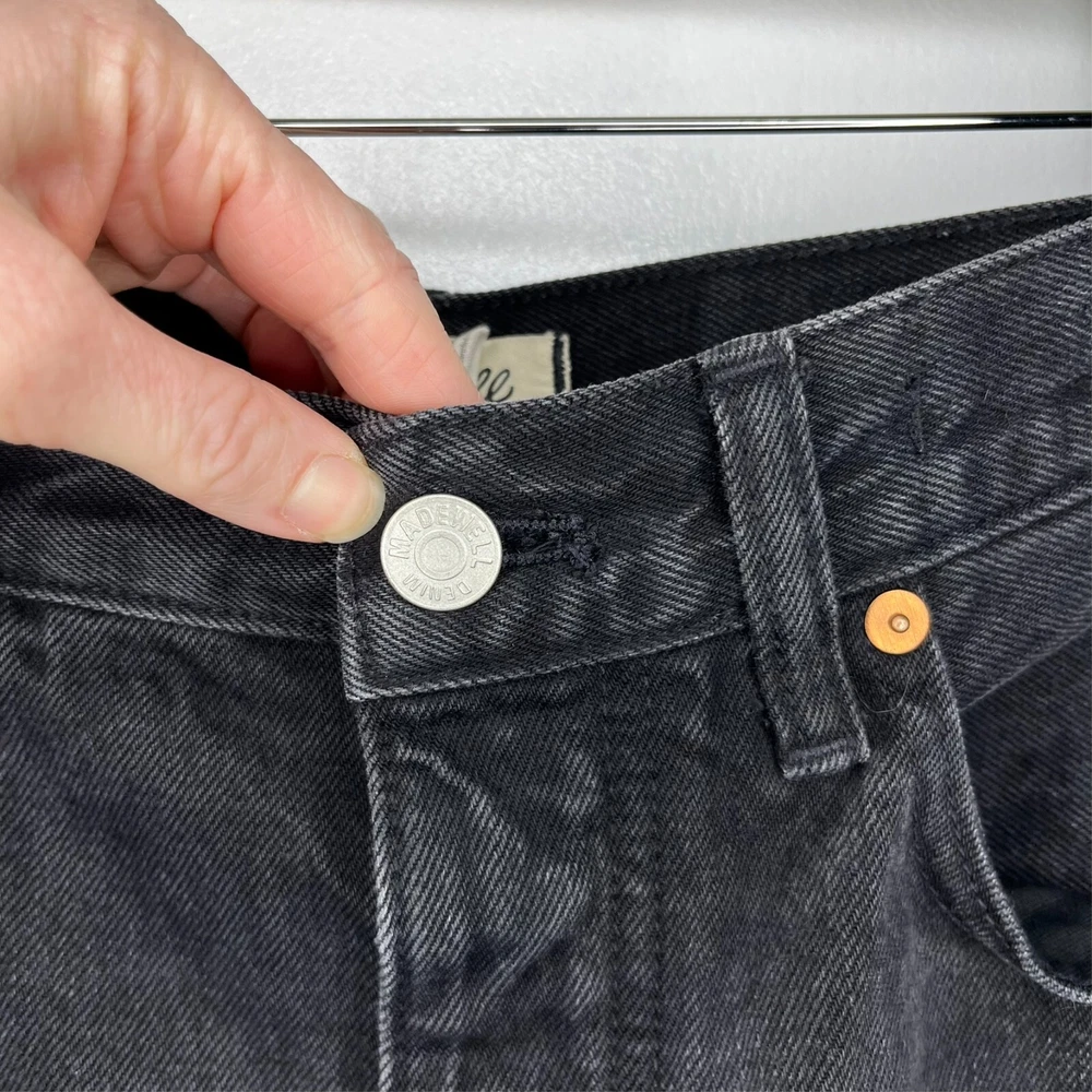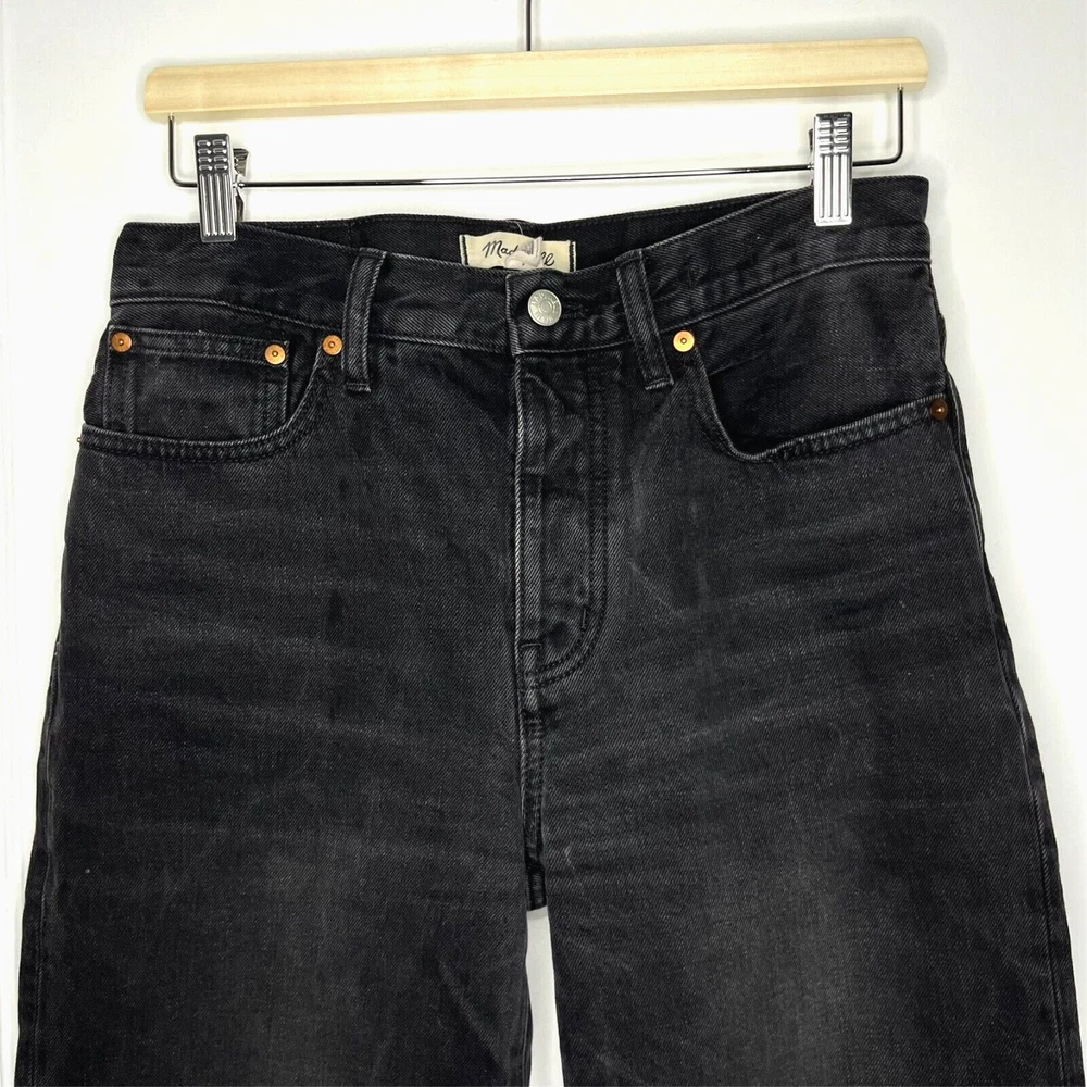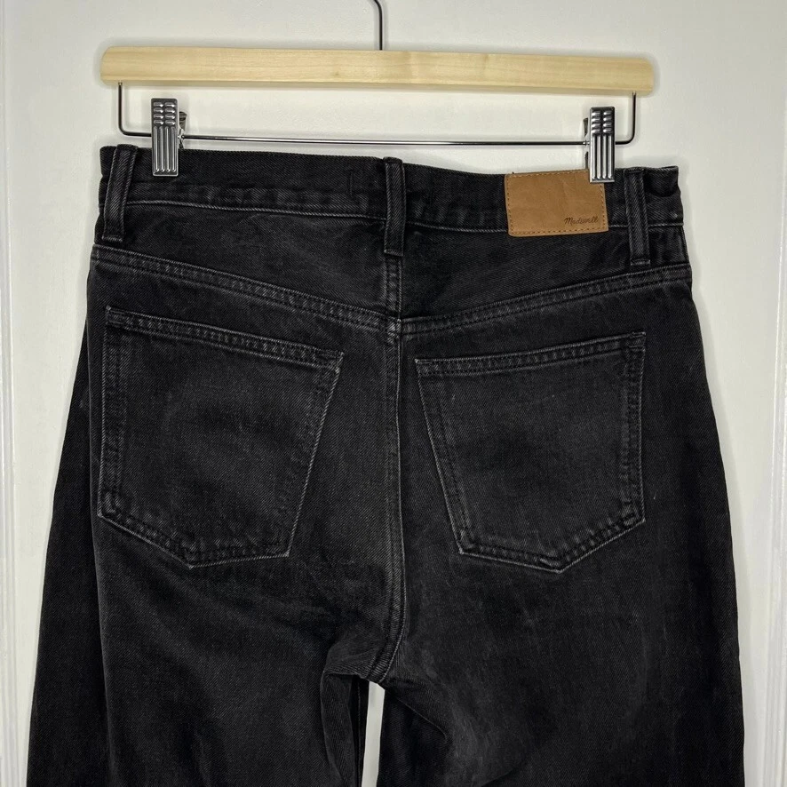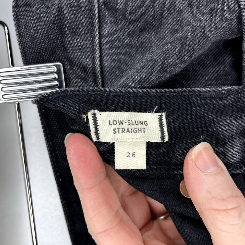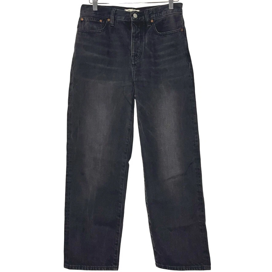 This is the Madewell Low Slung Straight jean in a size 26 and the Kent Wash faded black color. They are made of a loose woven 100% cotton denim fabric, feature a button fly and looser fit. Great Used Condition - Only flaw is 2 small stains near the right pocket (pictured). No other stains, holes, tears or other notable issues. Approximate Measurements: Length: 39" Rise: 11" Waist: 30" Inseam: 28" Leg Opening: 16" If you have any other questions or would like any additional measurements, please ask!