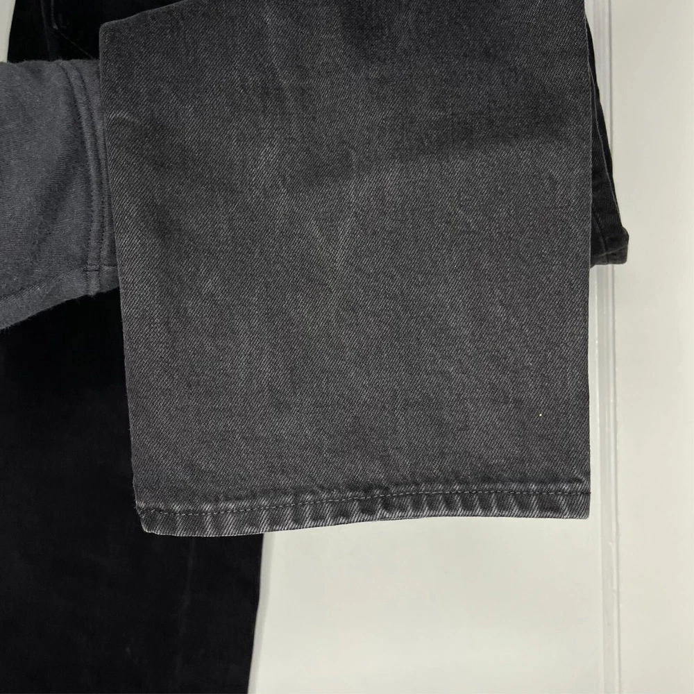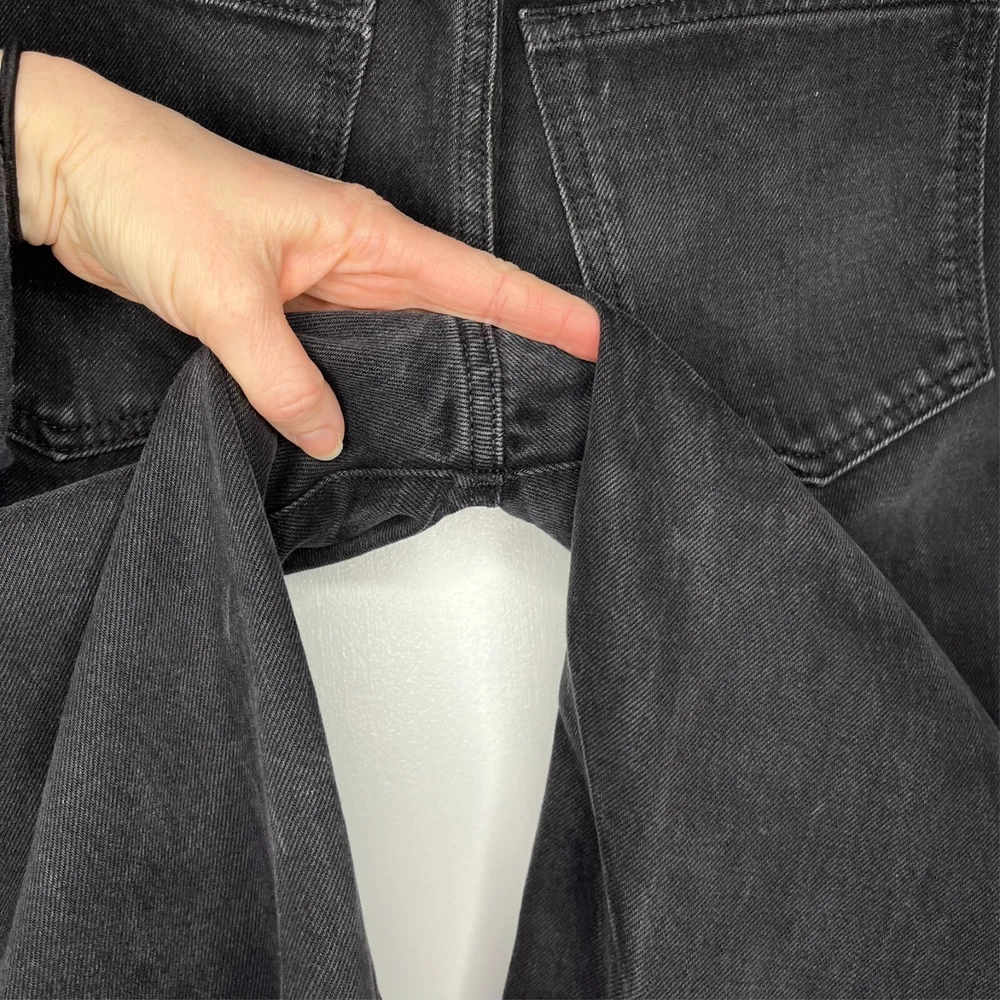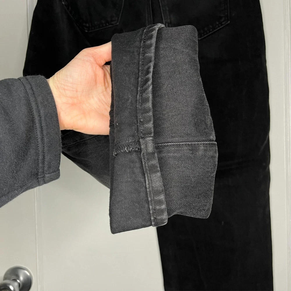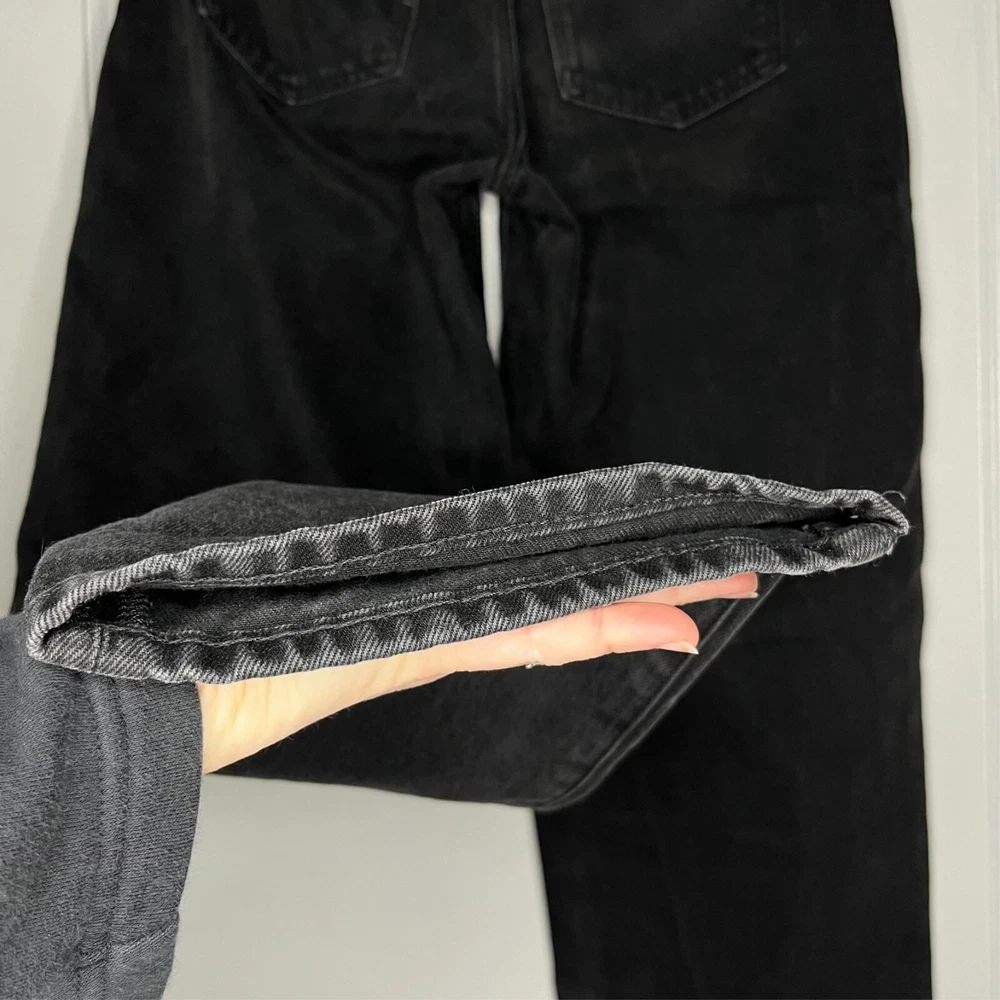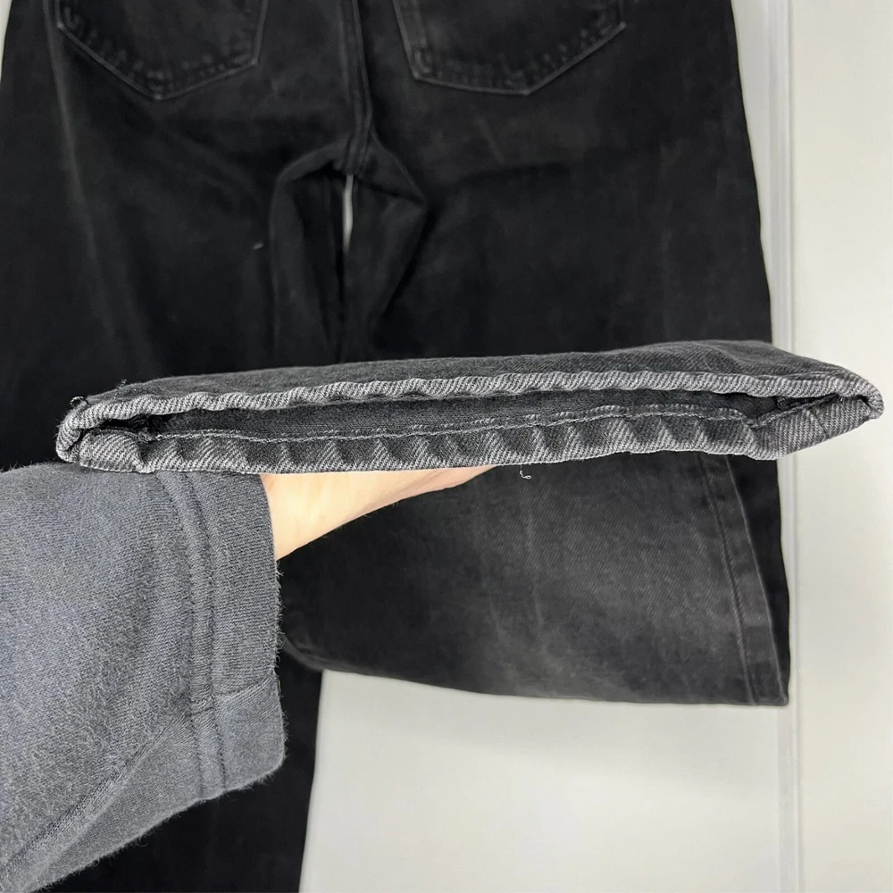 This is the Madewell Low Slung Straight jean in a size 26 and the Kent Wash faded black color. They are made of a loose woven 100% cotton denim fabric, feature a button fly and looser fit. Great Used Condition - Only flaw is 2 small stains near the right pocket (pictured). No other stains, holes, tears or other notable issues. Approximate Measurements: Length: 39" Rise: 11" Waist: 30" Inseam: 28" Leg Opening: 16" If you have any other questions or would like any additional measurements, please ask!