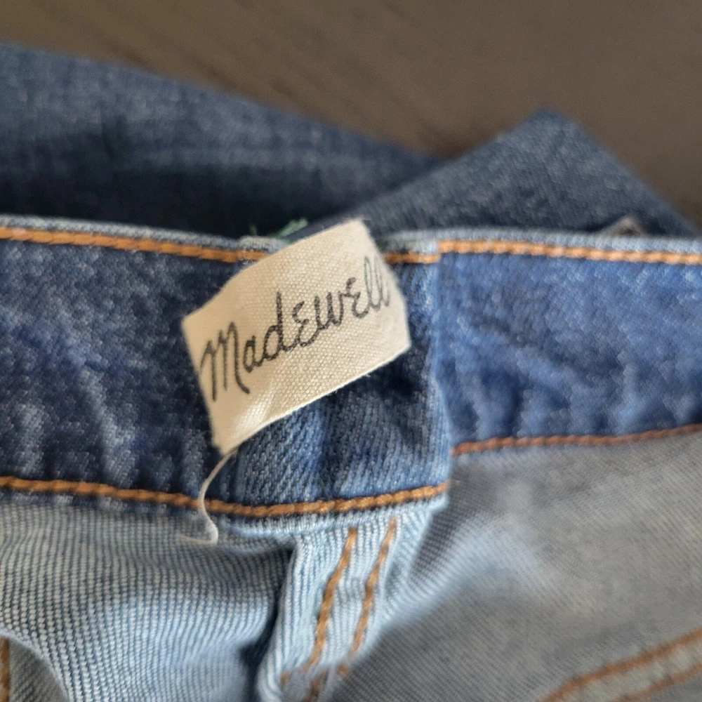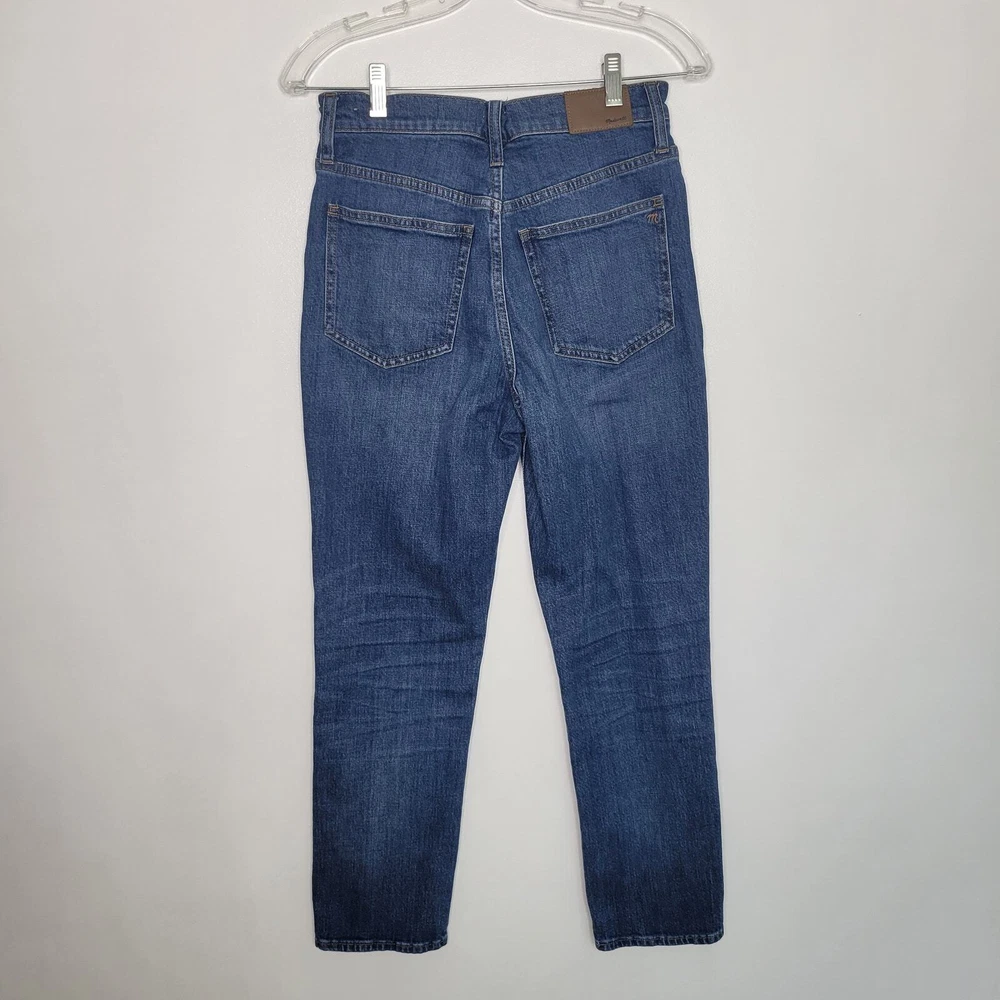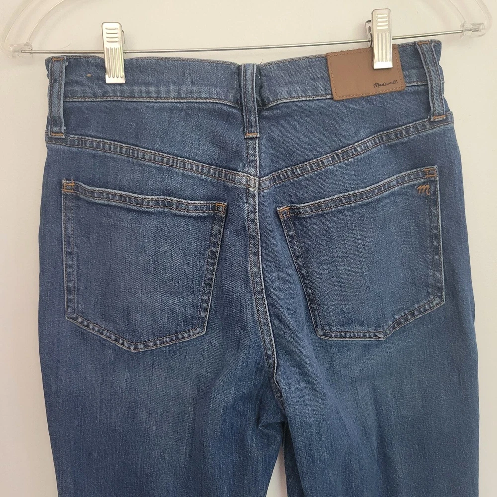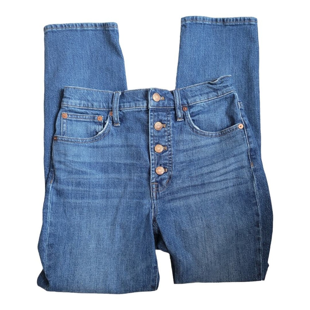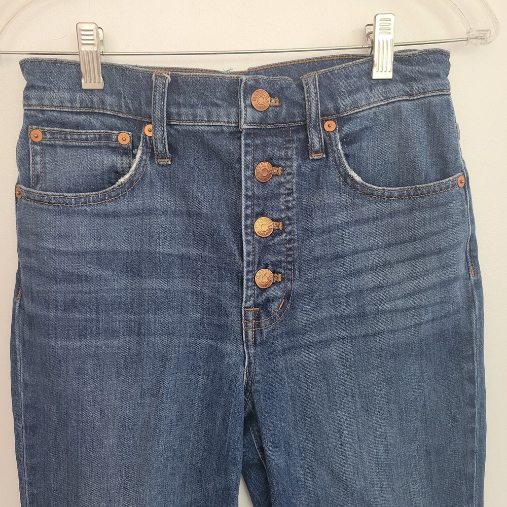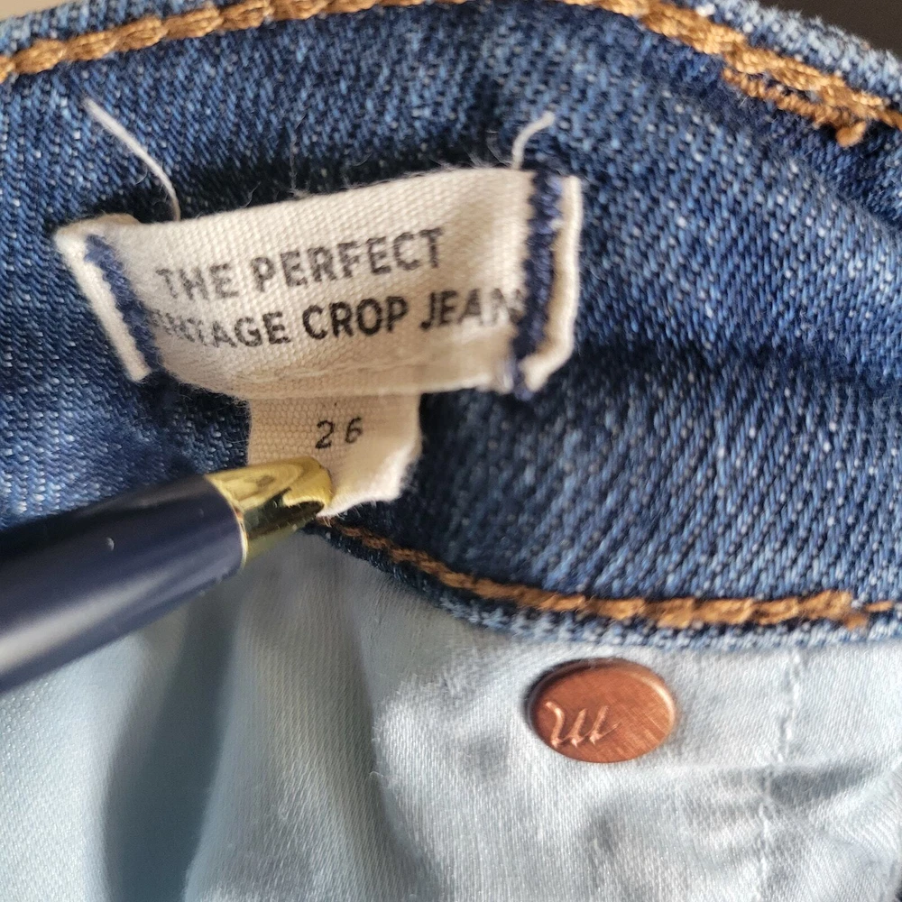 Madewell The Perfect Vintage Crop denim jean Size 26 98% cotton/2% elastane Machine wash AF693 High rise/high waisted Button fly Belt loops 5-pocket styling Cropped length Barnsdale blue wash Moderate stretch Approx. lay-flat measurements: Waist: ~13.25" Rise: ~11" Inseam: ~26" Excellent pre-owned condition. Madewell tag hanging on one side but no other notable flaws/signs of wear